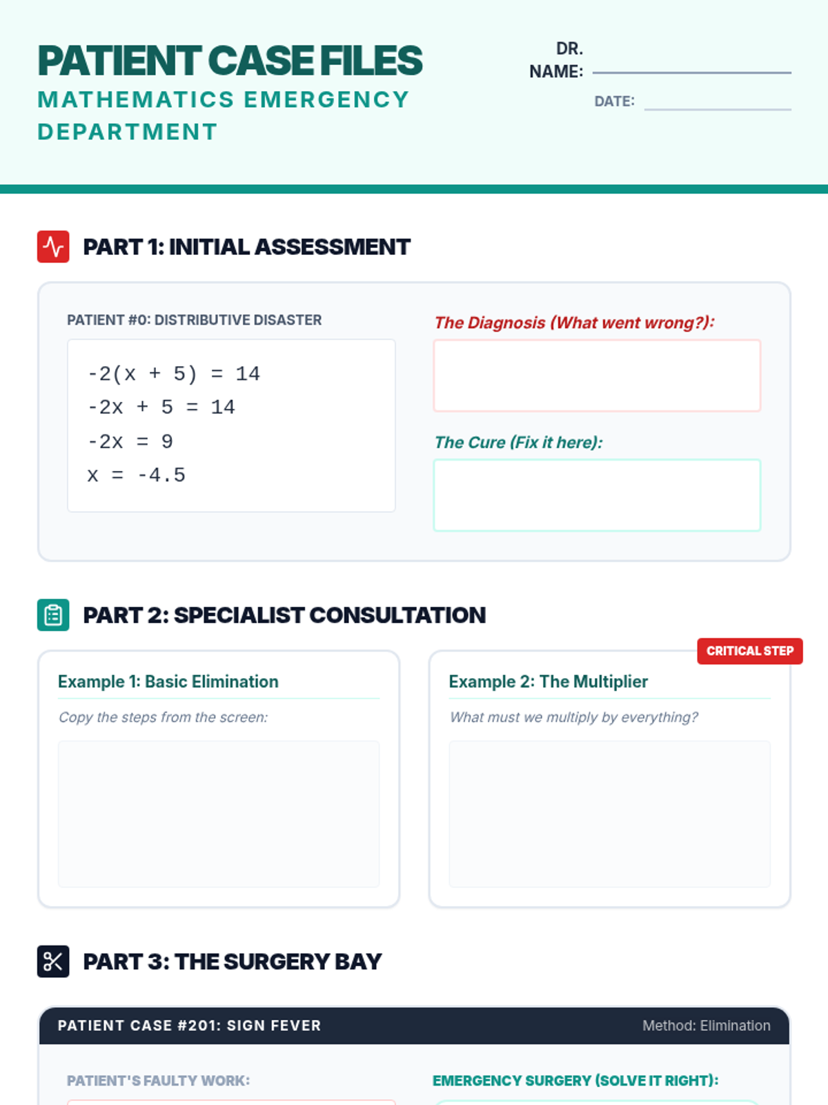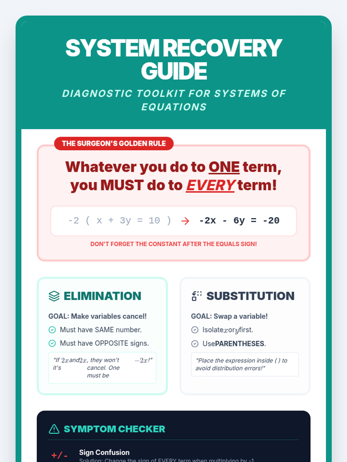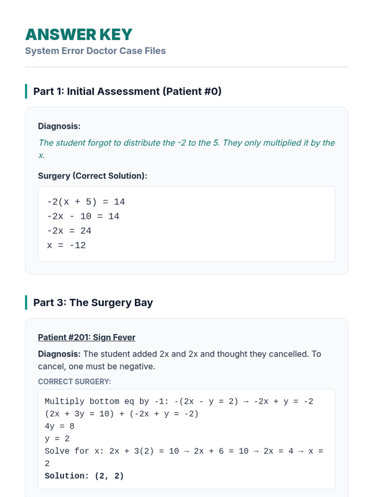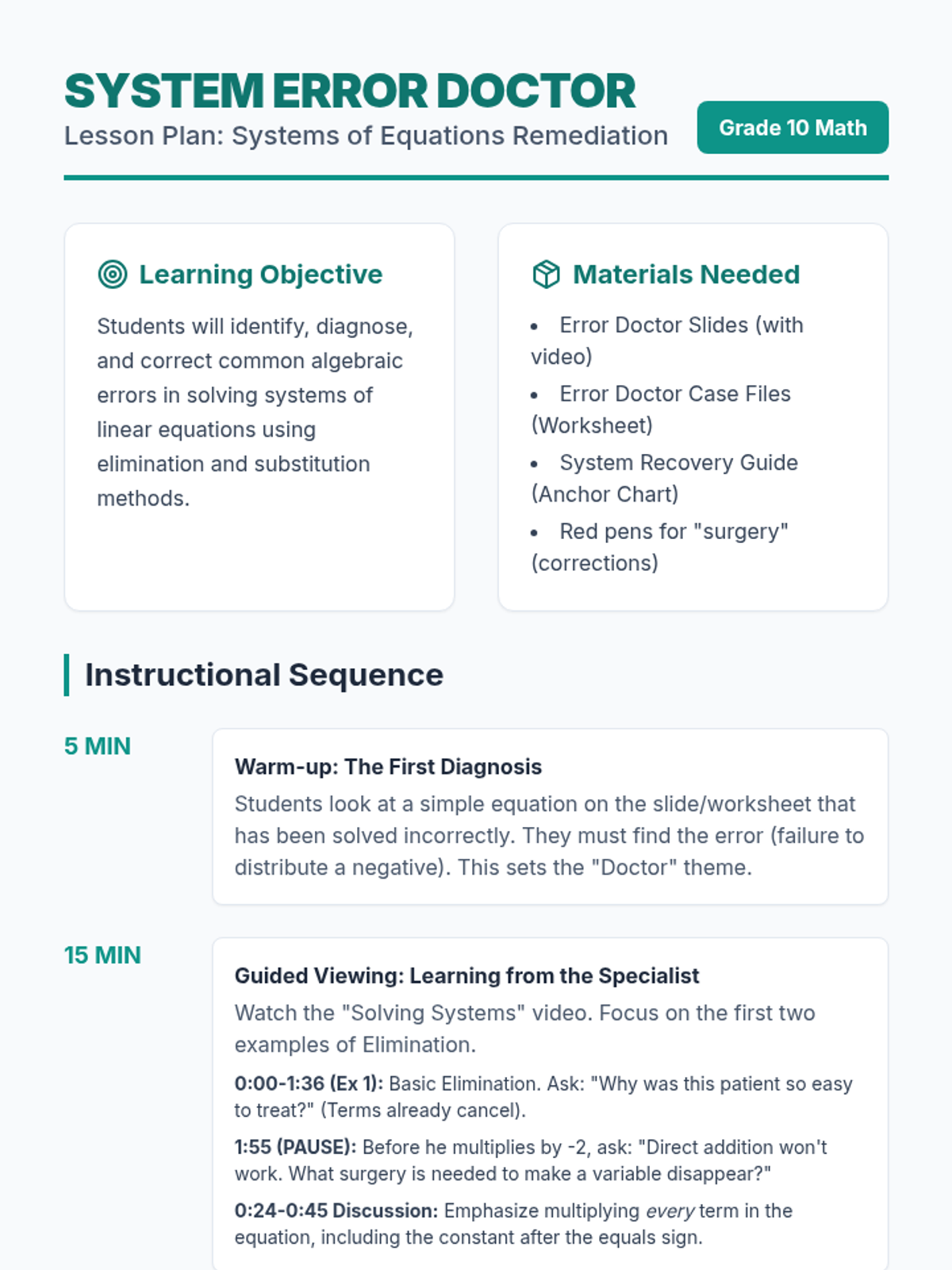 A math remediation lesson focused on identifying, diagnosing, and fixing common errors in solving systems of equations using elimination and substitution.
