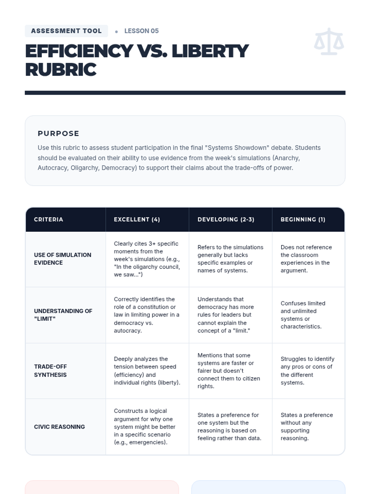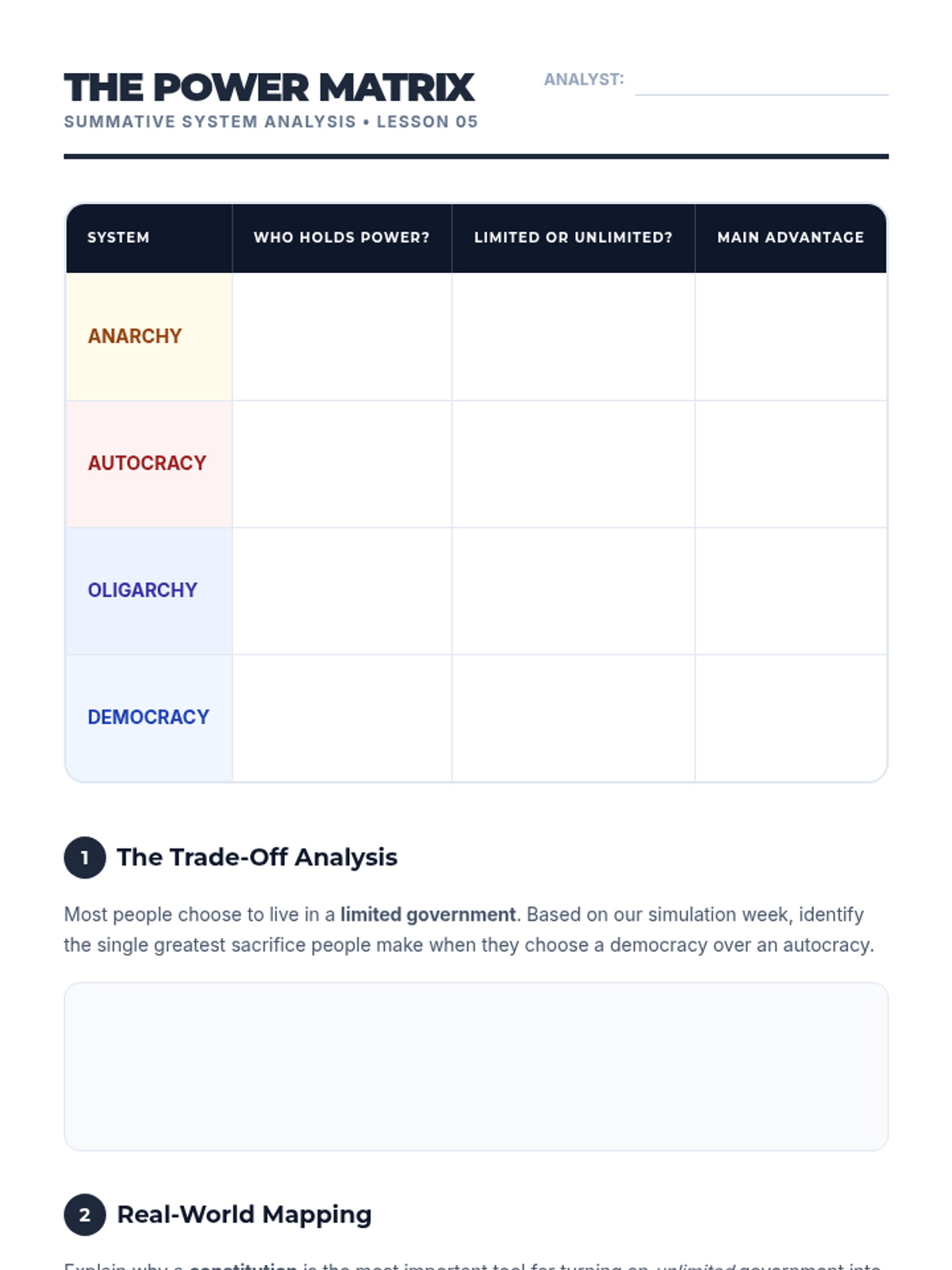 A final synthesis where students compare all government models experienced, categorizing them as limited or unlimited and debating their efficiency versus liberty.