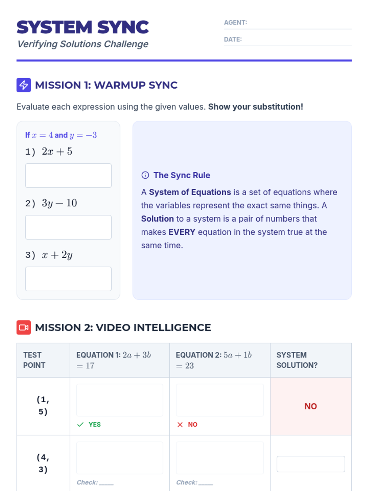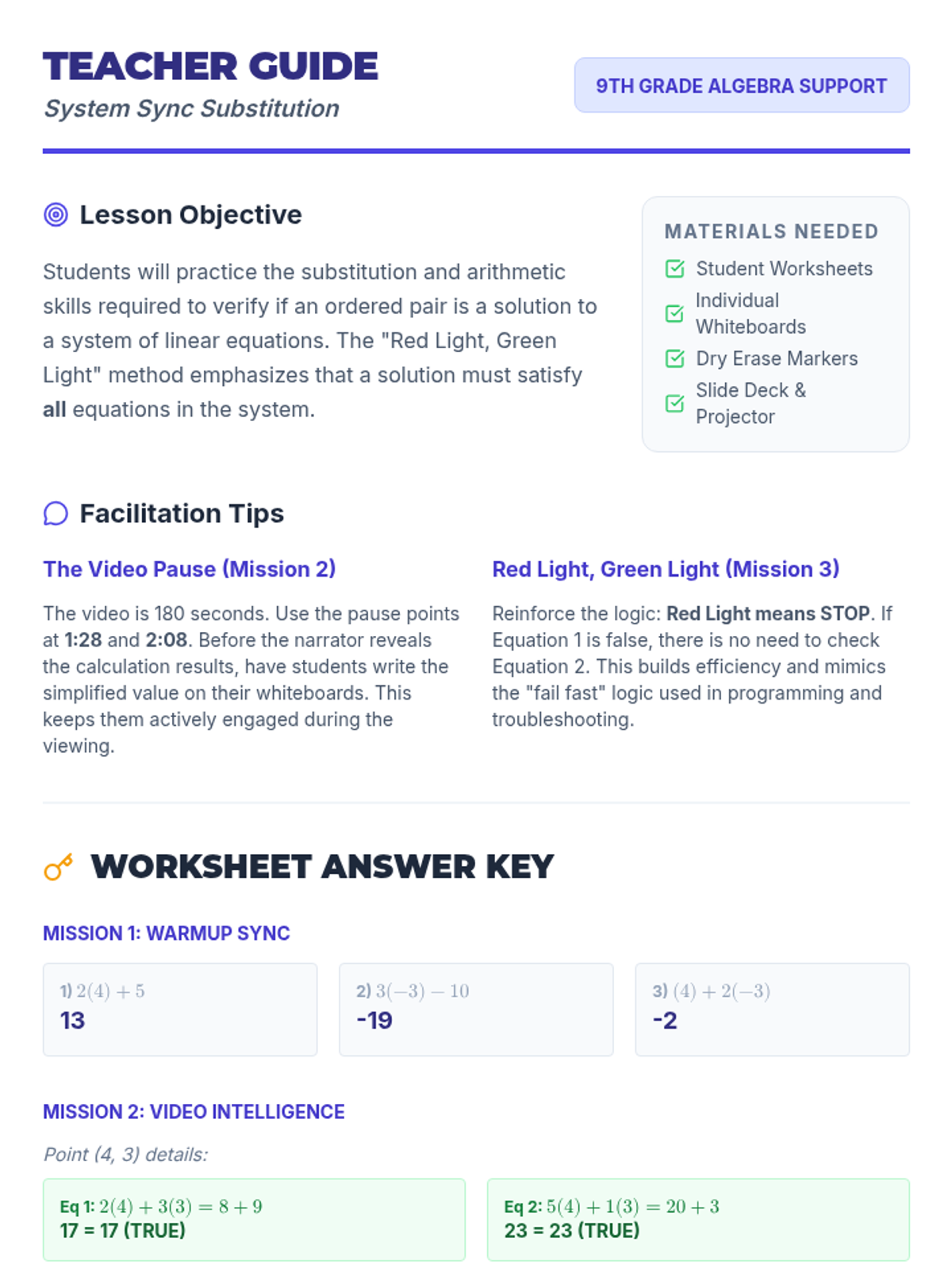 A support-focused lesson on verifying solutions to systems of equations using substitution. Features a 'Red Light, Green Light' activity to emphasize the requirement that a solution must satisfy all equations in a system.
