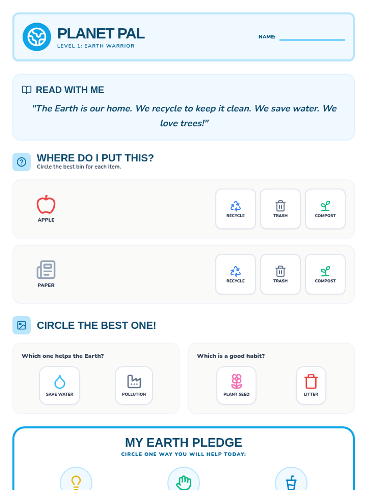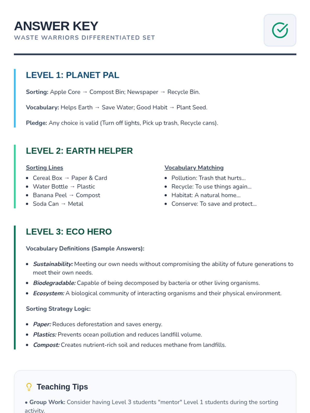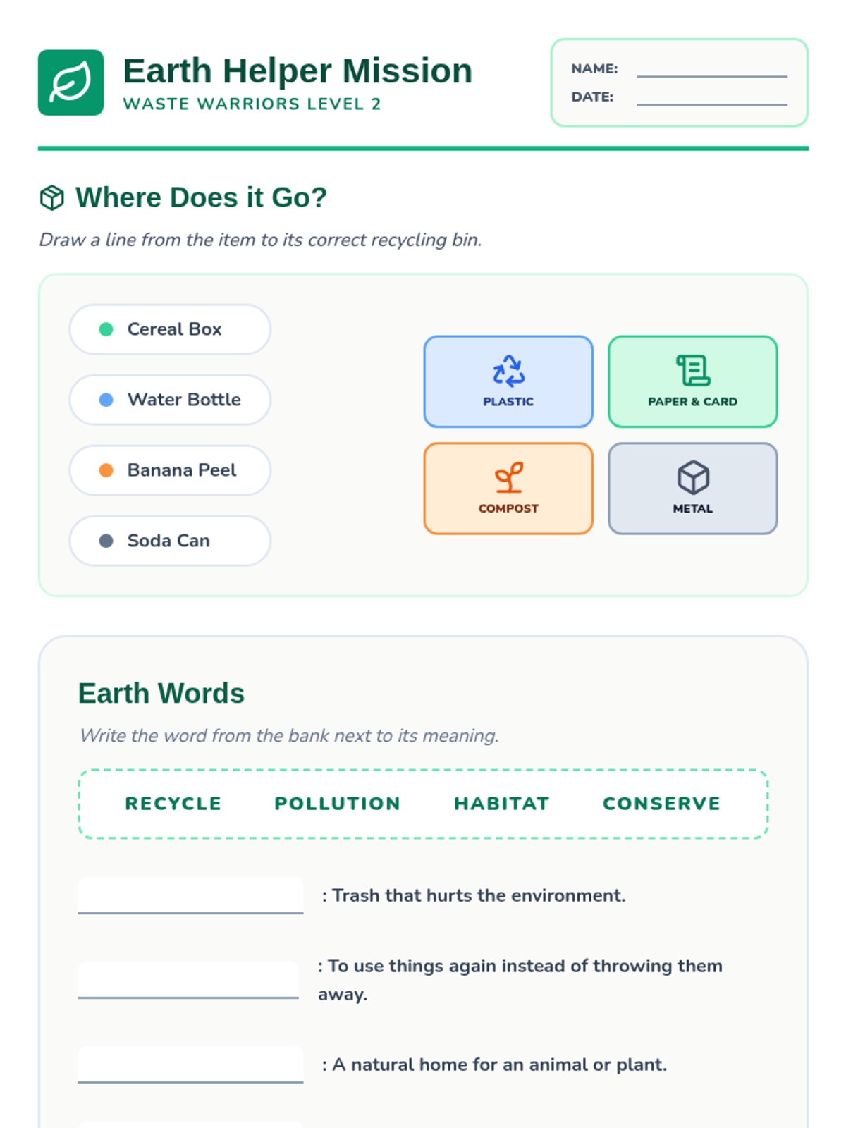 An introductory lesson on waste management and recycling where students practice sorting materials and learning key environmental vocabulary.