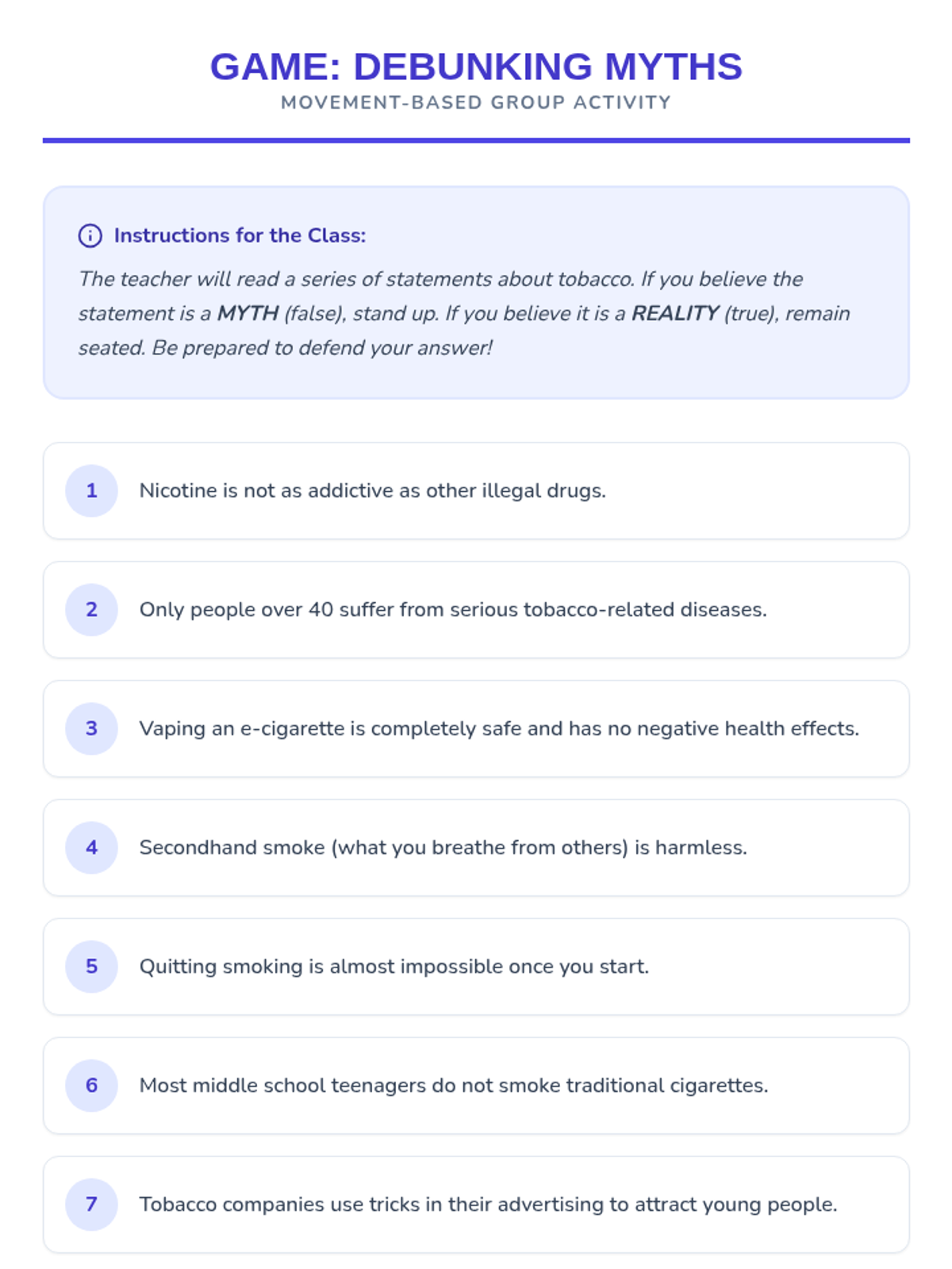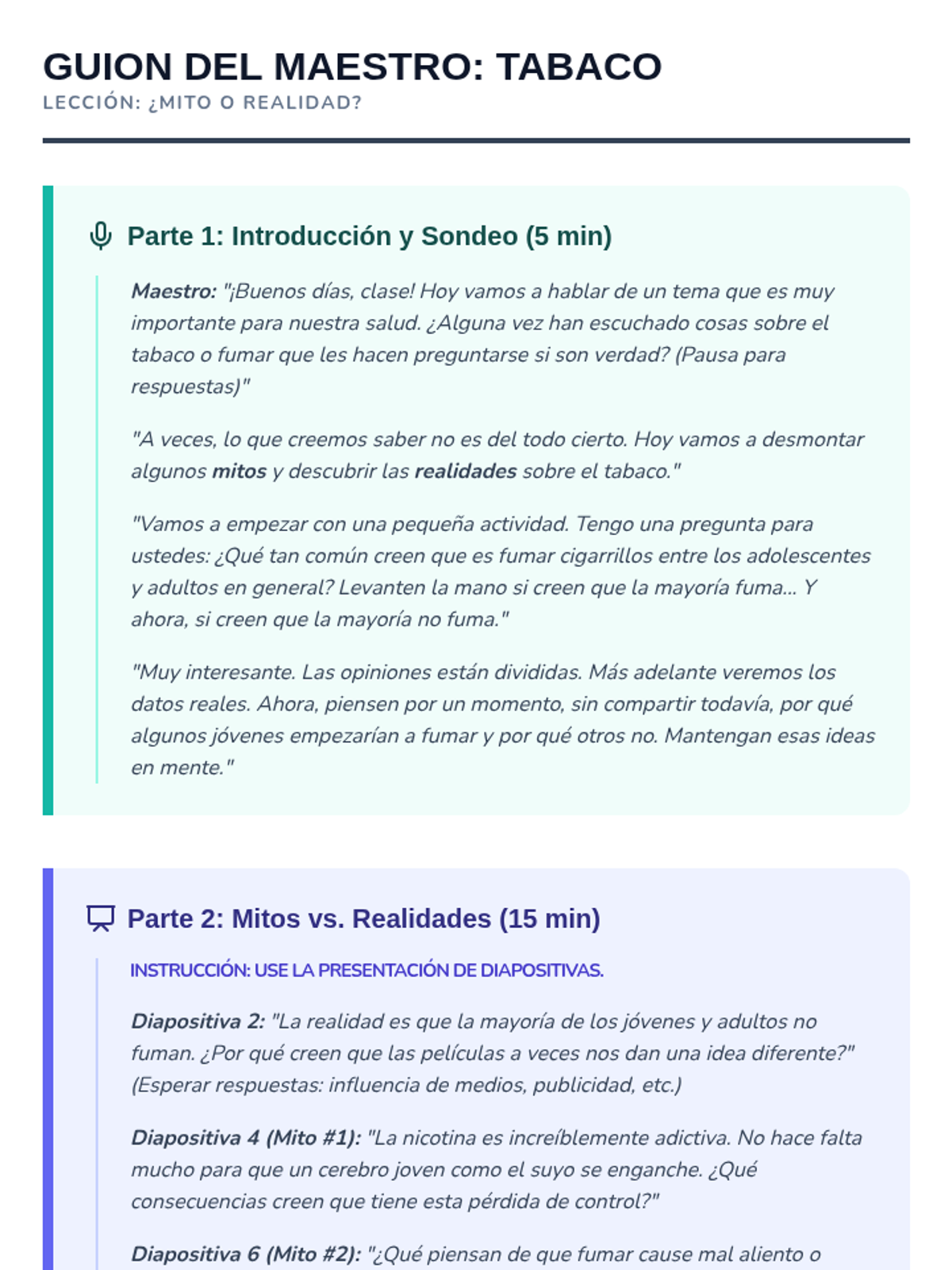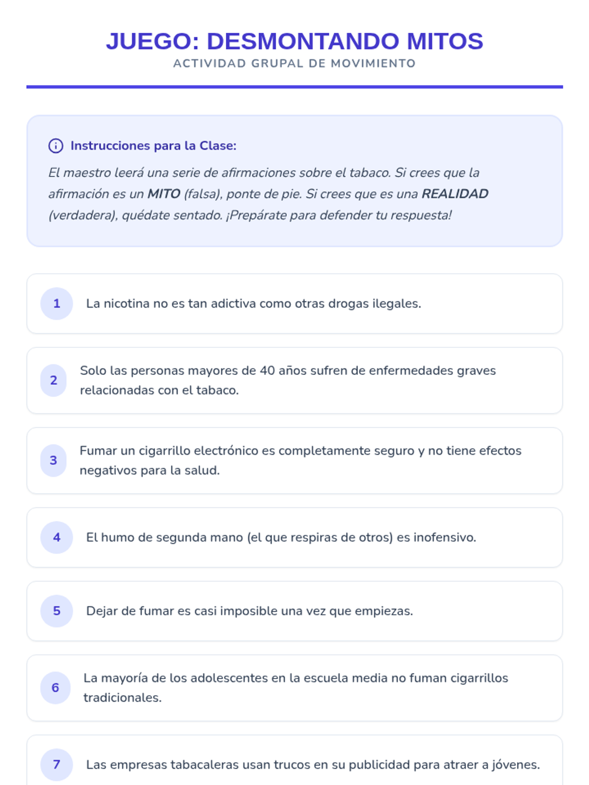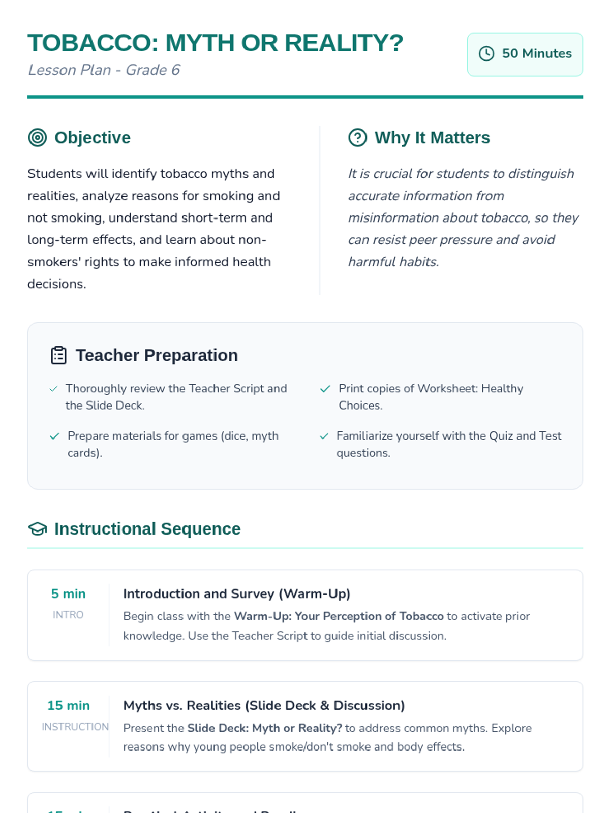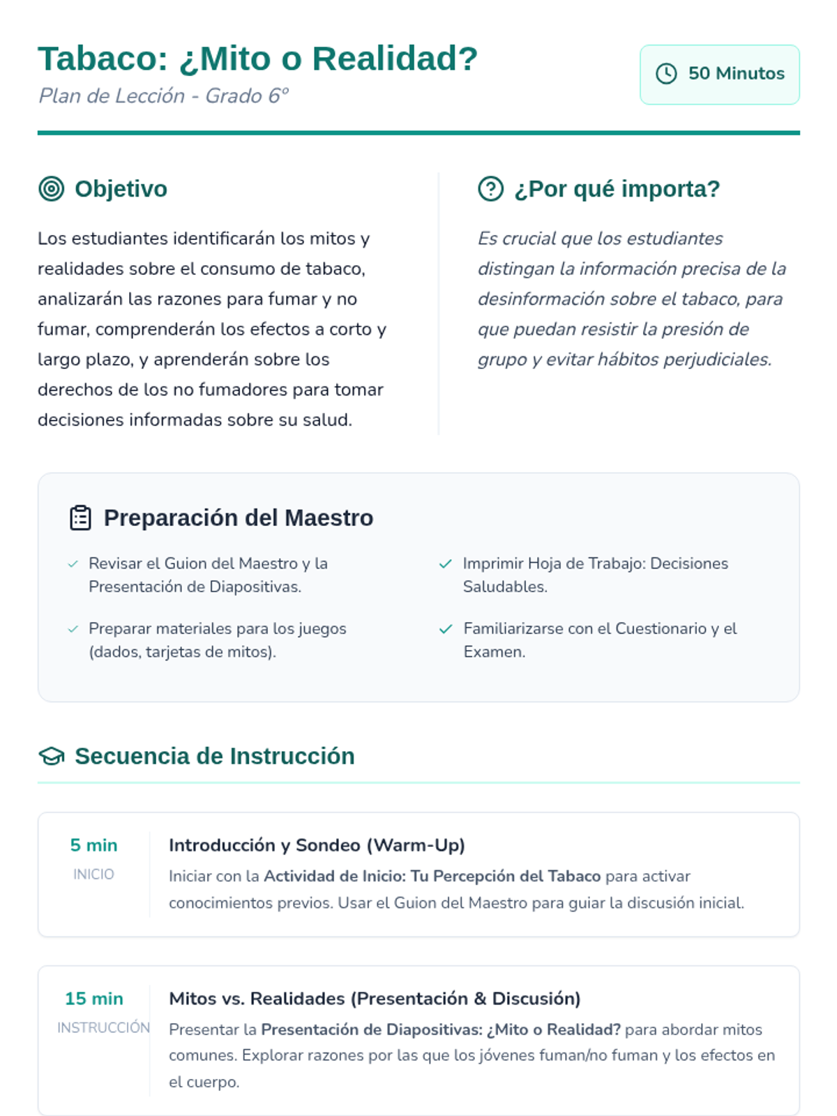 Esta lección de 50 minutos desmiente los mitos comunes sobre el tabaco, empoderando a los estudiantes de 6º grado con información precisa sobre los efectos en la salud y los derechos de los no fumadores. / This 50-minute lesson debunks common tobacco myths, empowering 6th-grade students with accurate information on health effects and non-smokers' rights.