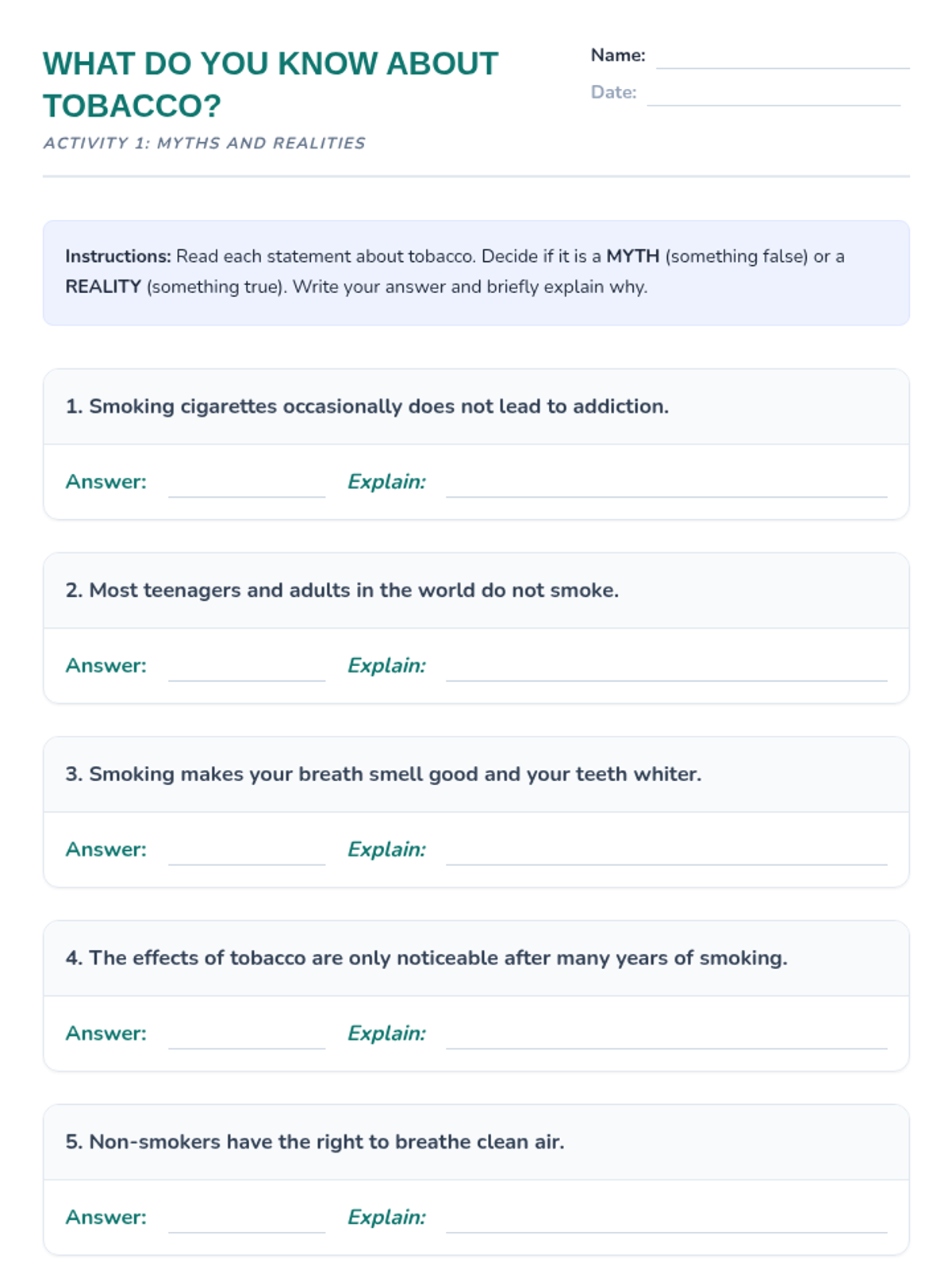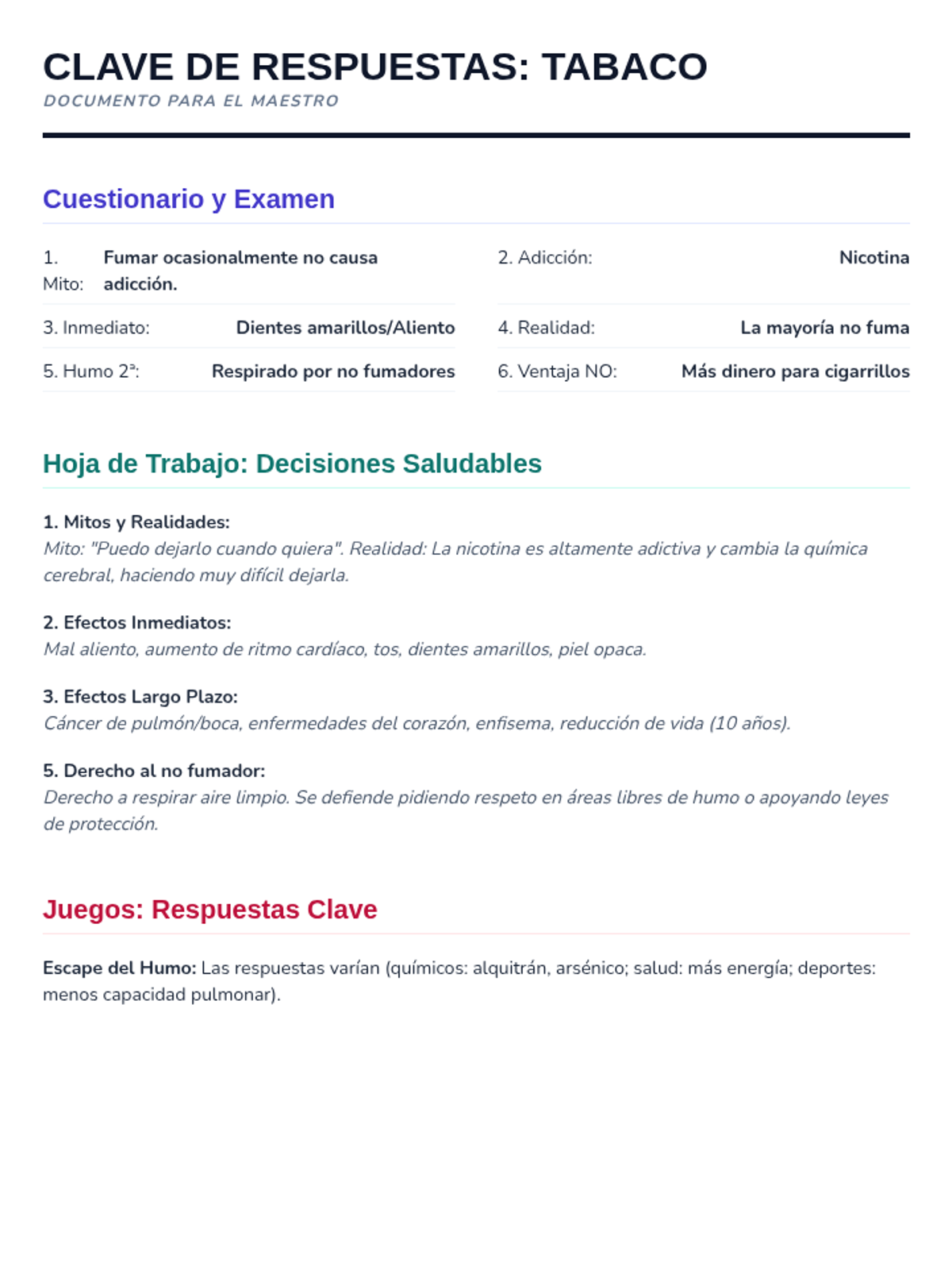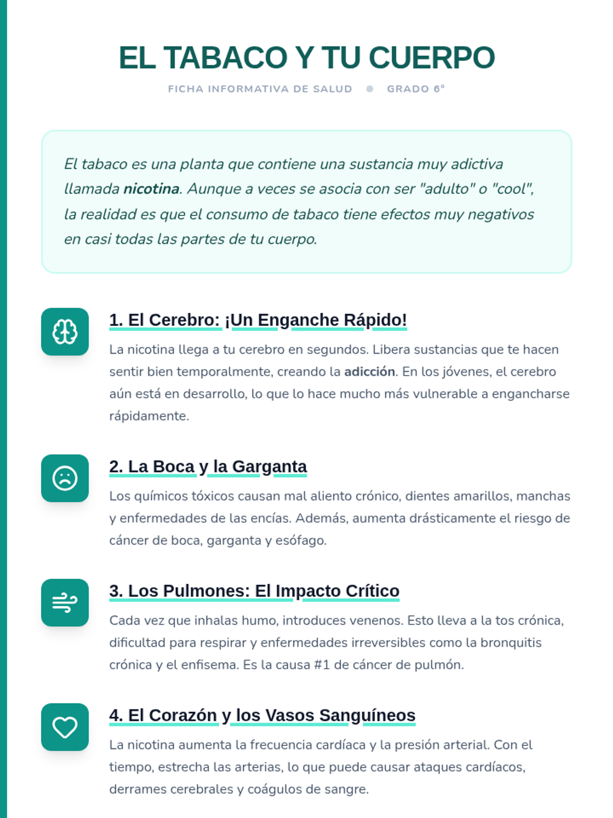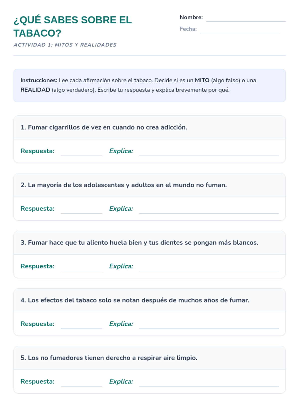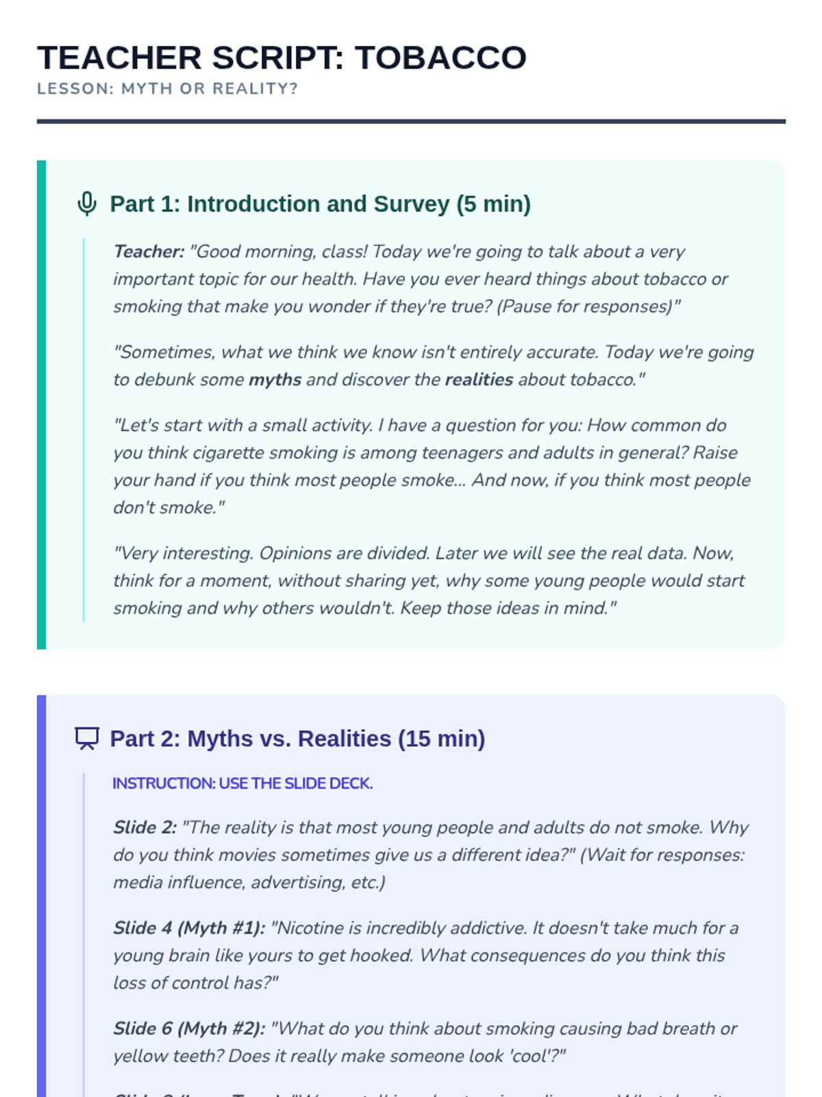 Esta lección de 50 minutos desmiente los mitos comunes sobre el tabaco, empoderando a los estudiantes de 6º grado con información precisa sobre los efectos en la salud y los derechos de los no fumadores. / This 50-minute lesson debunks common tobacco myths, empowering 6th-grade students with accurate information on health effects and non-smokers' rights.