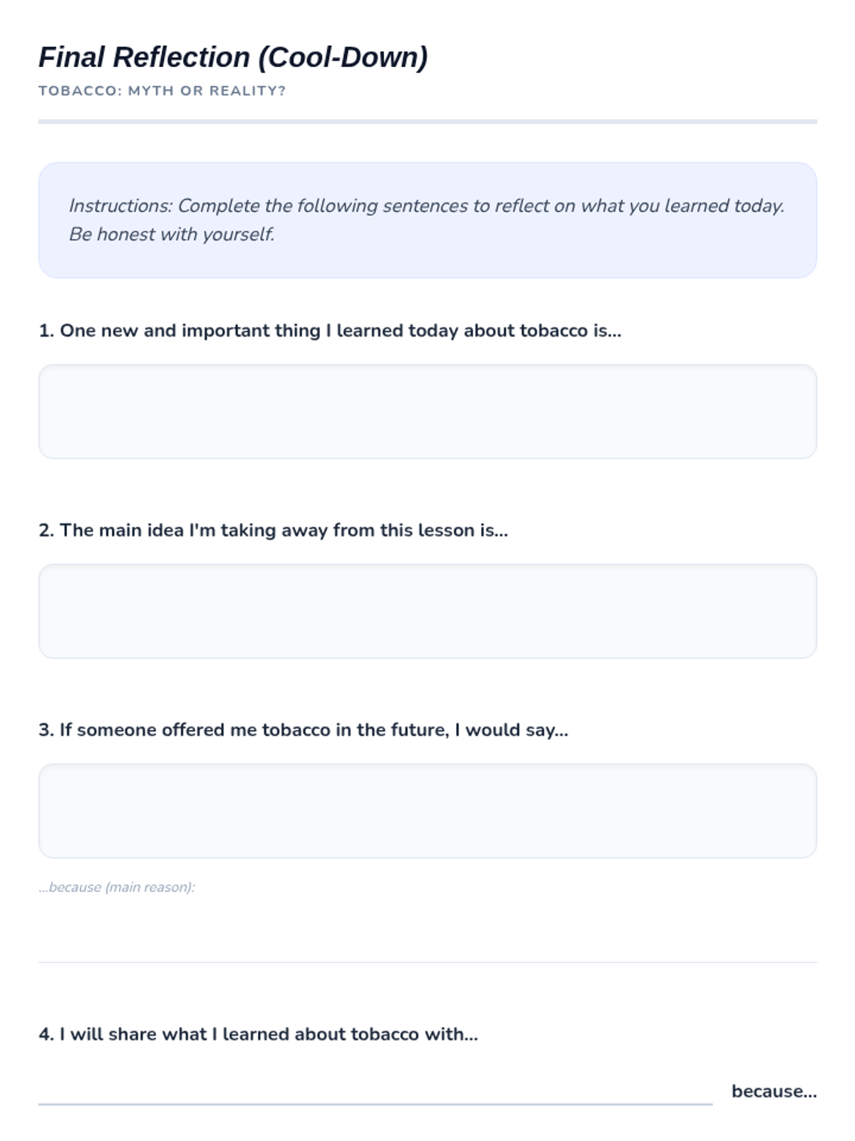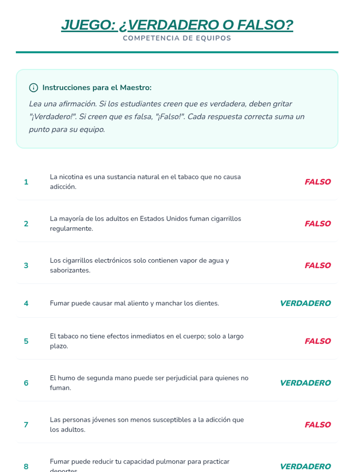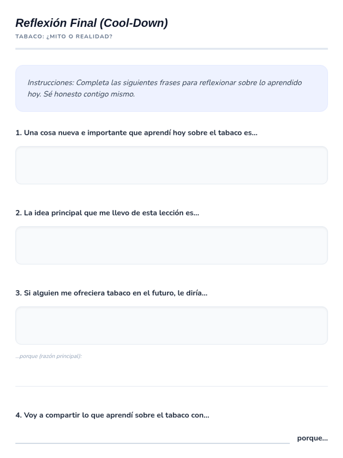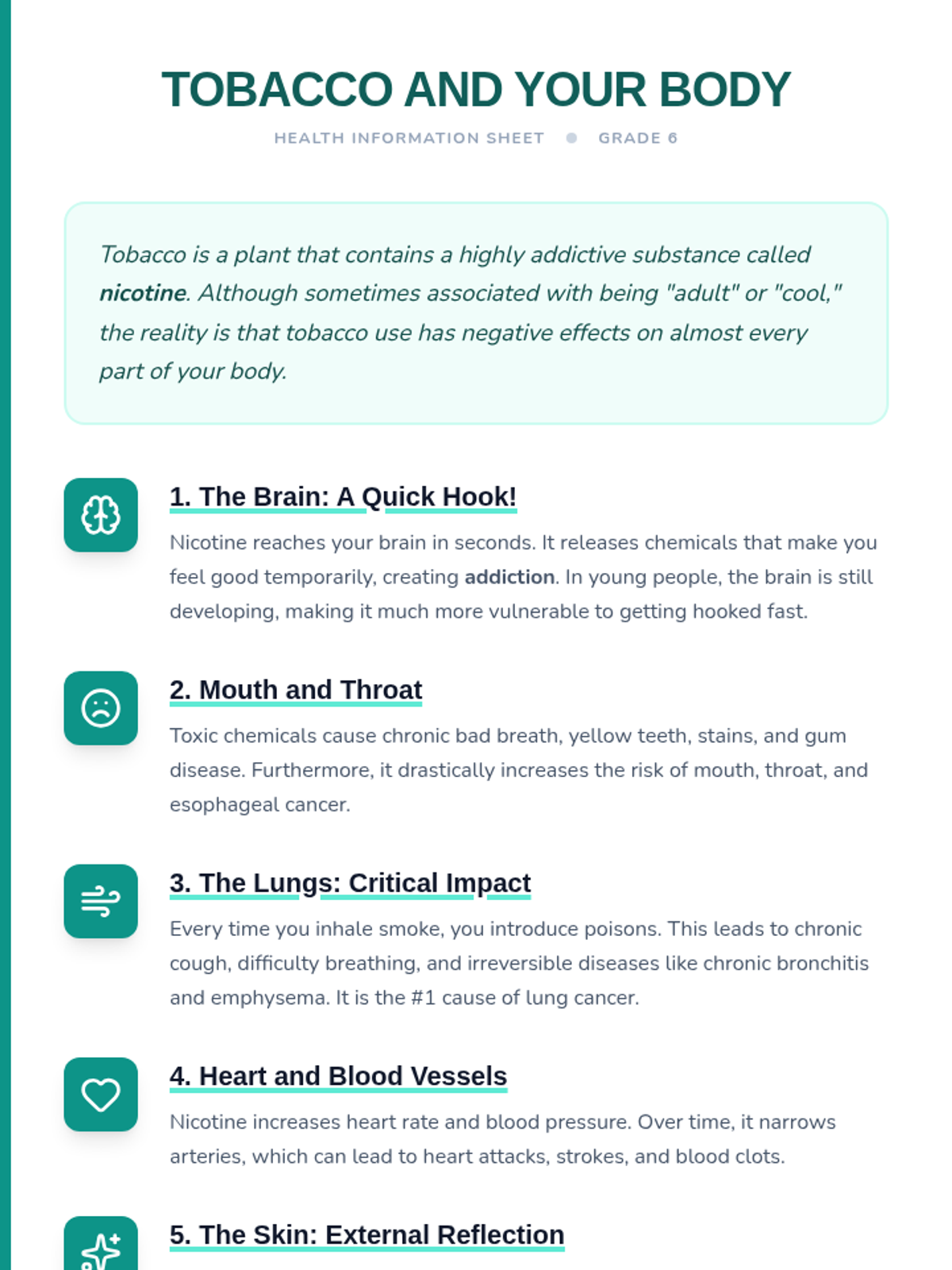 Esta lección de 50 minutos desmiente los mitos comunes sobre el tabaco, empoderando a los estudiantes de 6º grado con información precisa sobre los efectos en la salud y los derechos de los no fumadores. / This 50-minute lesson debunks common tobacco myths, empowering 6th-grade students with accurate information on health effects and non-smokers' rights.