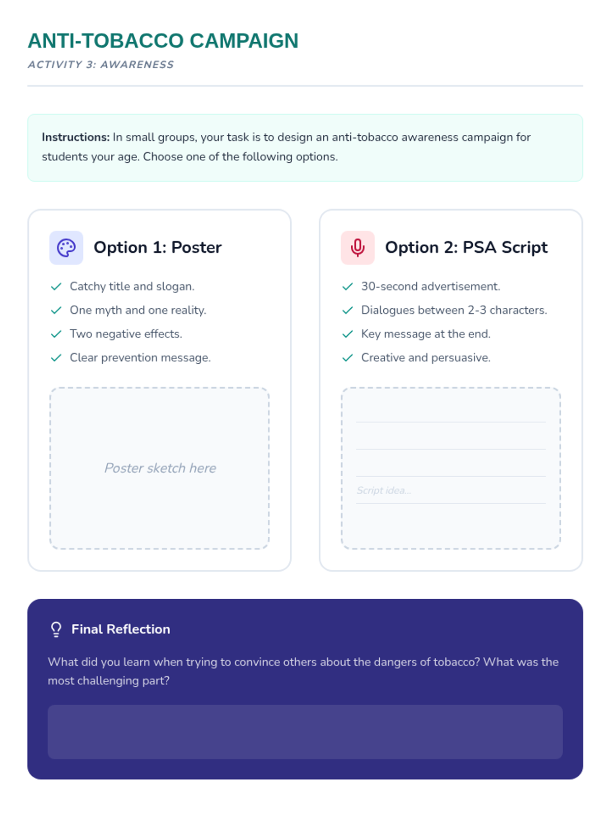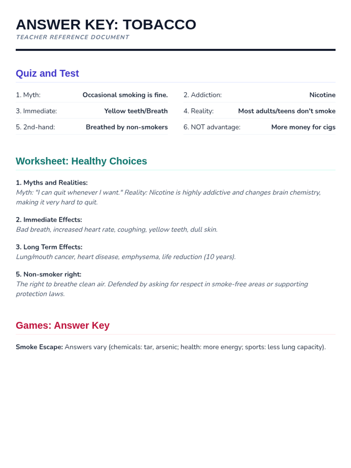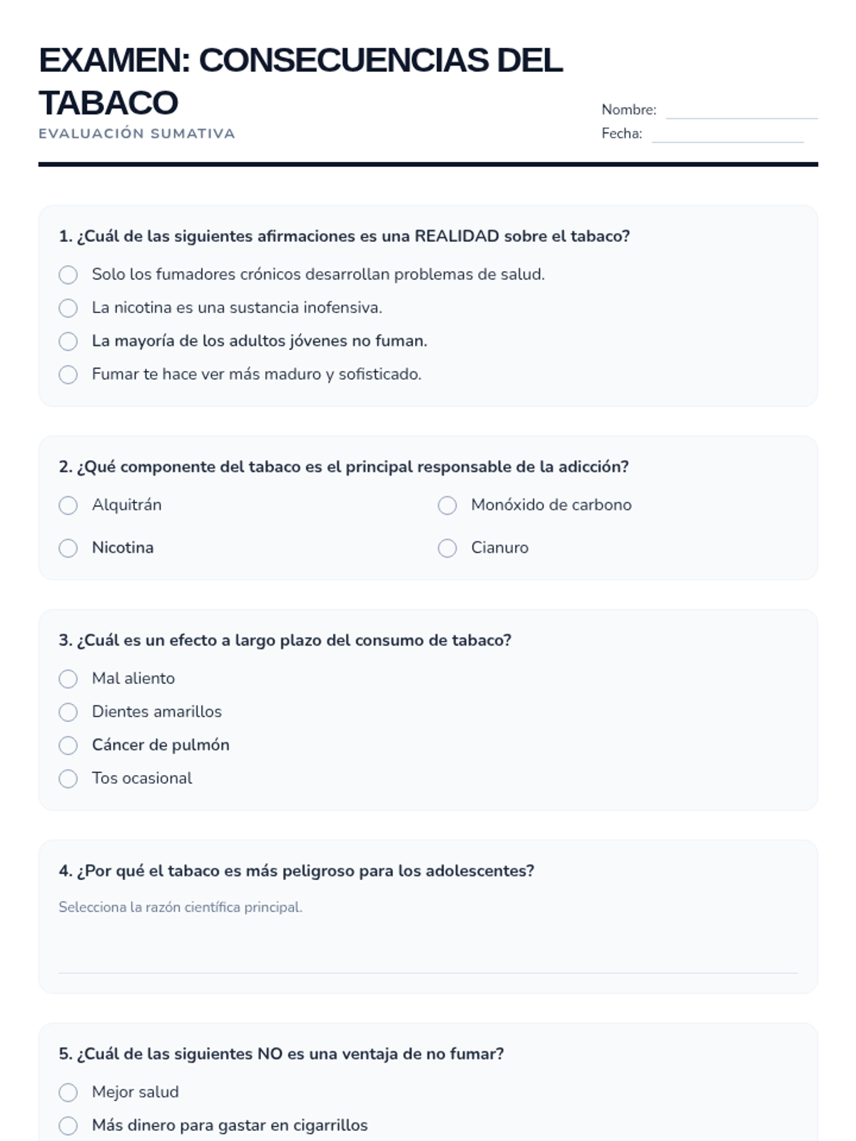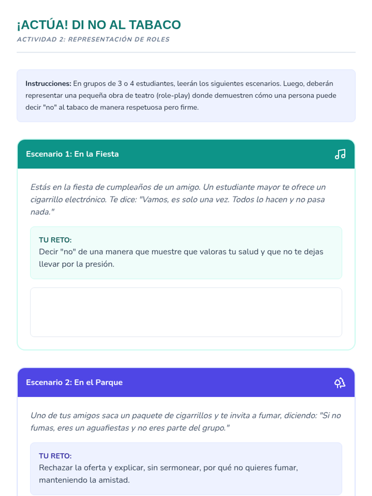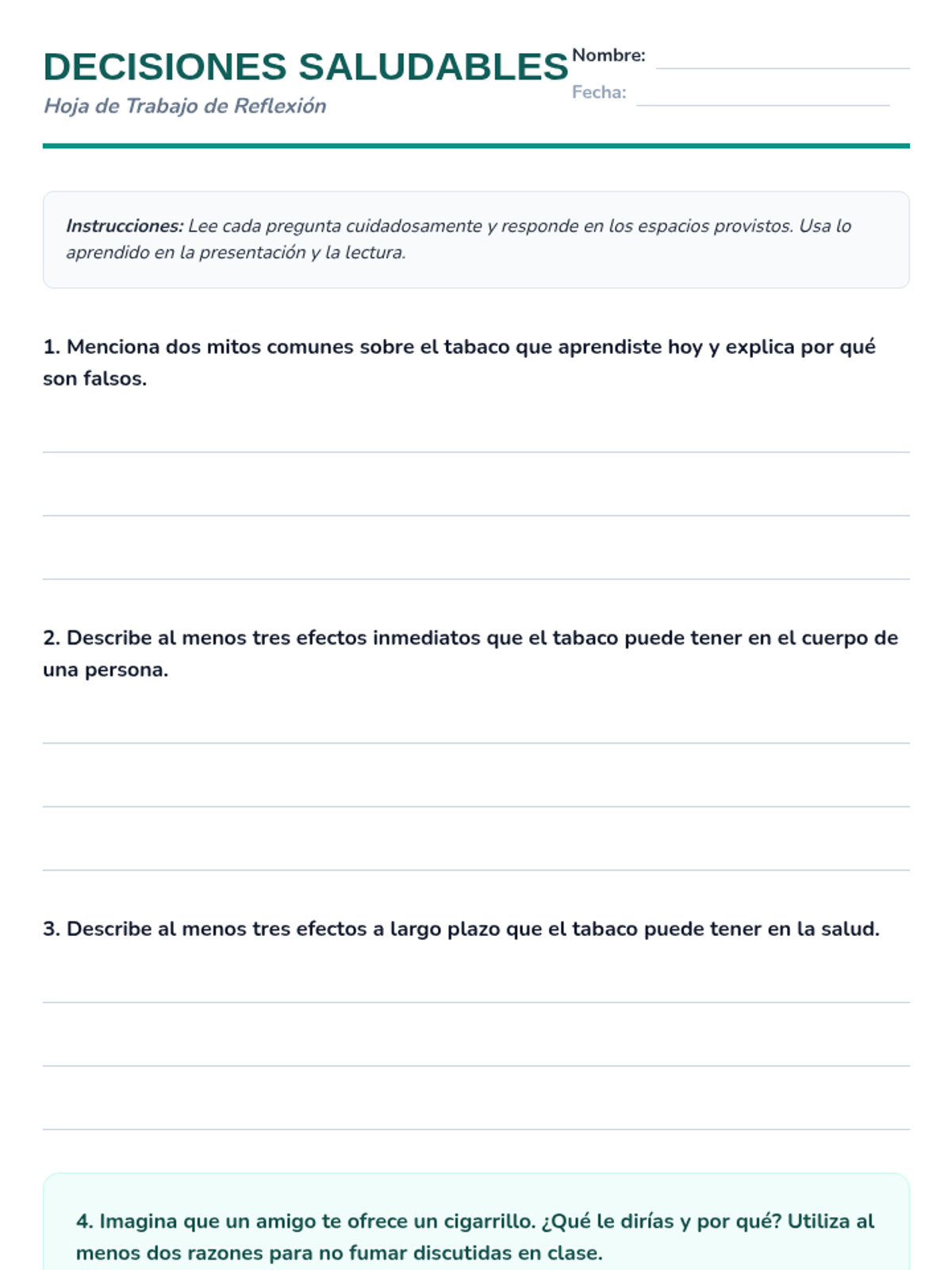 Esta lección de 50 minutos desmiente los mitos comunes sobre el tabaco, empoderando a los estudiantes de 6º grado con información precisa sobre los efectos en la salud y los derechos de los no fumadores. / This 50-minute lesson debunks common tobacco myths, empowering 6th-grade students with accurate information on health effects and non-smokers' rights.