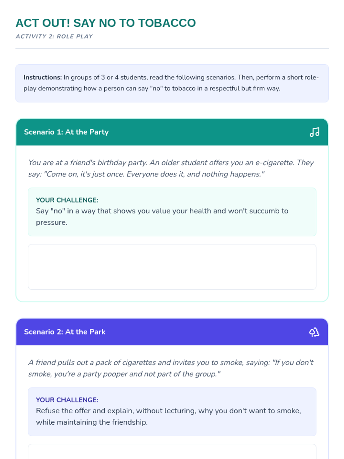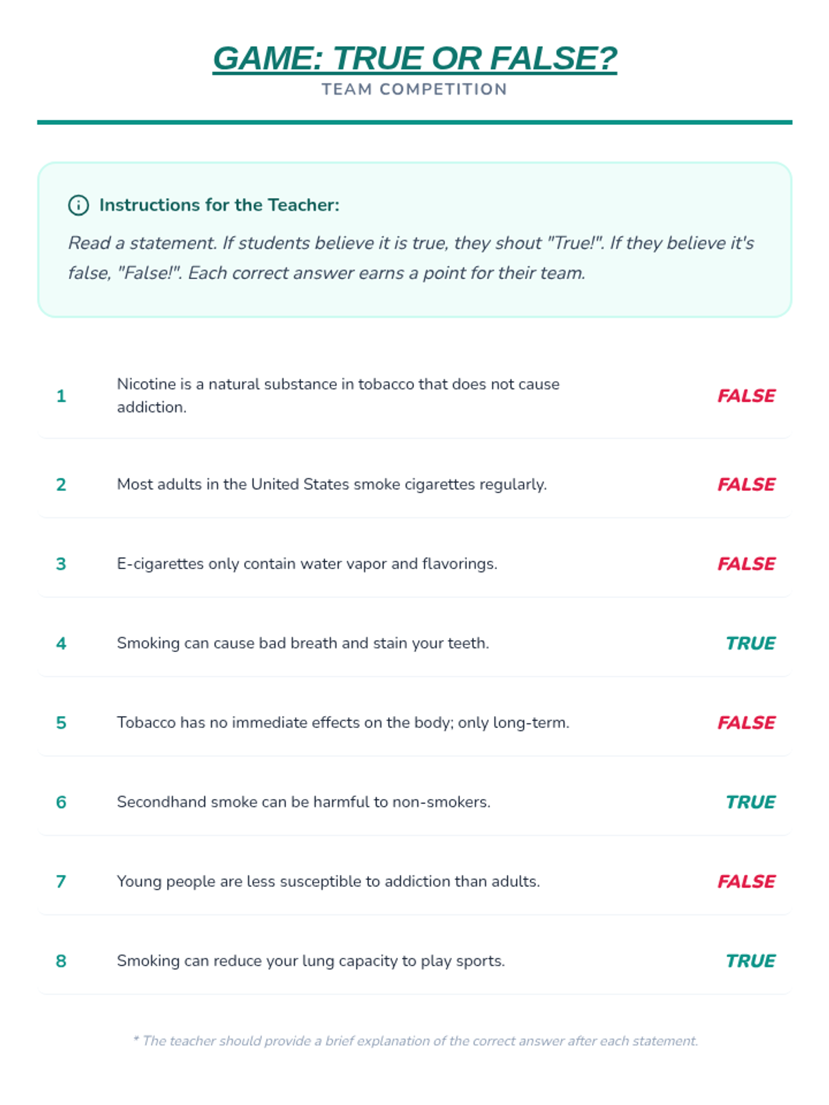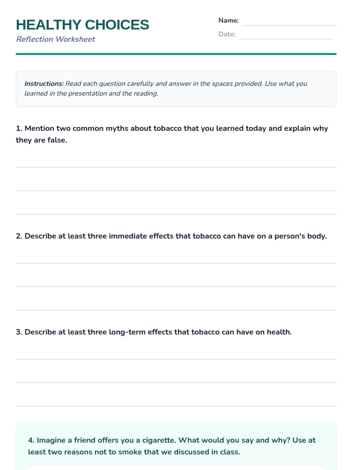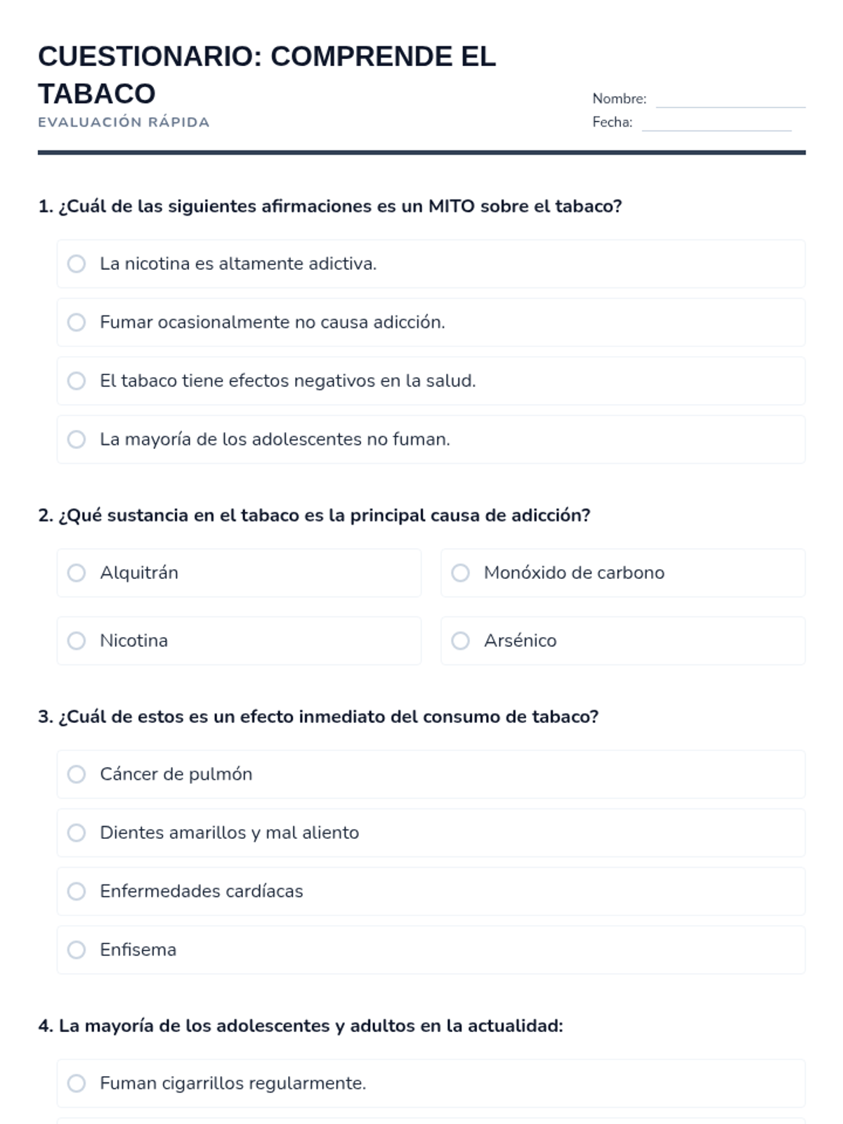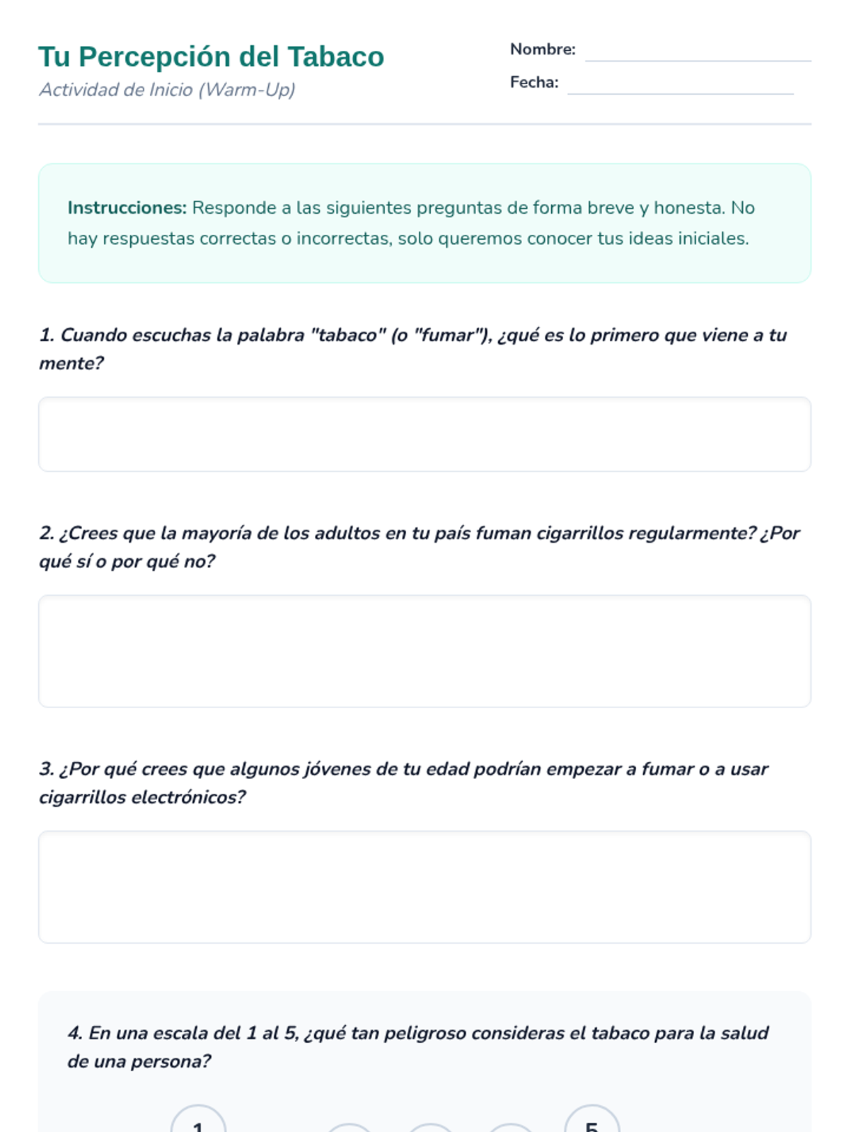 Esta lección de 50 minutos desmiente los mitos comunes sobre el tabaco, empoderando a los estudiantes de 6º grado con información precisa sobre los efectos en la salud y los derechos de los no fumadores. / This 50-minute lesson debunks common tobacco myths, empowering 6th-grade students with accurate information on health effects and non-smokers' rights.
