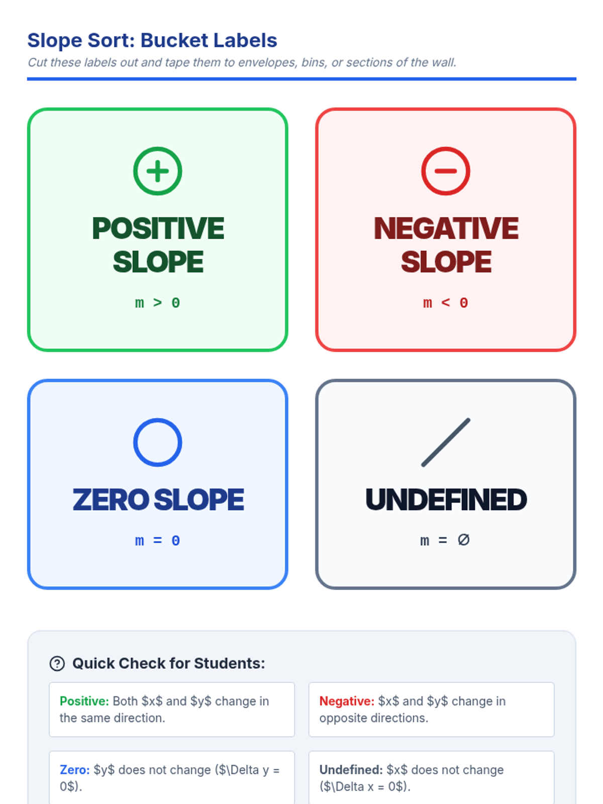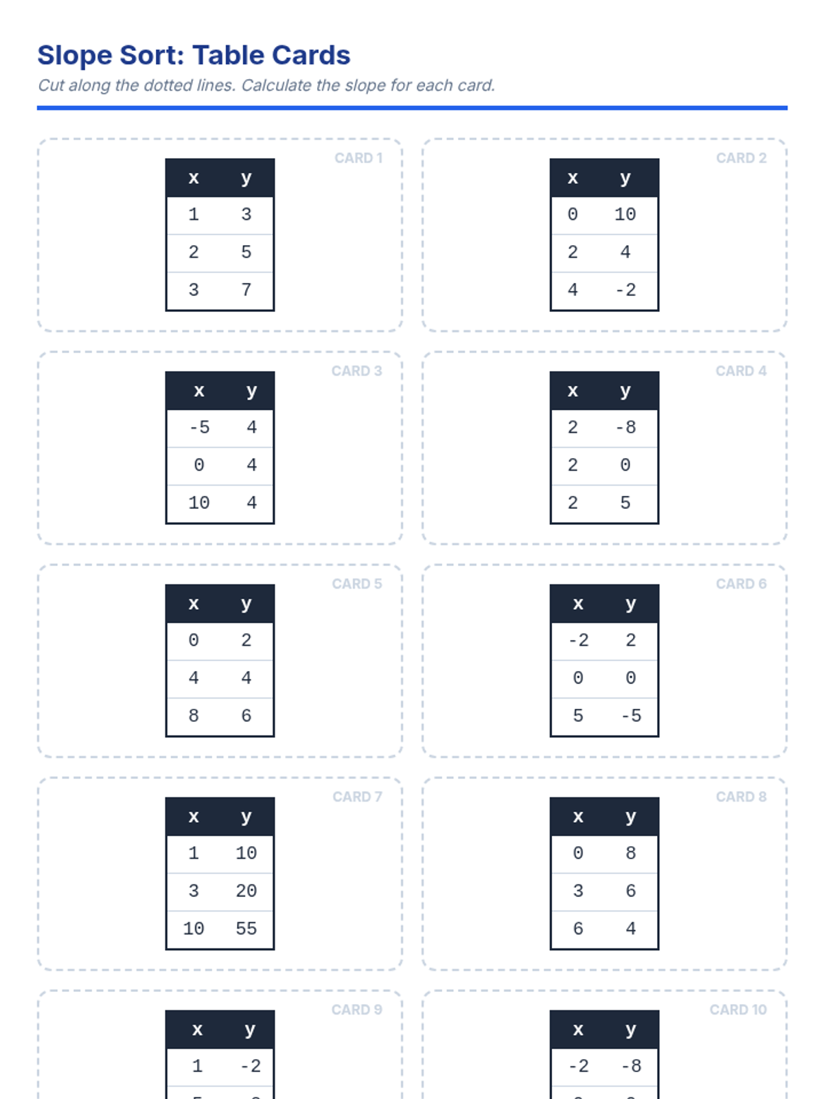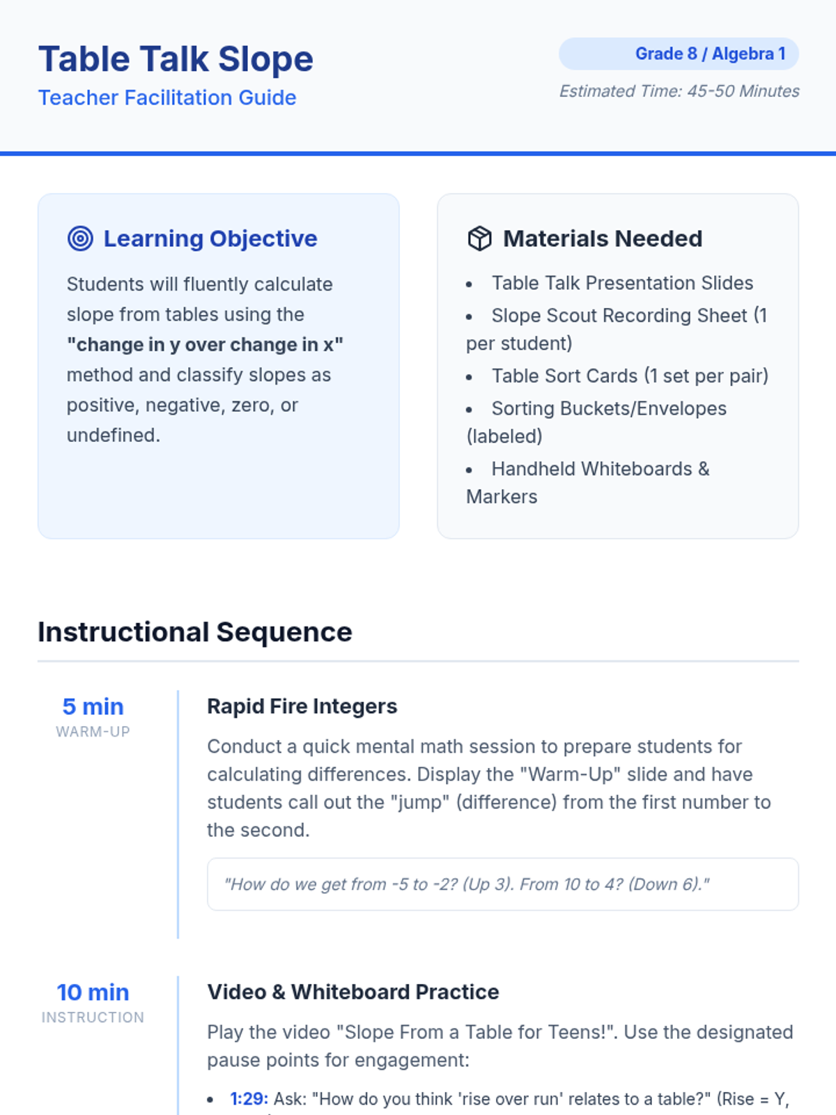 A comprehensive lesson for Algebra 1 students to master calculating slope from tables. Students use the 'change in y over change in x' method, practice through a guided video, and engage in a 'Slope Sort' activity to classify positive, negative, zero, and undefined slopes.