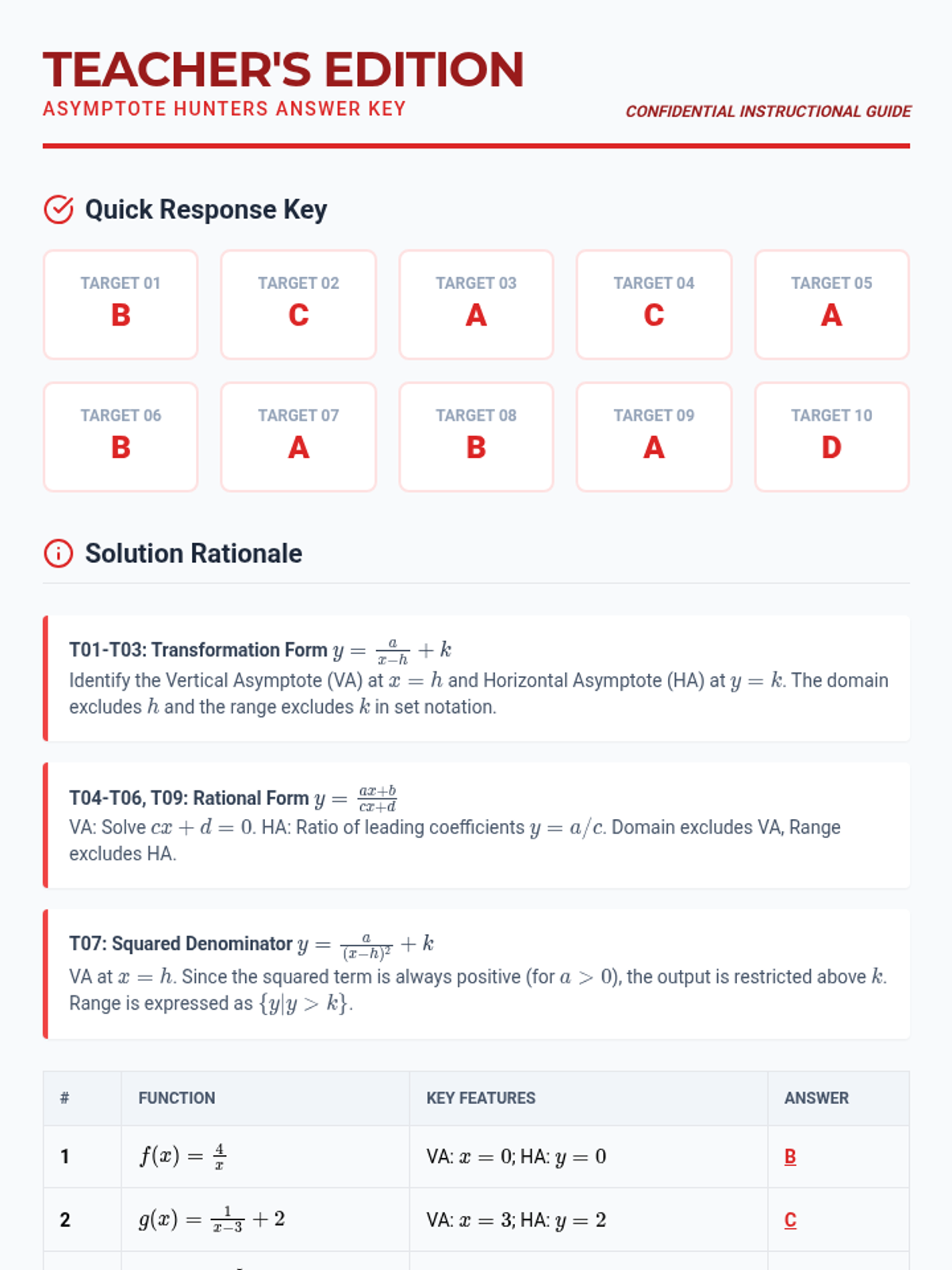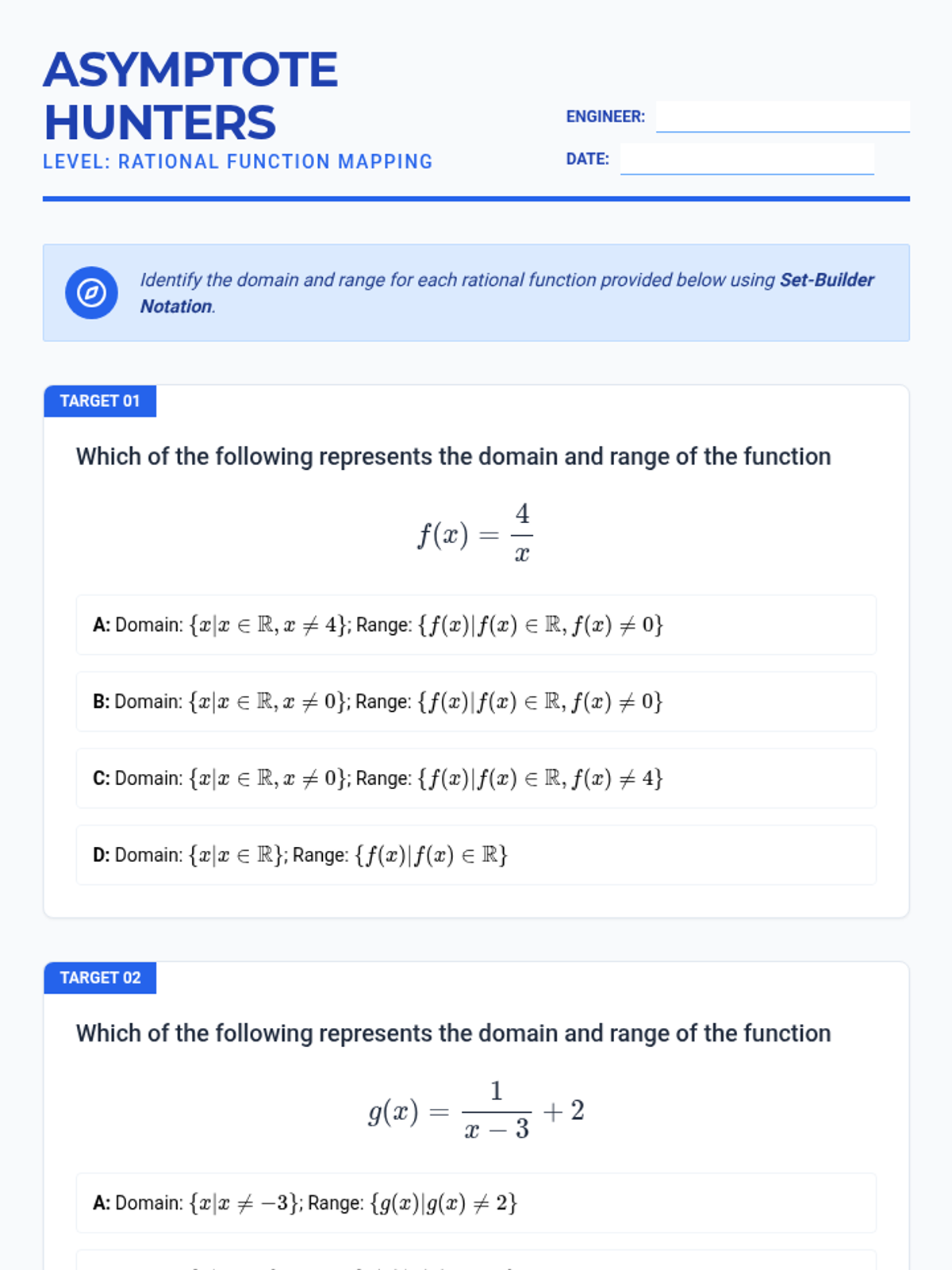 A lesson focused on identifying the domain and range of rational functions using set-builder notation. Students analyze various horizontal and vertical asymptotes to determine functional constraints.