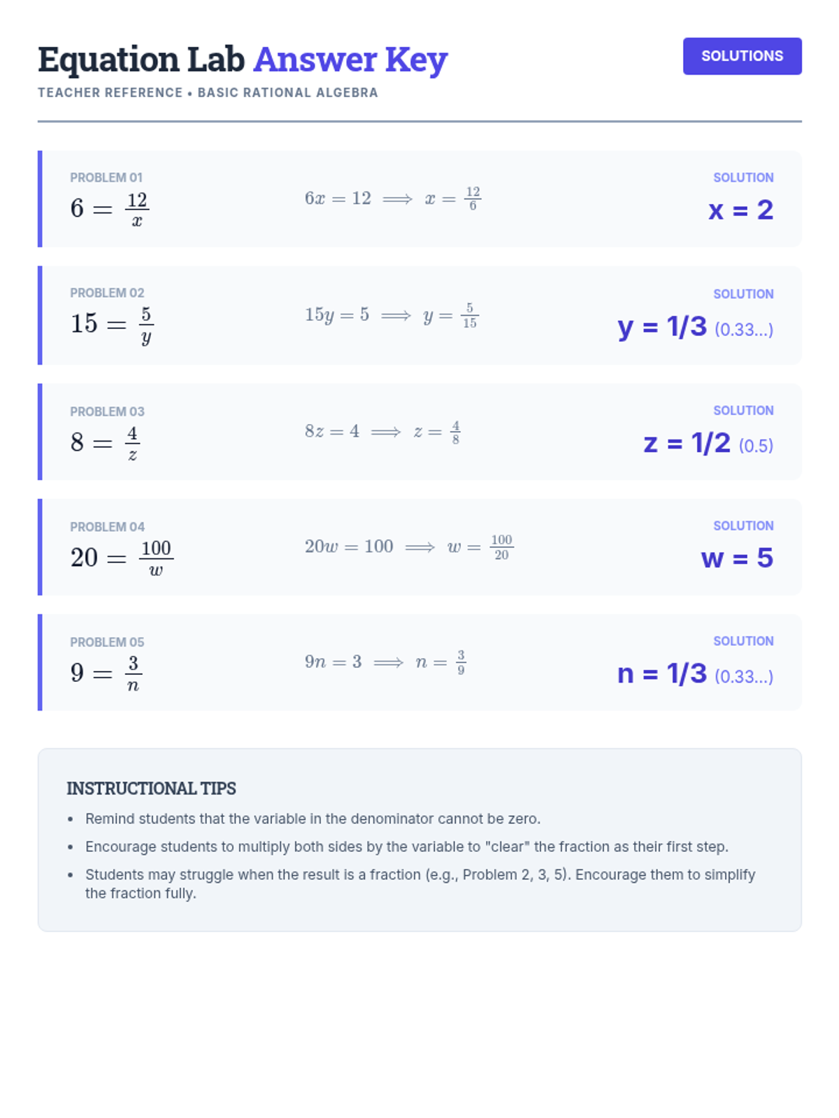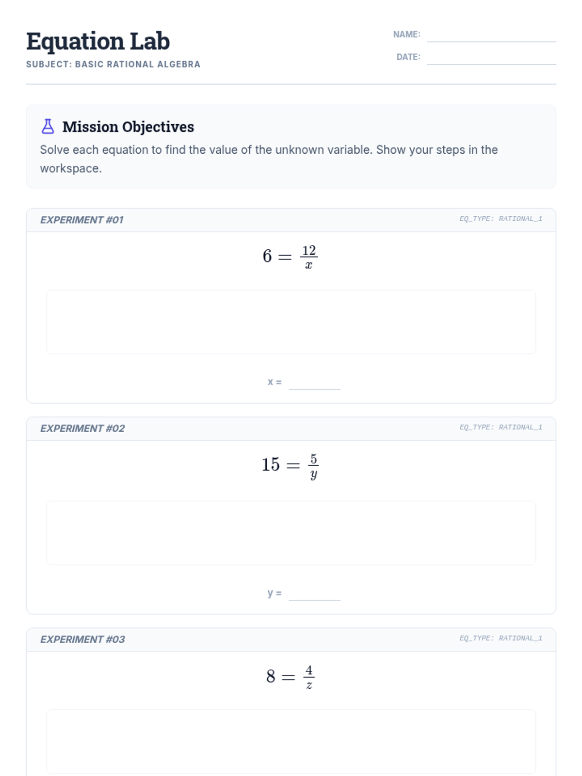 A quick practice set focused on solving basic rational equations where a single variable is in the denominator. Students will develop their algebraic manipulation skills to isolate the variable and find solutions.