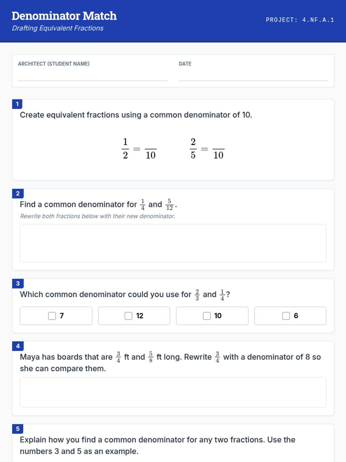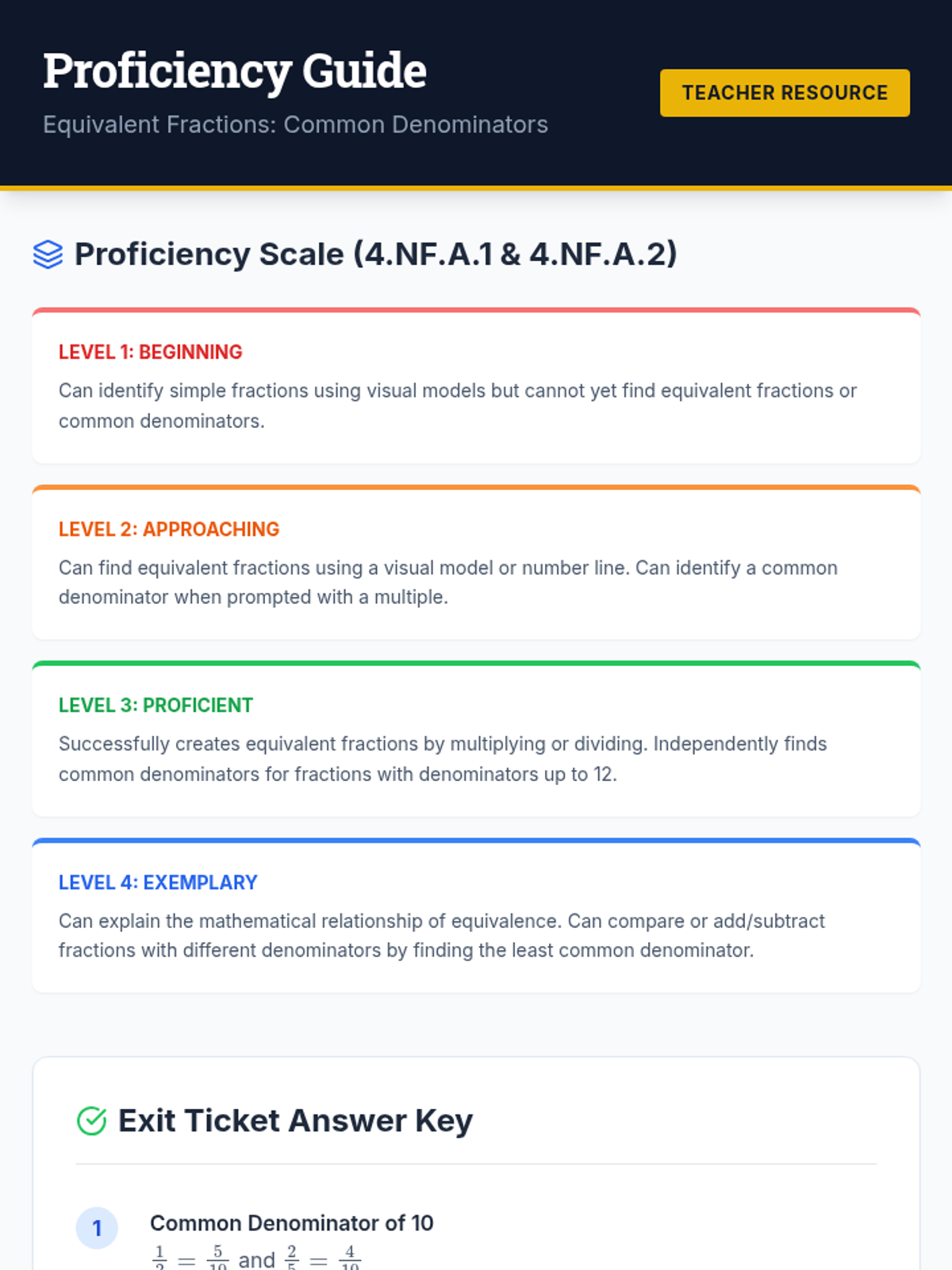 A short assessment focused on the 4th-grade skill of finding common denominators to create equivalent fractions. Includes a student exit ticket and a teacher proficiency guide.
