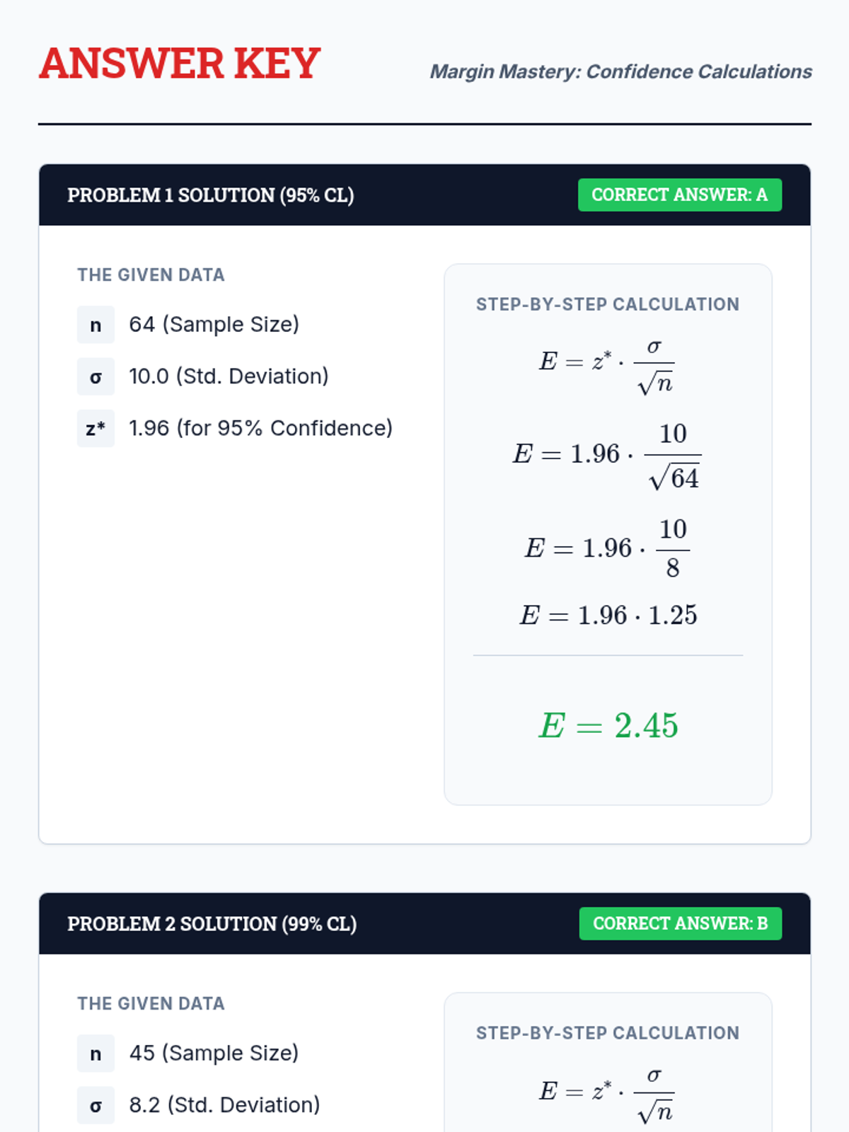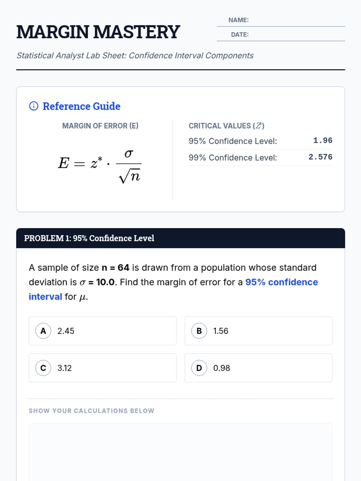 A lesson focused on calculating the margin of error for population means when the population standard deviation is known. Students practice using z-scores for different confidence levels.