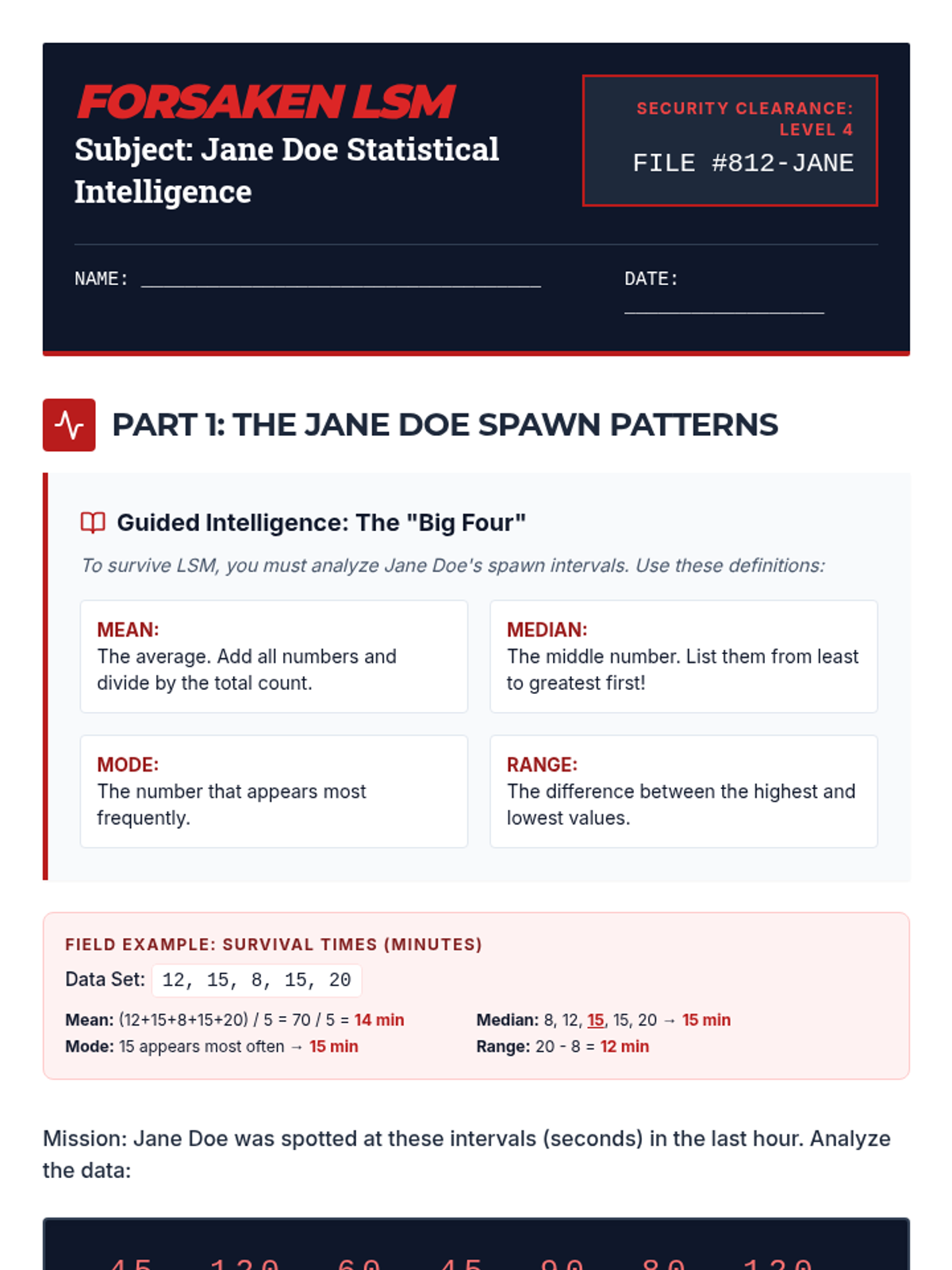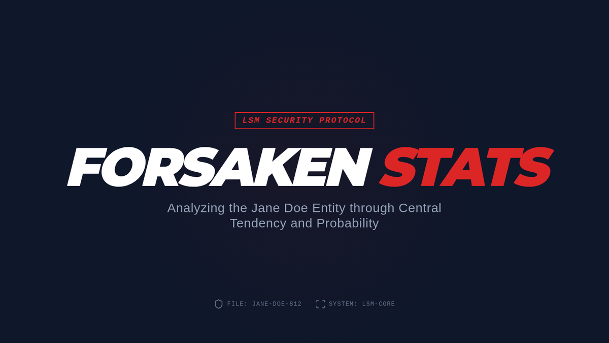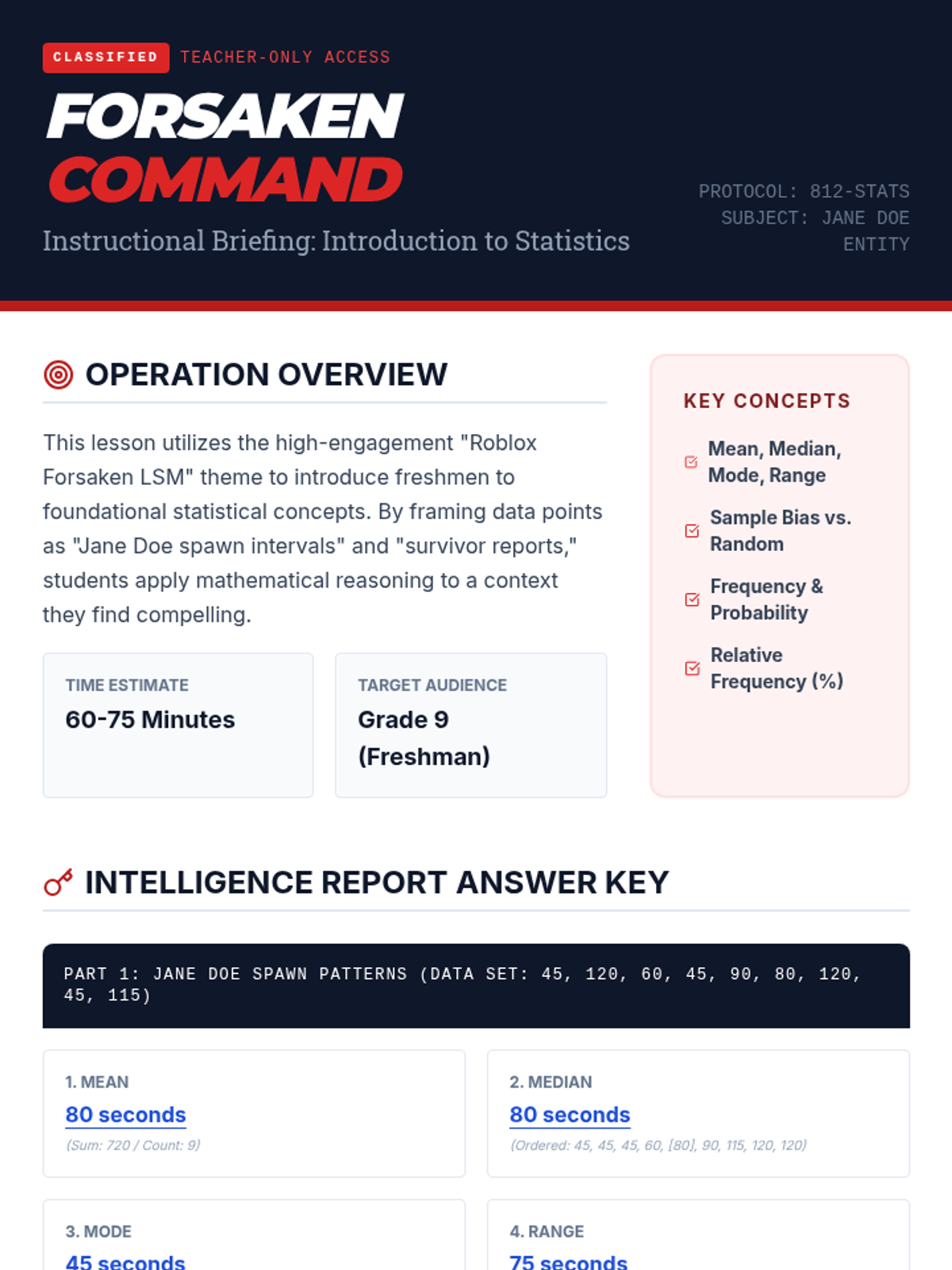An introductory statistics lesson themed around Roblox Forsaken LSM and the Jane Doe entity, covering central tendency, data collection, and probability.
