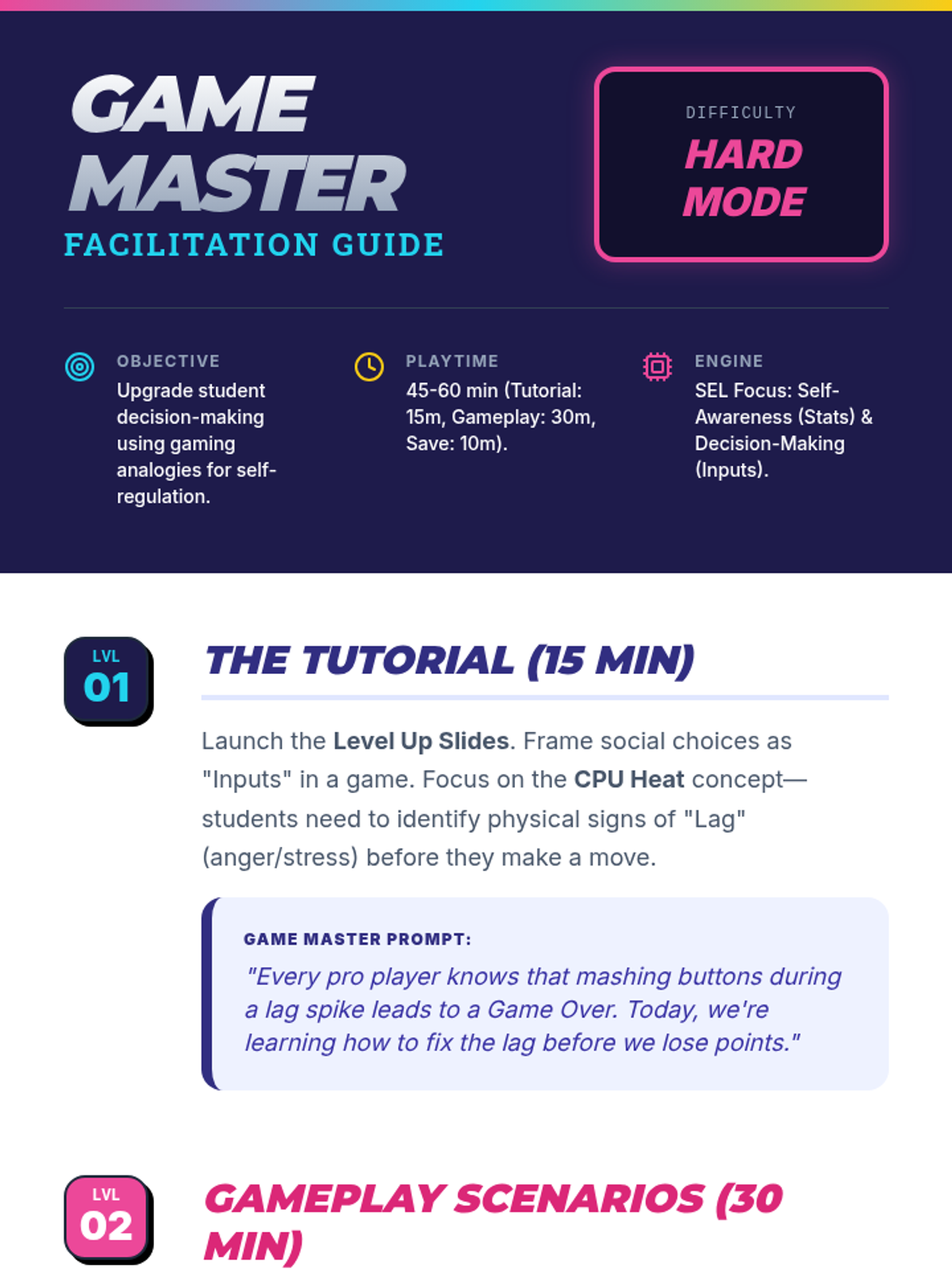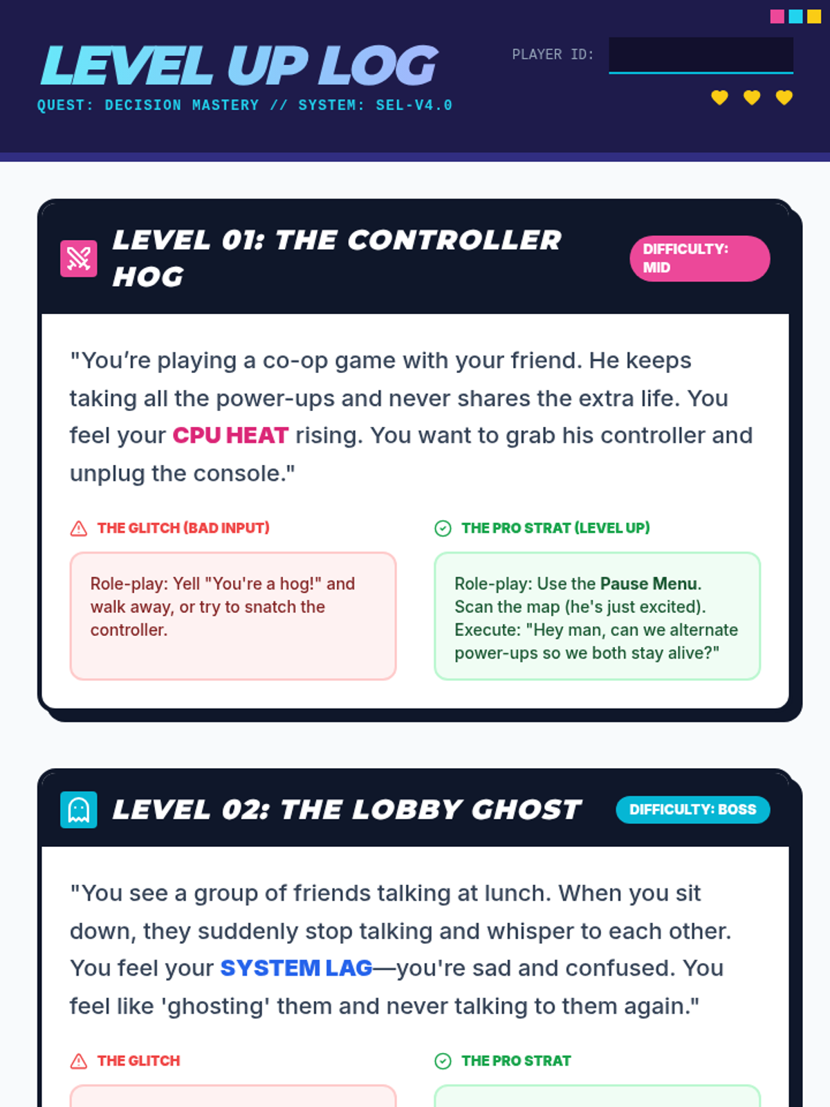 A video-game-themed lesson focusing on self-awareness and responsible decision-making through high-engagement role-play 'levels'. Students will learn a 3-step 'Level Up' protocol to handle social 'glitches' and master their own 'player stats'.