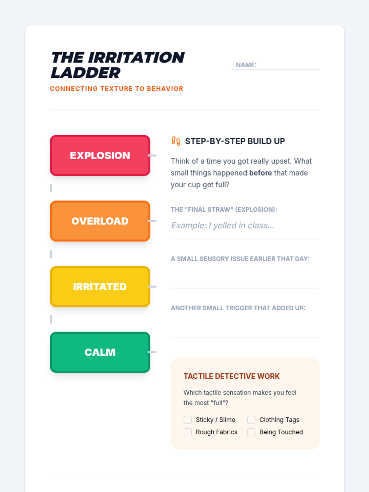 Students explore how tactile discomfort builds up over time and affects behavior, fostering empathy and self-awareness.