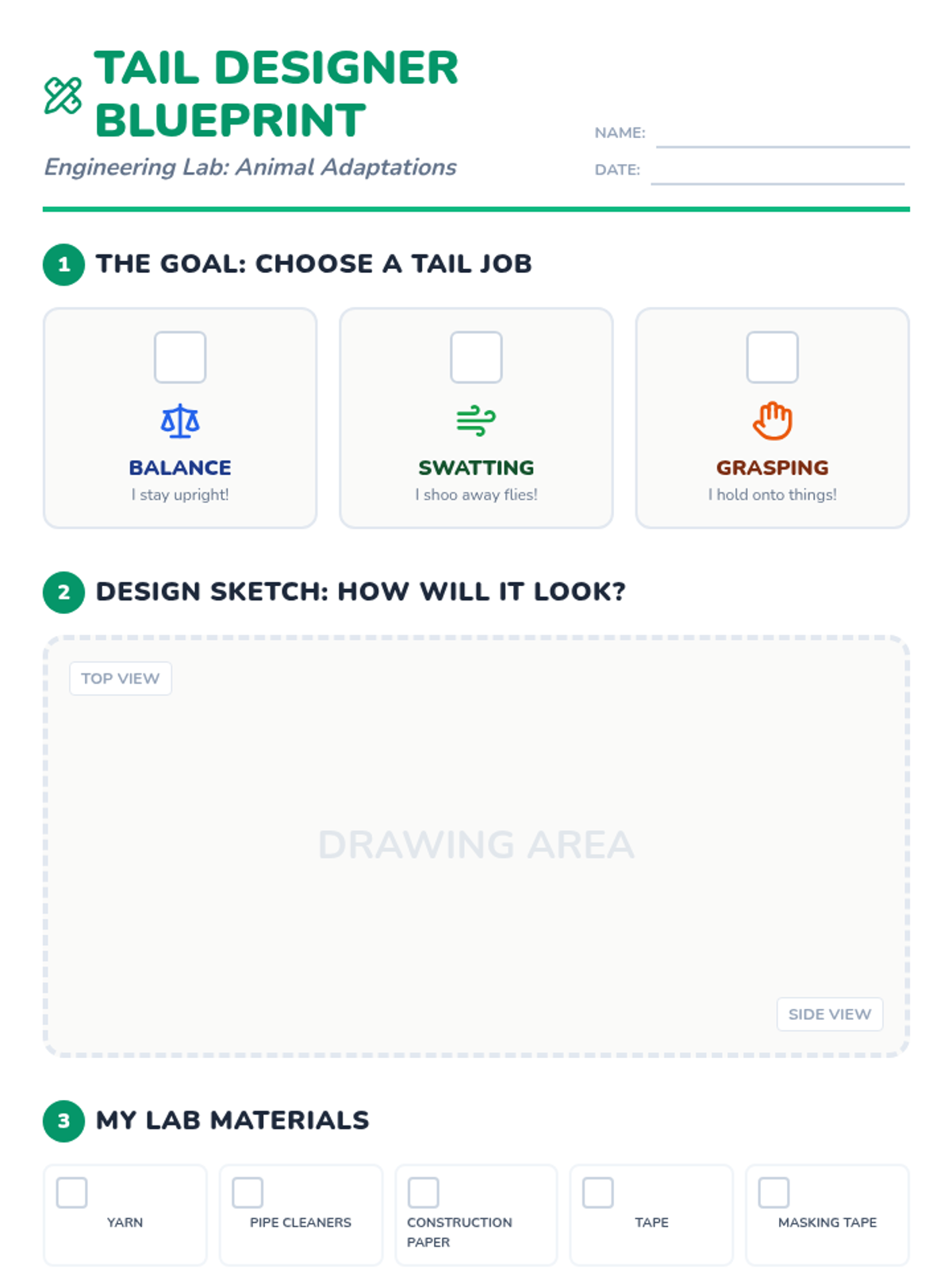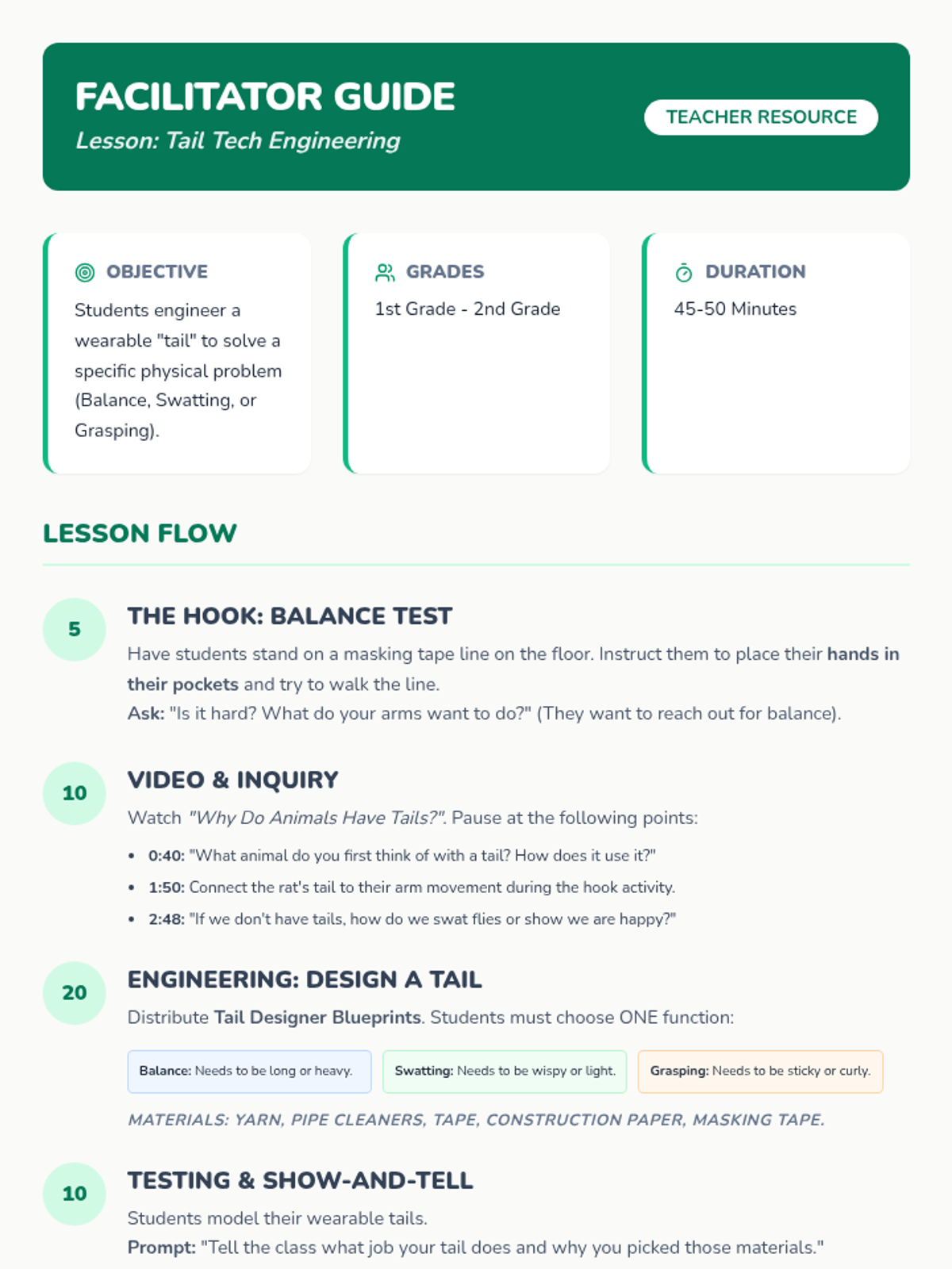 Students explore the biological functions of animal tails and apply engineering principles to design, build, and test their own wearable tail for balance, swatting, or grasping.