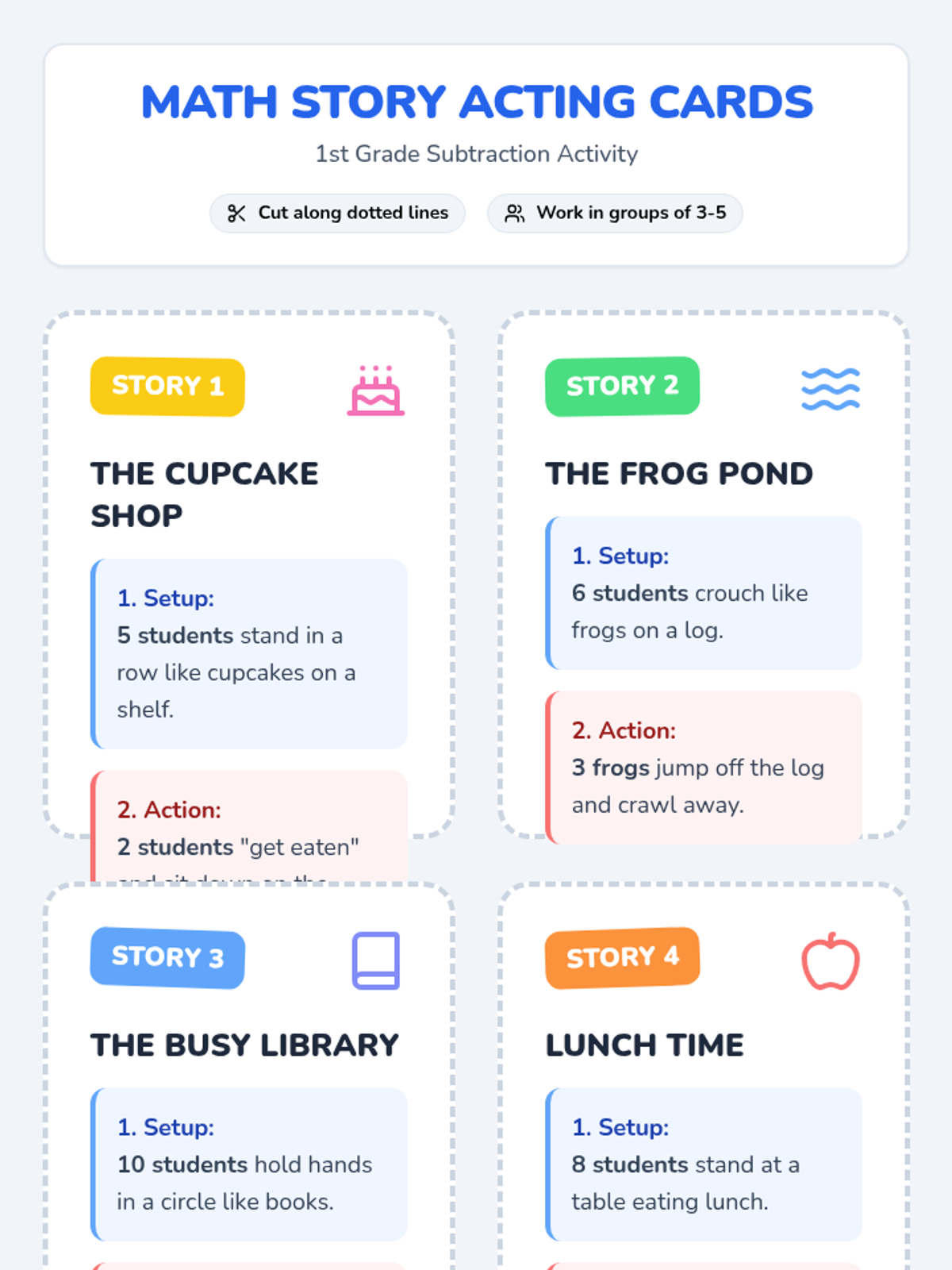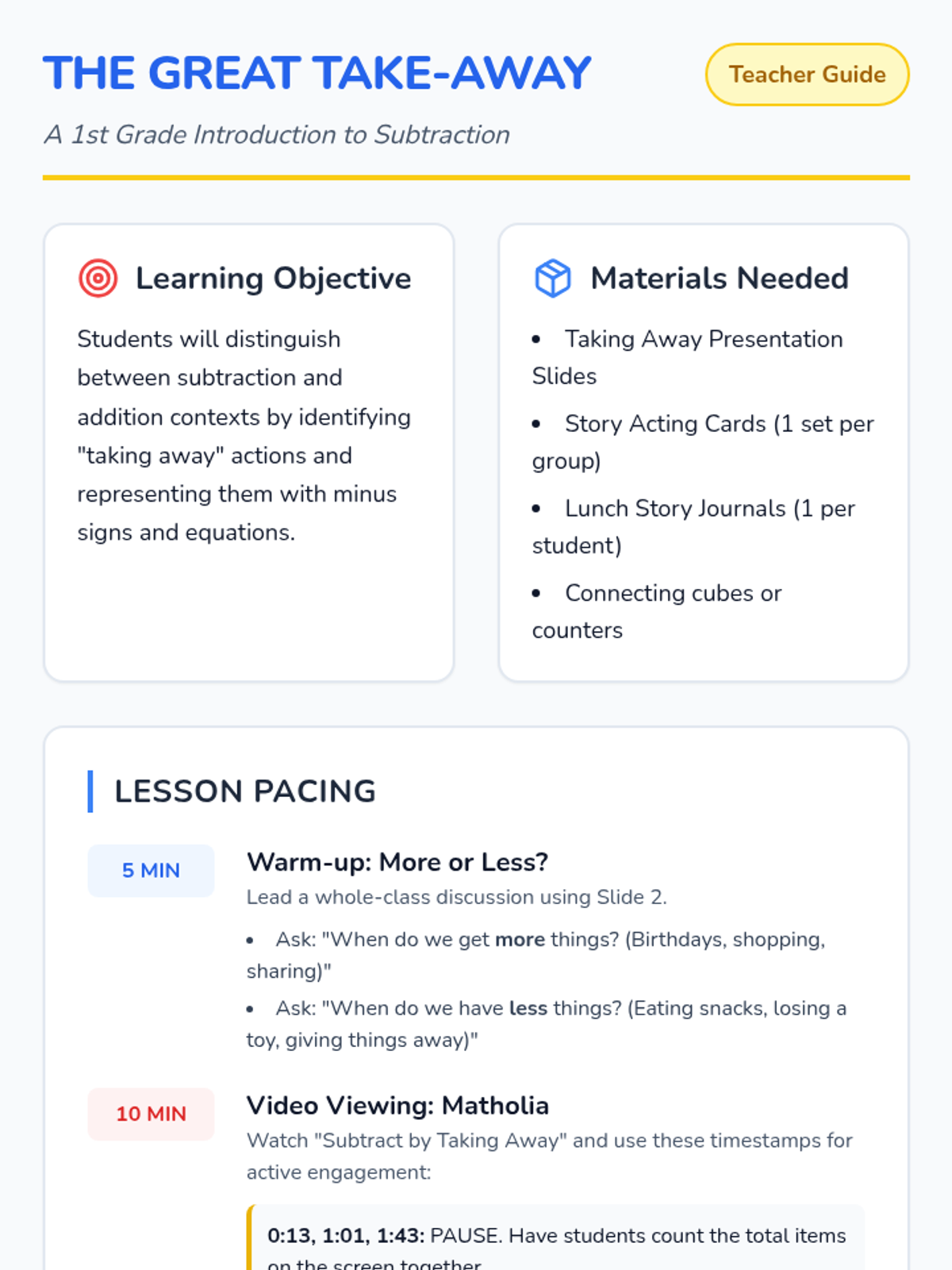 A 1st Grade introduction to subtraction through storytelling, movement, and visual modeling. Students learn to identify 'taking away' contexts and translate them into mathematical equations.