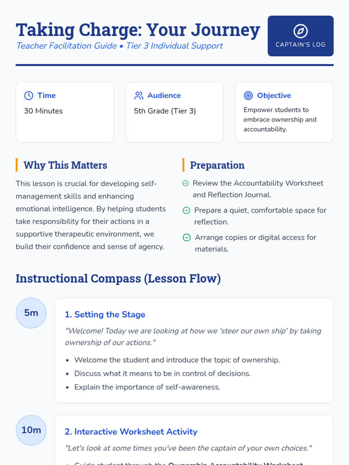 This Tier 3 individual lesson empowers 5th-grade students to take ownership of their personal growth and therapeutic process by exploring accountability and self-management.