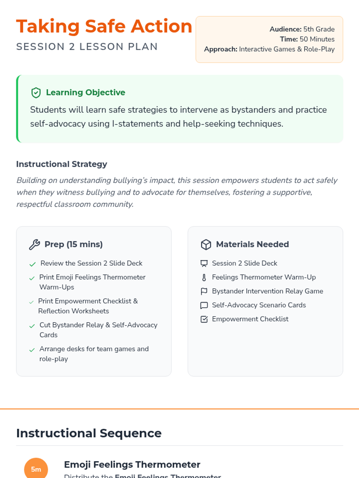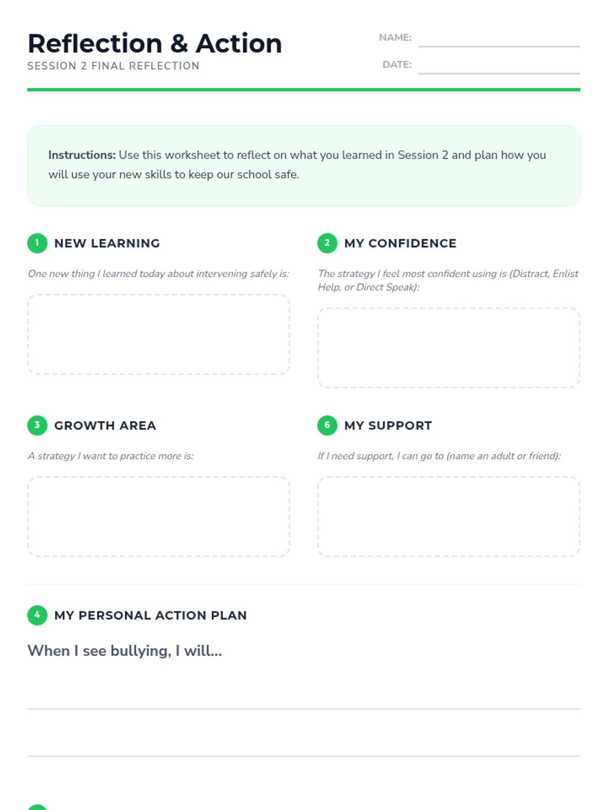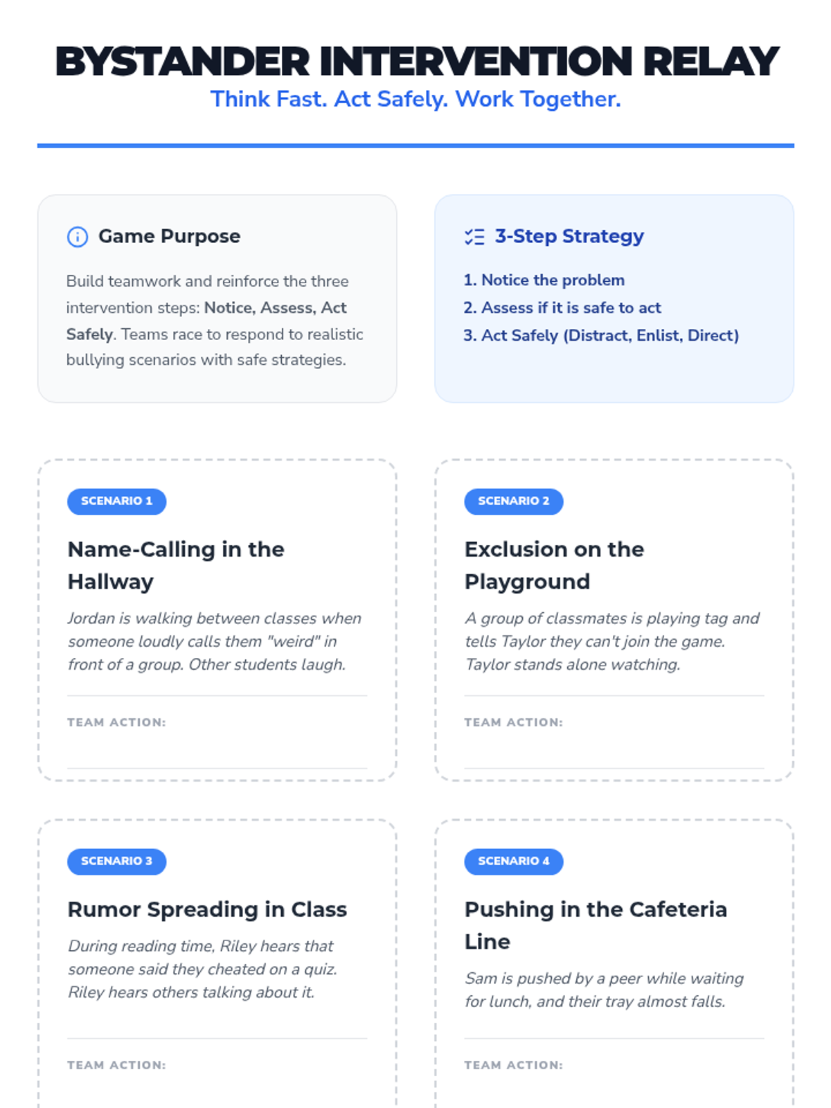 Students practice safe bystander intervention steps and self-advocacy skills through a relay game and role-play activities, culminating in a personal action plan.