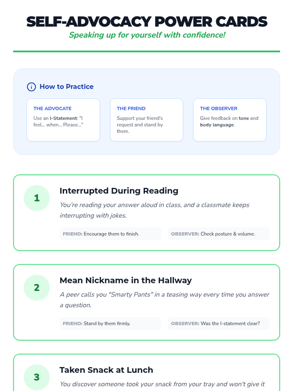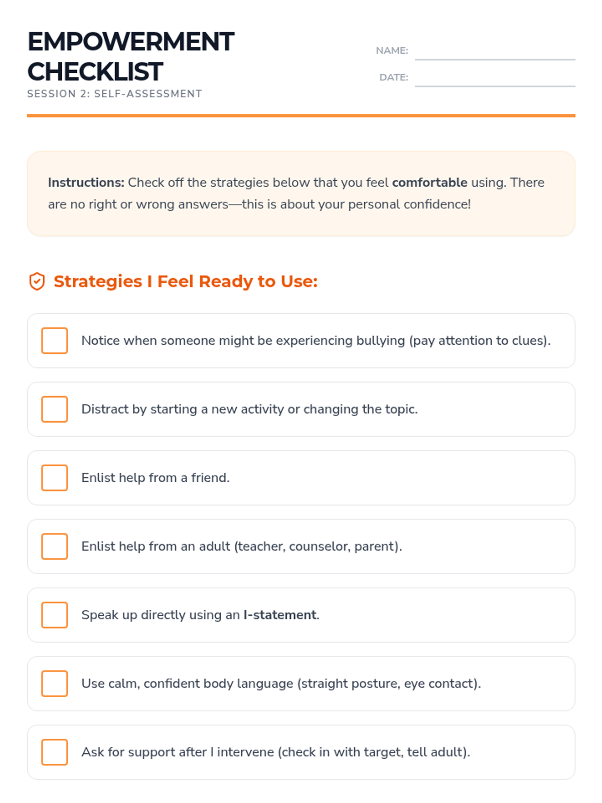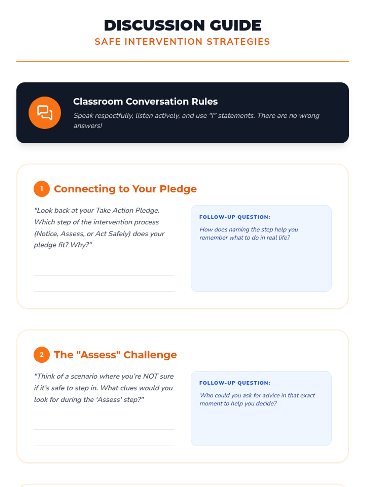 Students practice safe bystander intervention steps and self-advocacy skills through a relay game and role-play activities, culminating in a personal action plan.