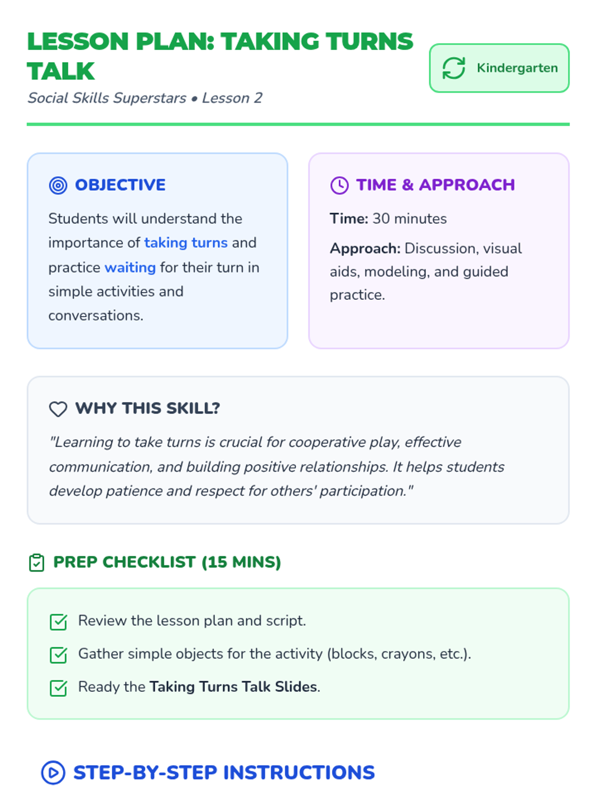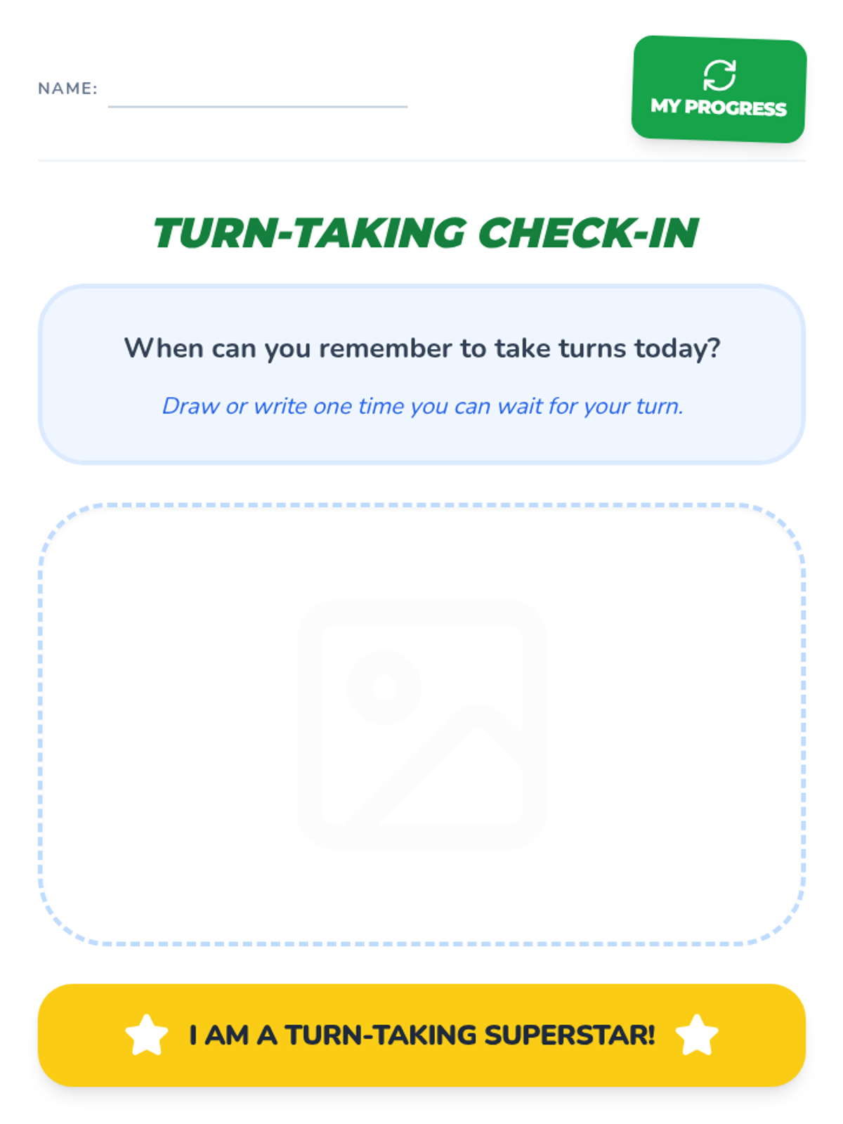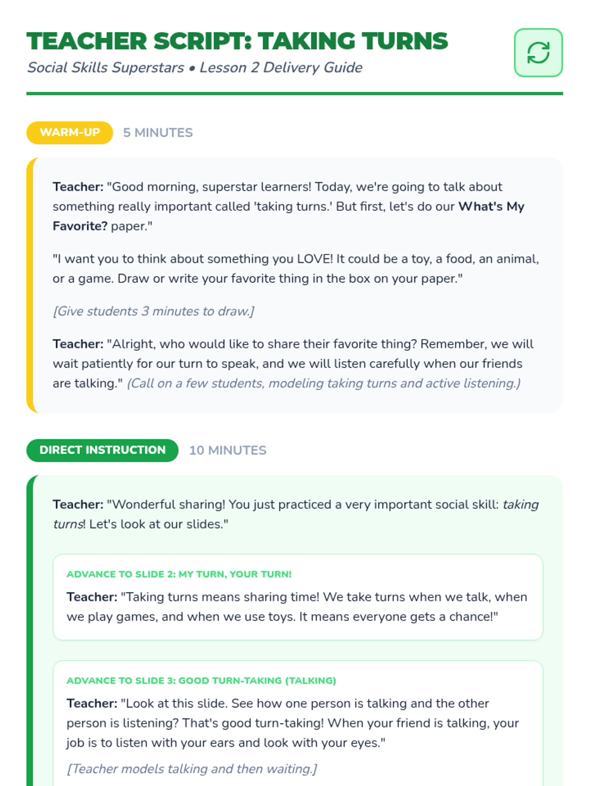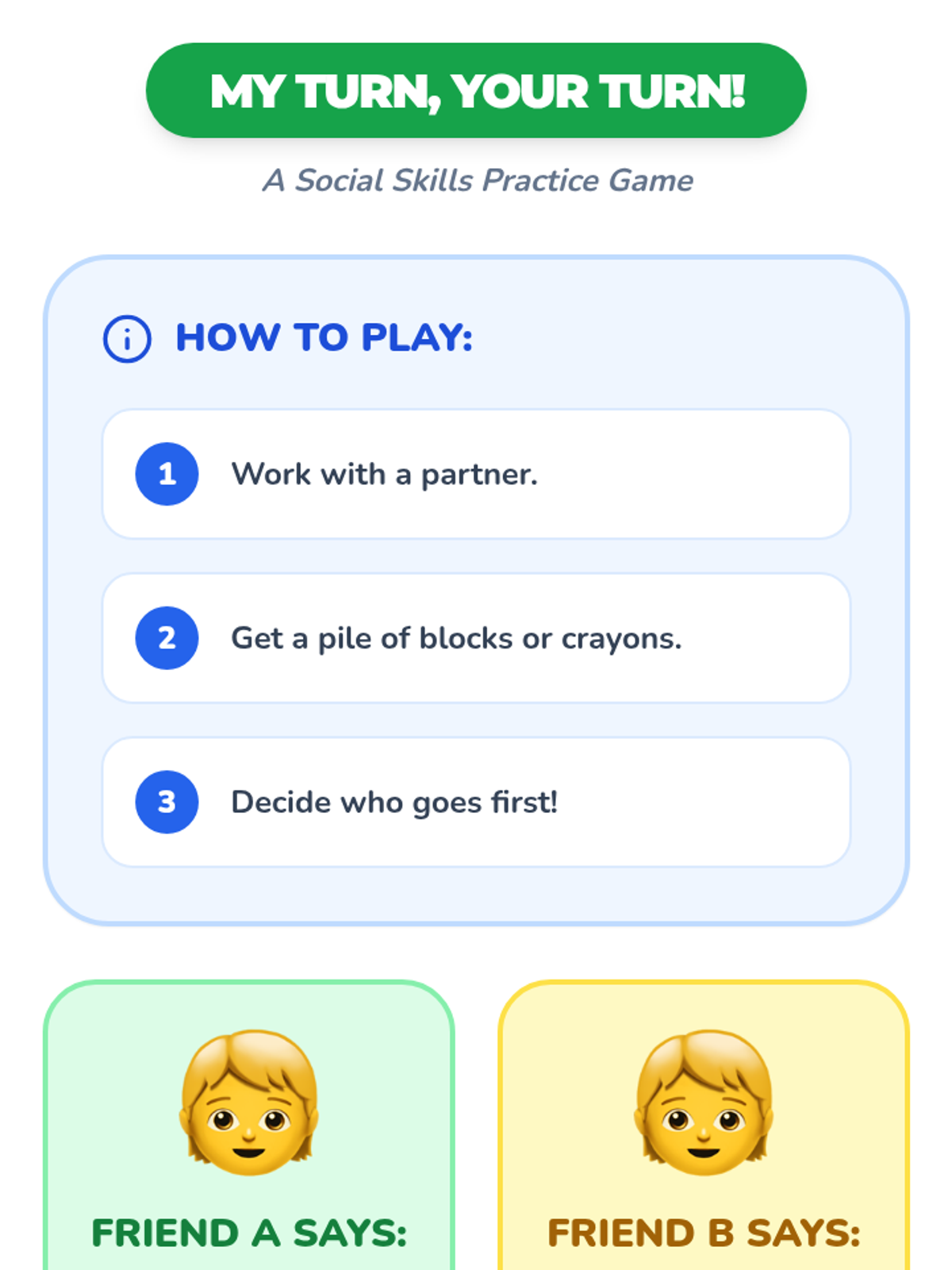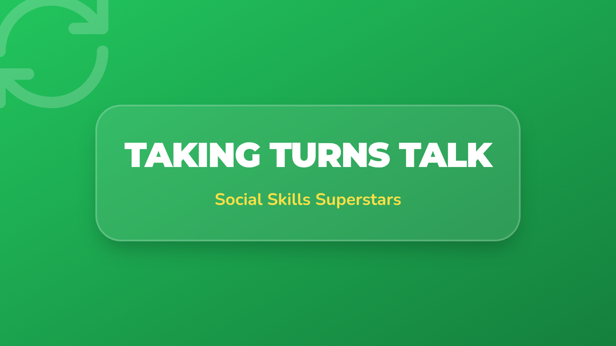 Focuses on the importance of taking turns in conversation and play, providing explicit practice with the phrases 'My turn' and 'Your turn'.
