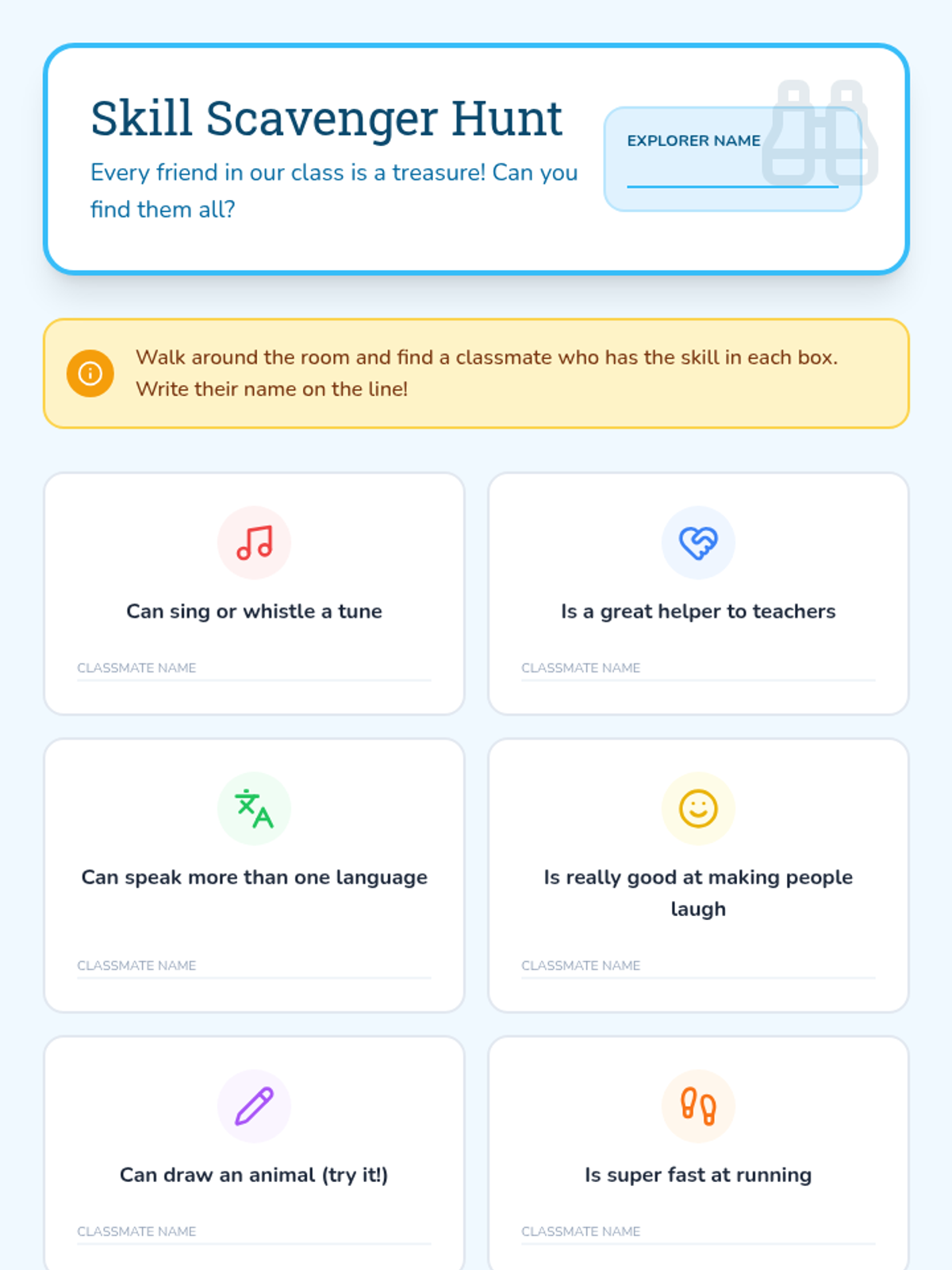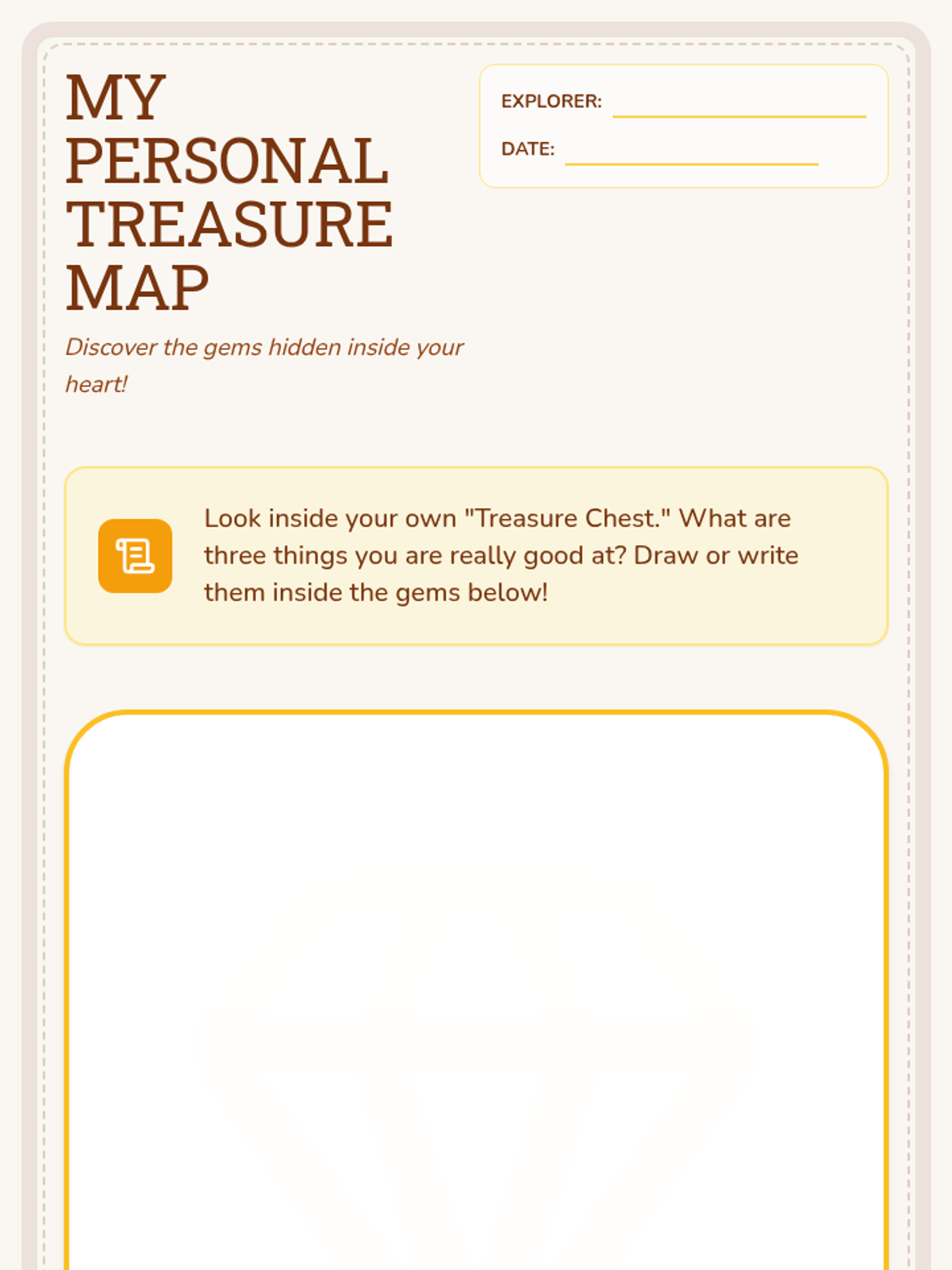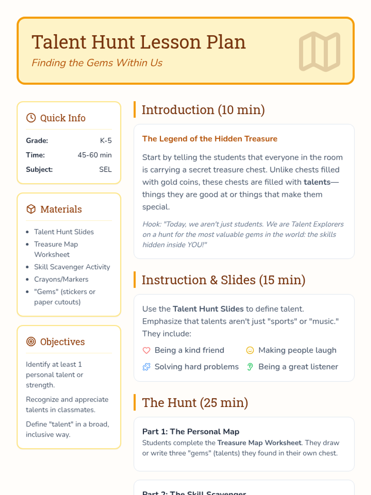 A lesson designed for K-5 students to identify and celebrate their unique talents through interactive storytelling, a classroom treasure hunt, and creative drawing activities. Students will build self-esteem and learn to appreciate the diverse strengths of their peers.