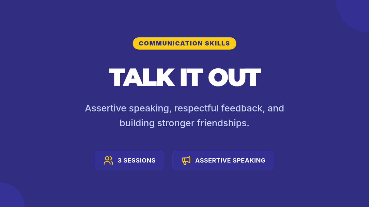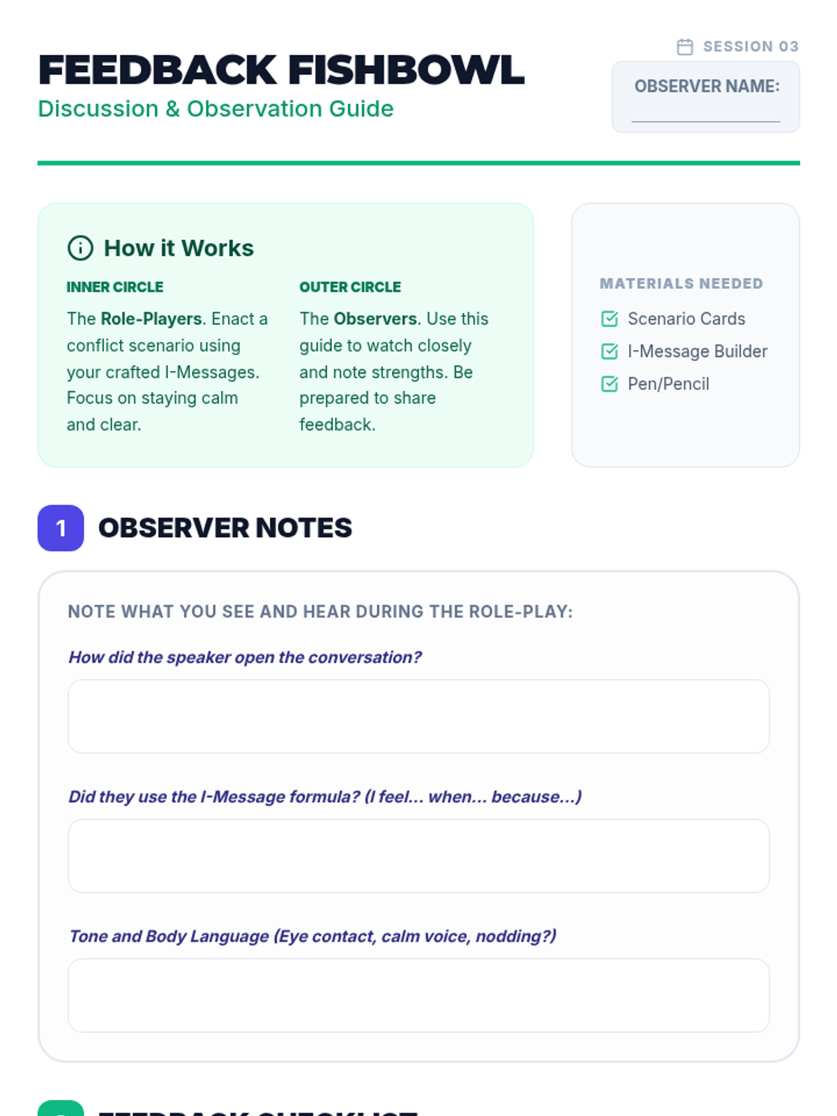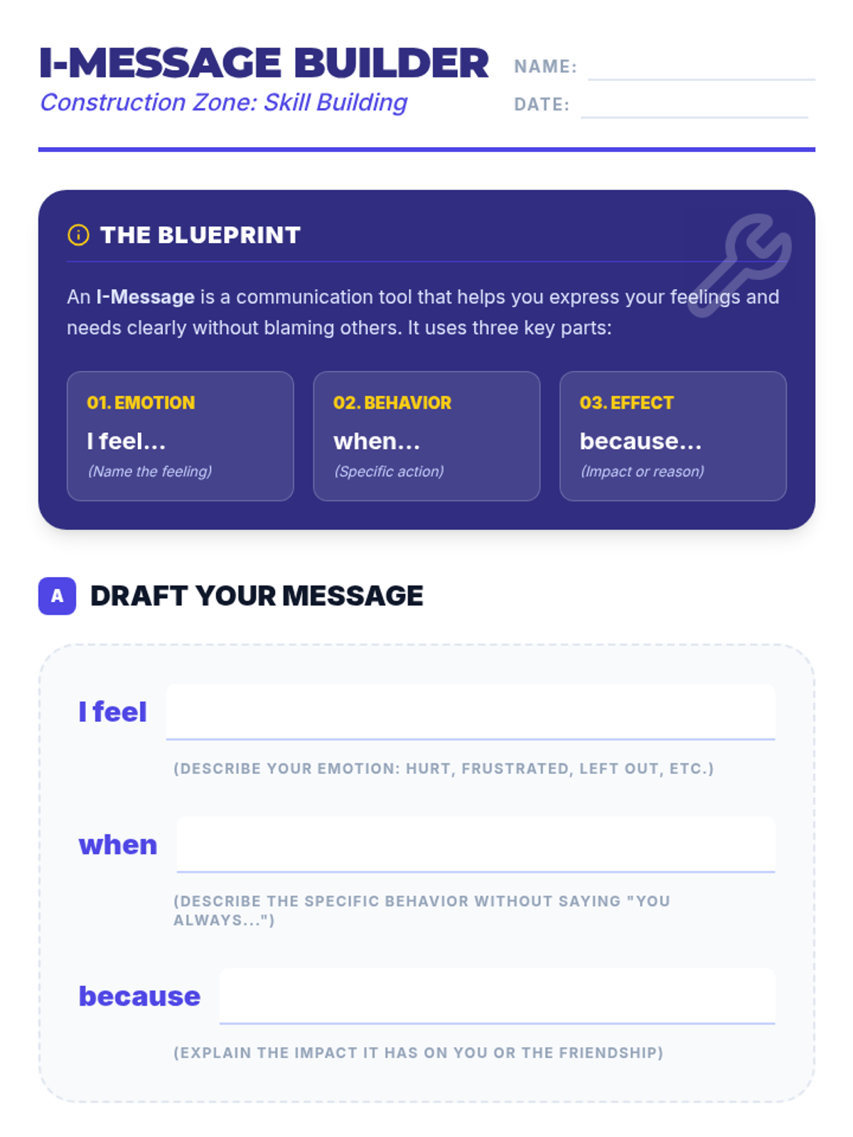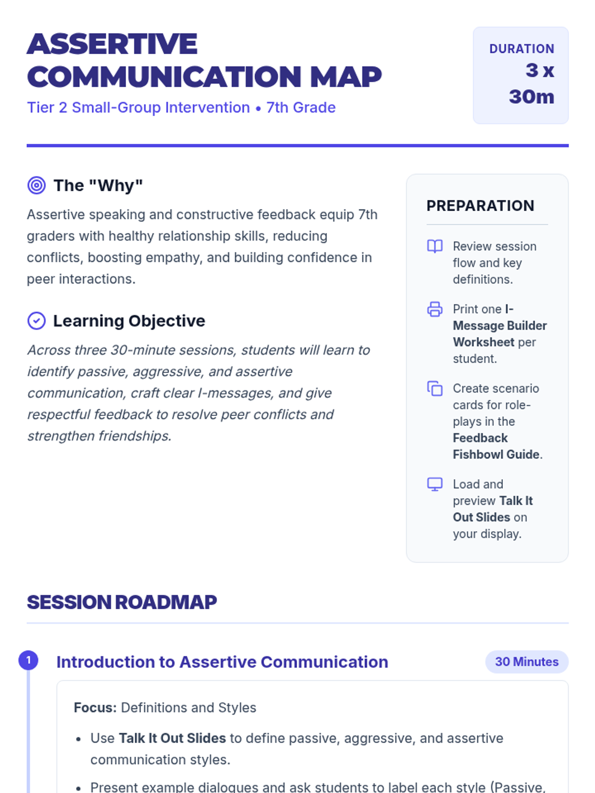 A series of three 30-minute sessions designed to help students transition from passive or aggressive communication to assertive speaking using I-messages and constructive feedback.
