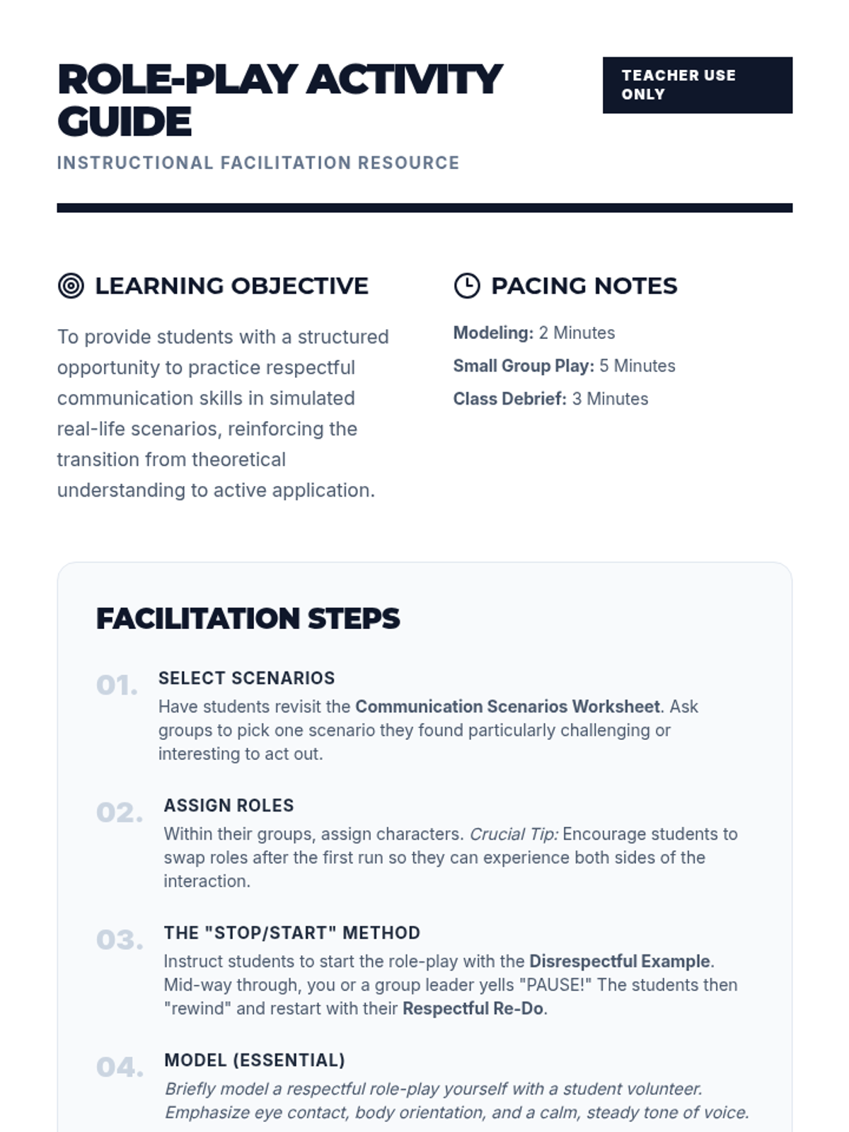 A 30-minute middle school lesson focused on developing essential social skills including active listening, empathy, and conflict resolution through interactive scenarios and games.