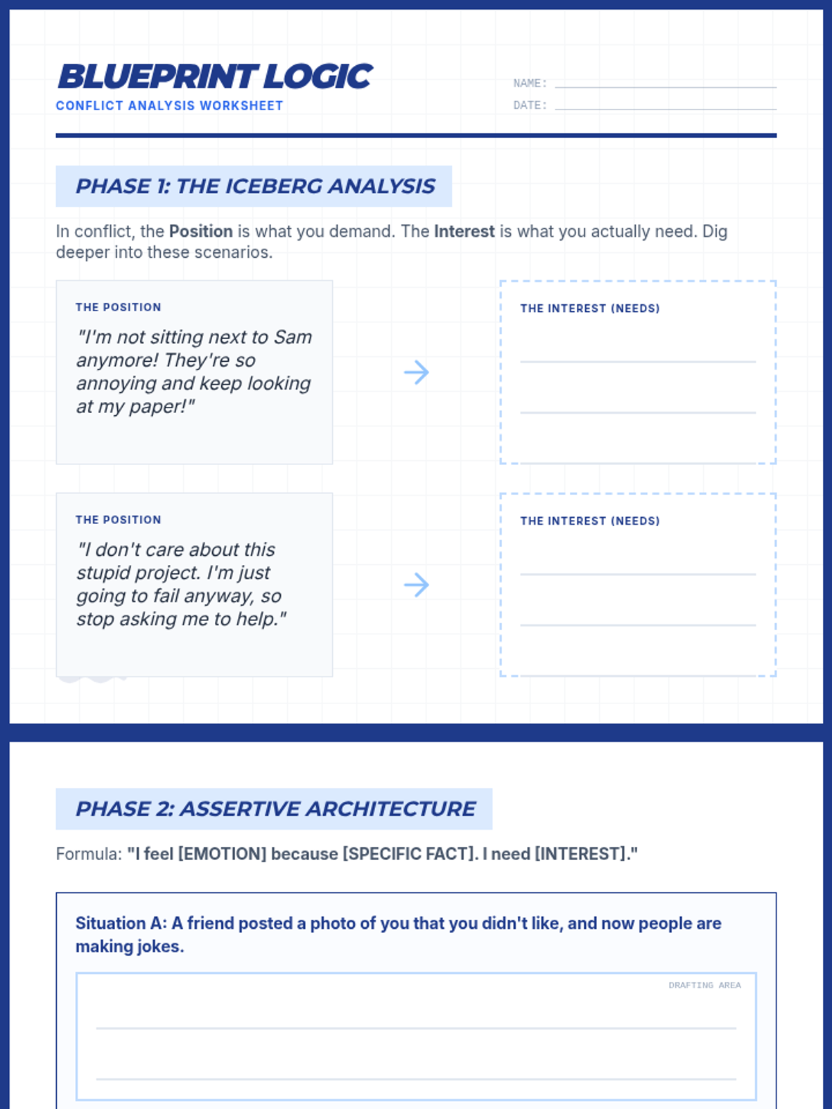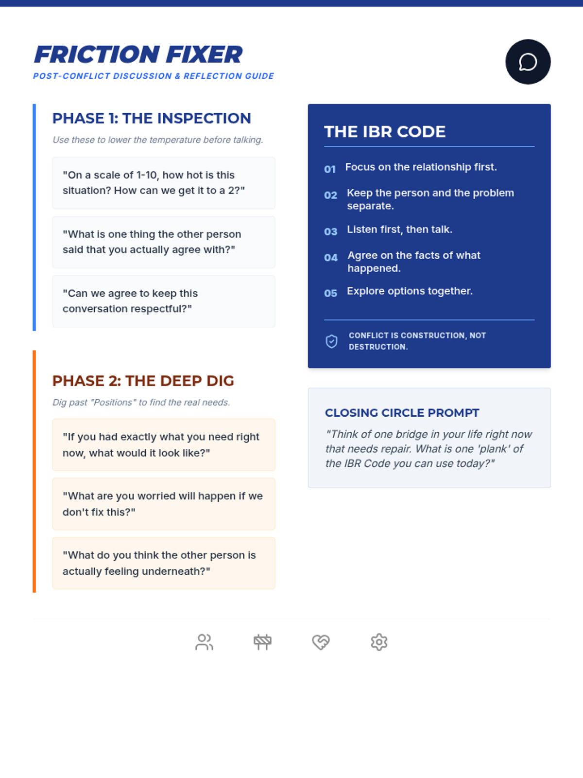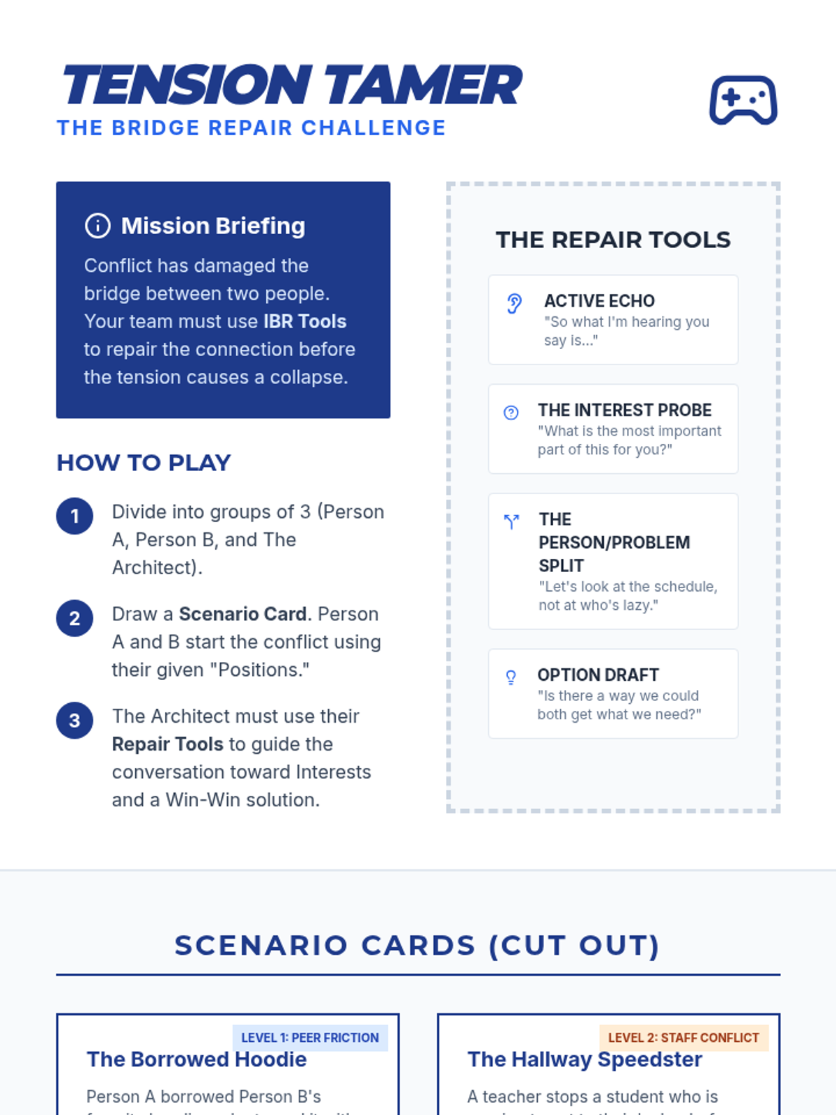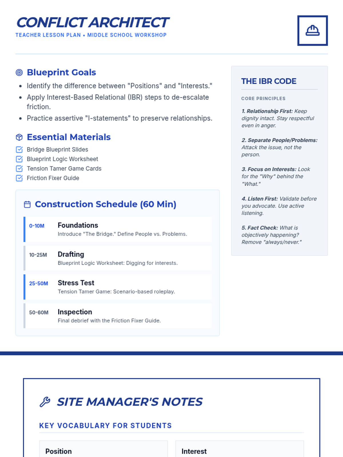 A workshop on de-escalation and Interest-Based Relational (IBR) communication strategies for middle schoolers. Students learn to separate people from problems and identify underlying interests to resolve conflicts effectively.