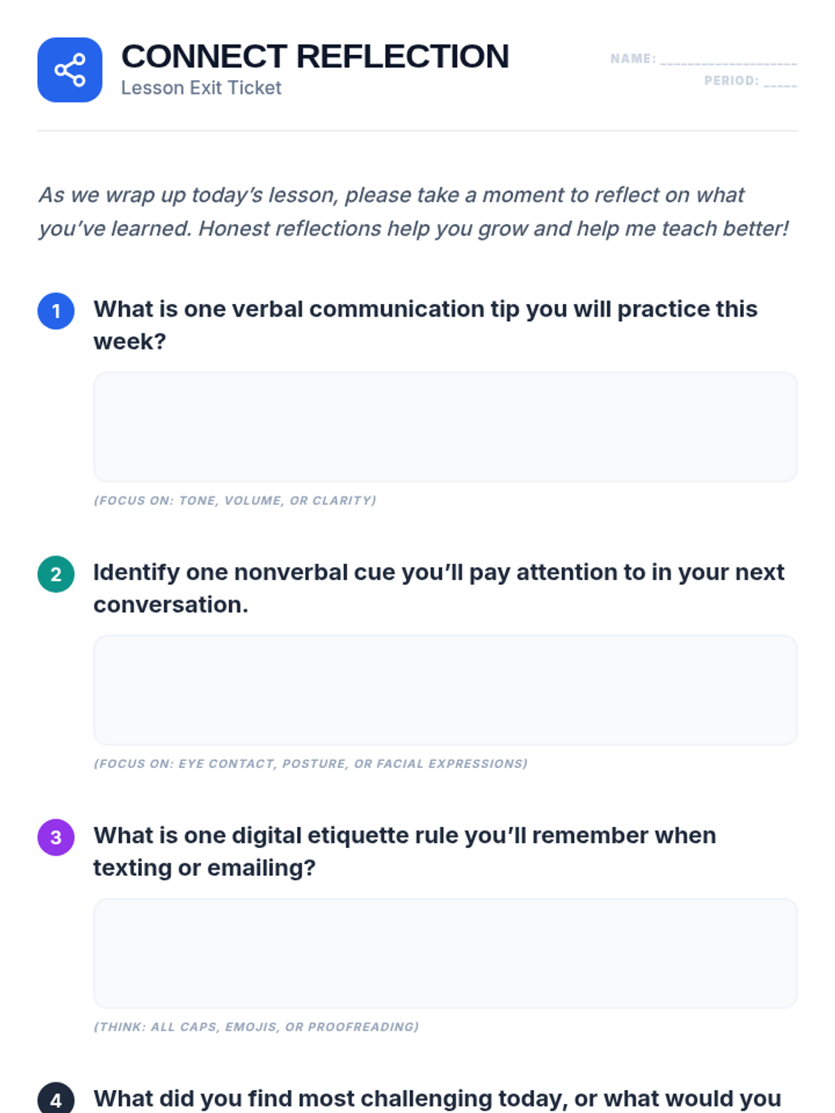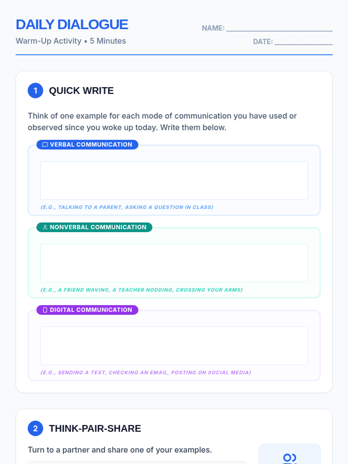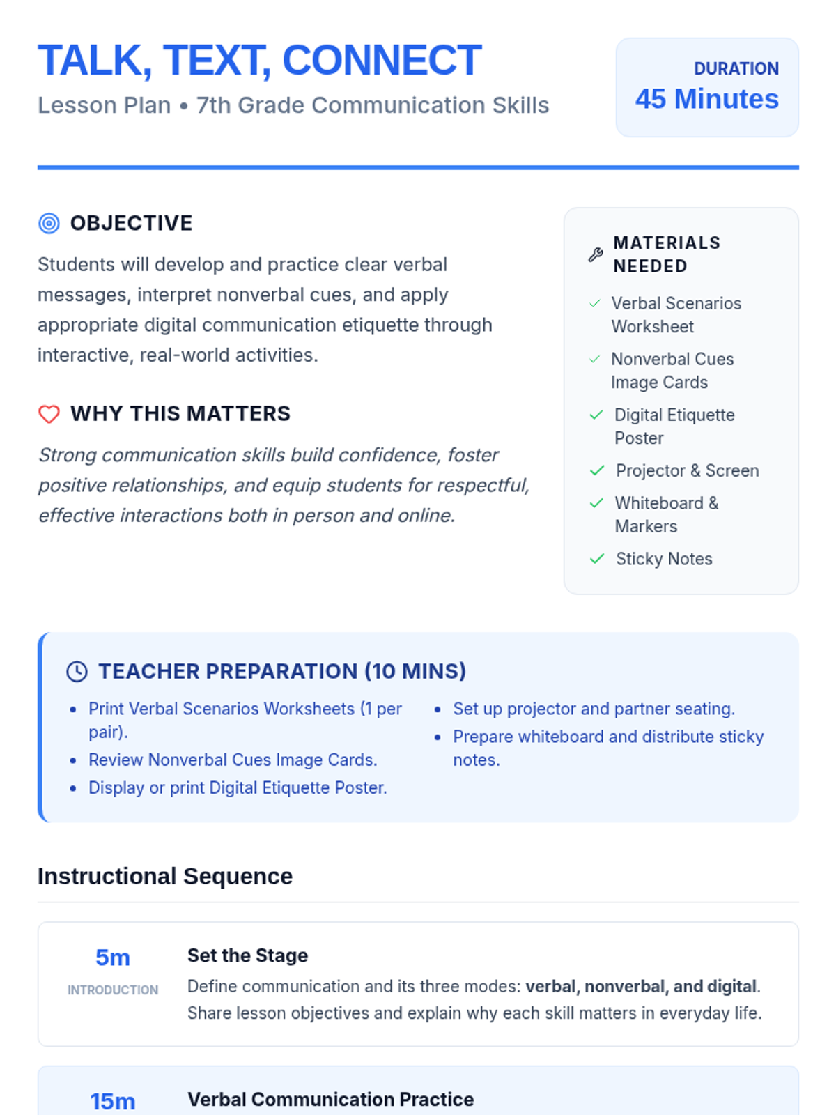 A 45-minute lesson for 7th graders on verbal, nonverbal, and digital communication skills, including role-plays, image analysis, and etiquette brainstorming.