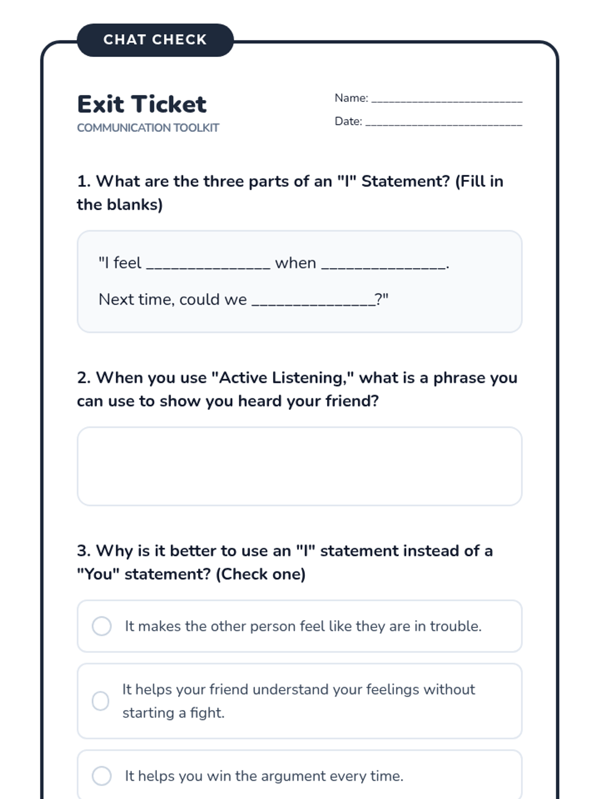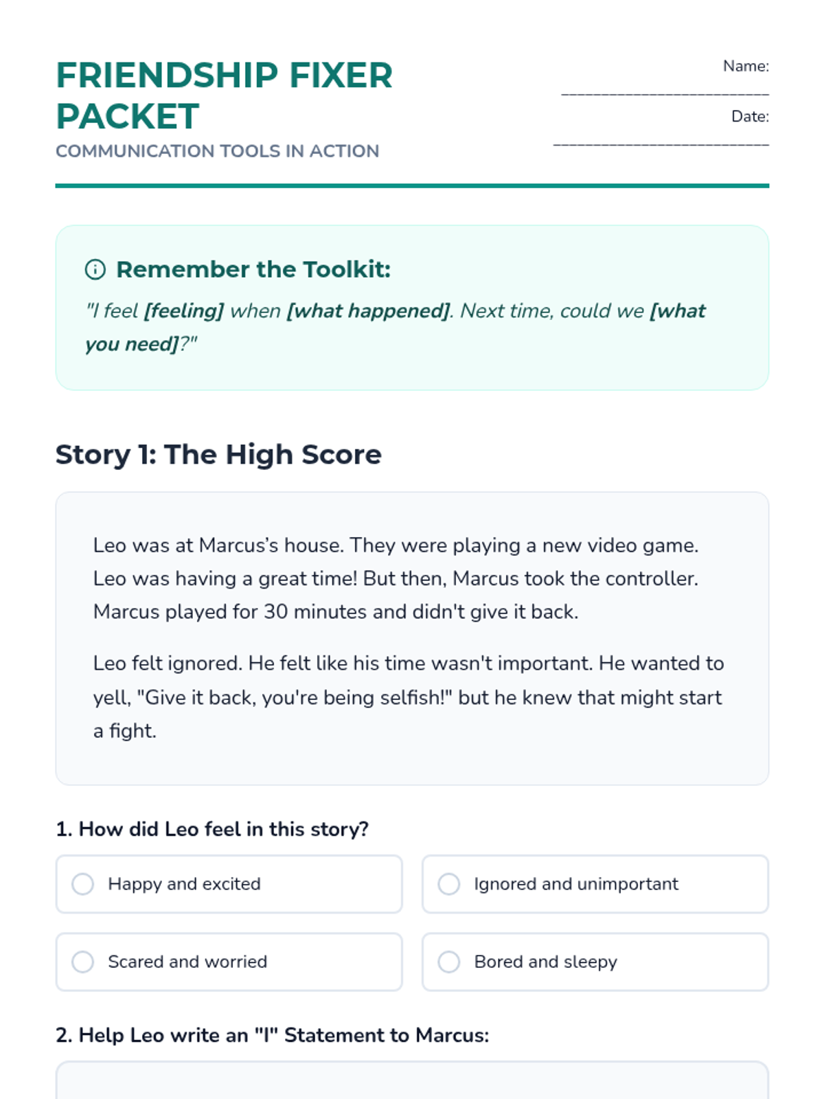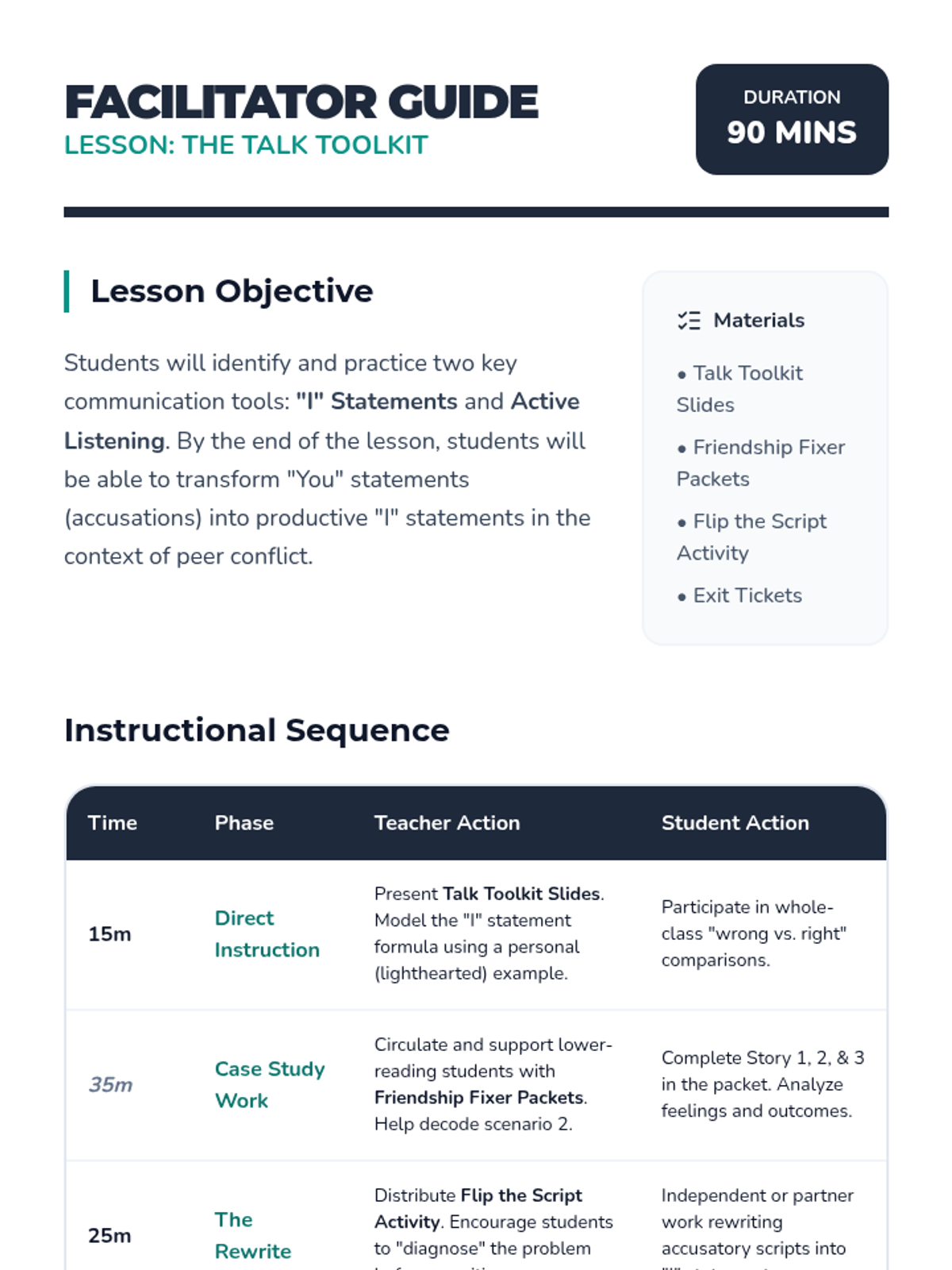 A 90-minute lesson designed for 5th graders with lower reading levels, focusing on effective communication skills like 'I' statements and active listening through relatable scenarios.