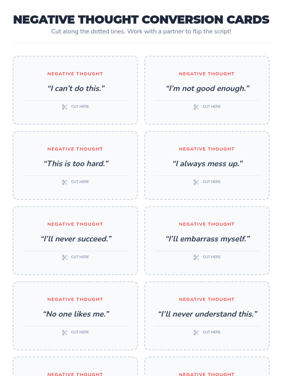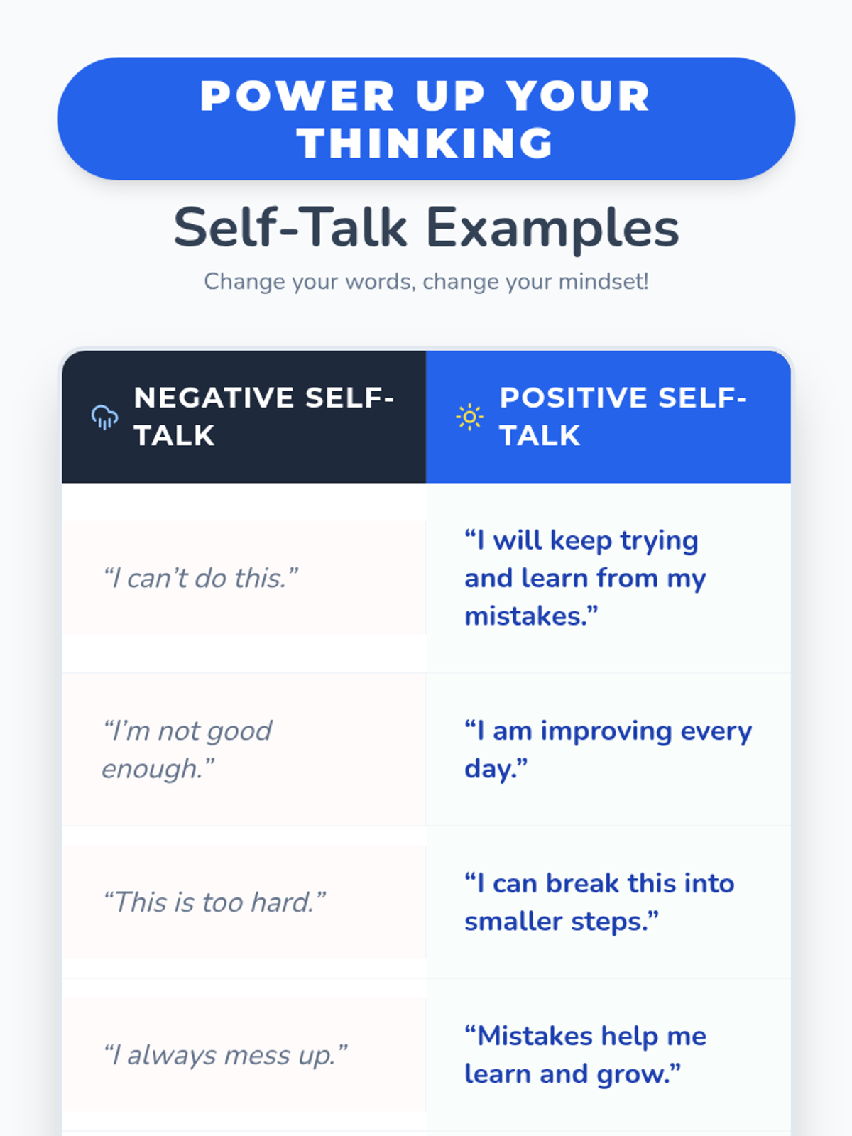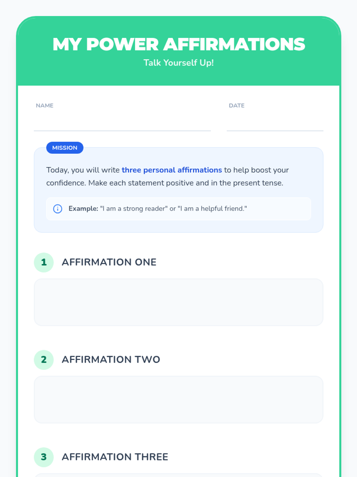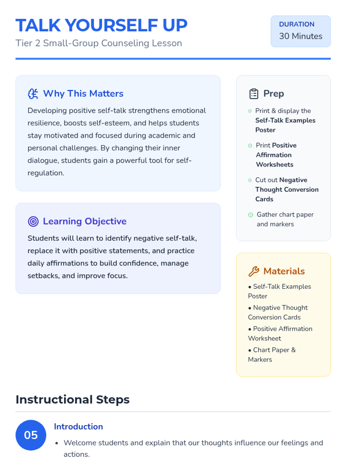 In this one-session, 30-minute Tier 2 small-group lesson, 4th graders will learn how to use positive self-talk to boost confidence, manage setbacks, and improve focus. This lesson helps students recognize negative inner dialogue and replace it with supportive affirmations.