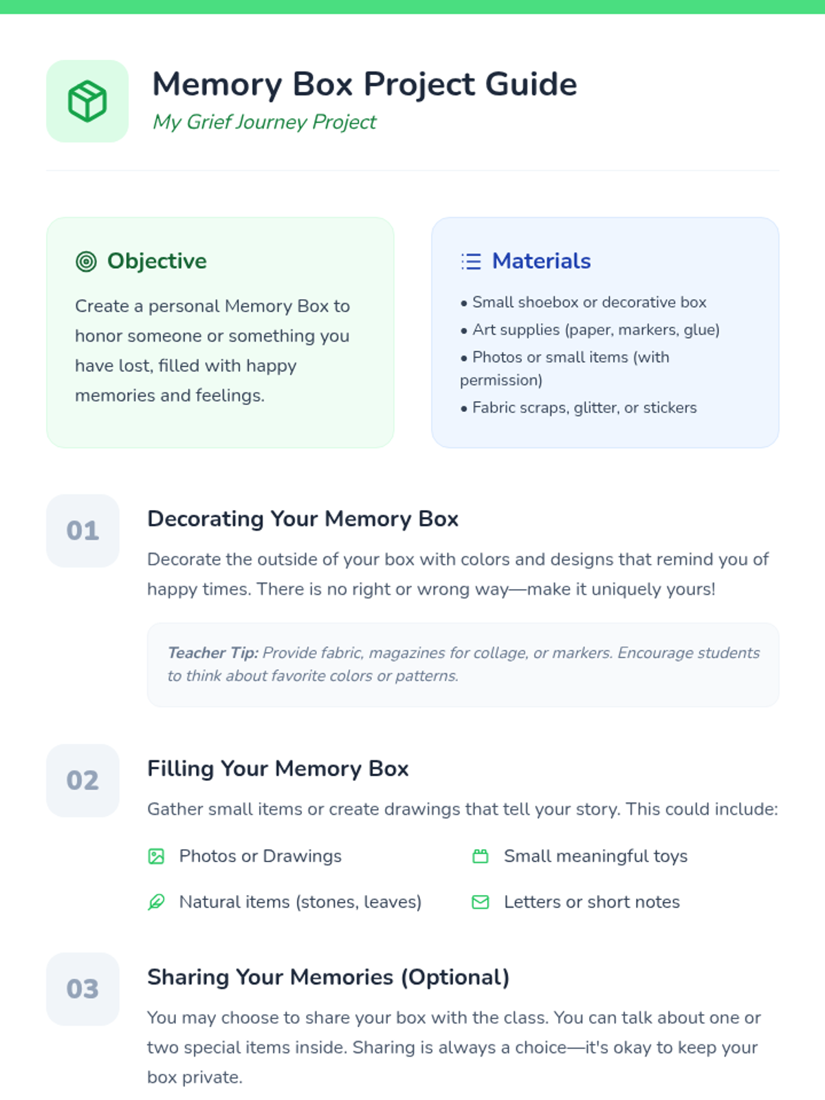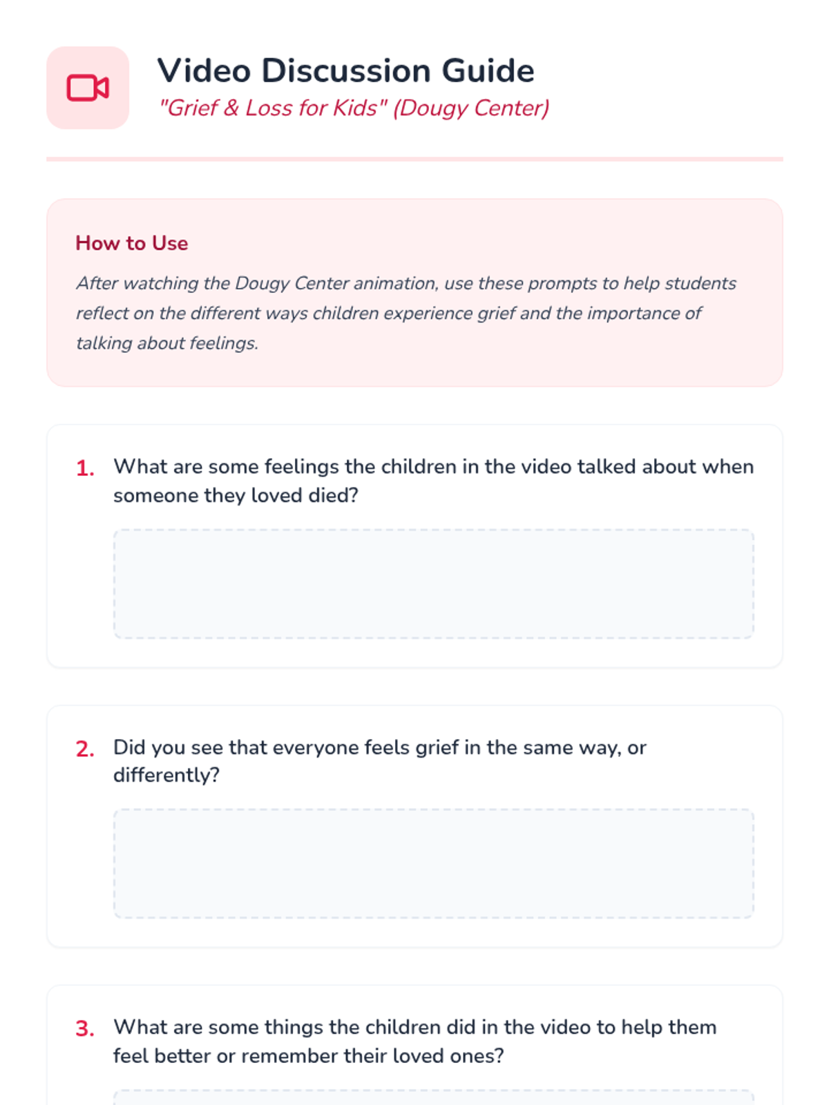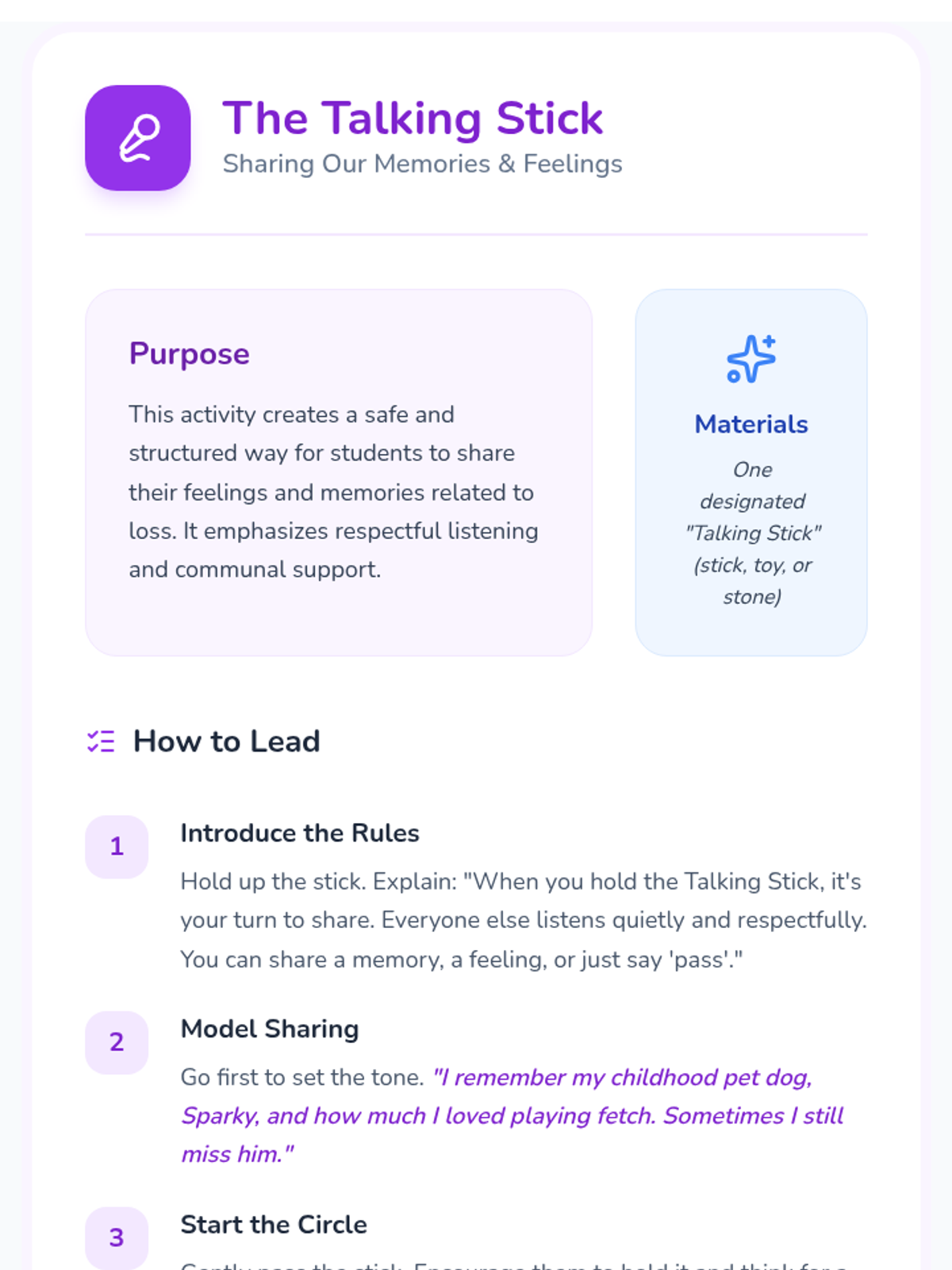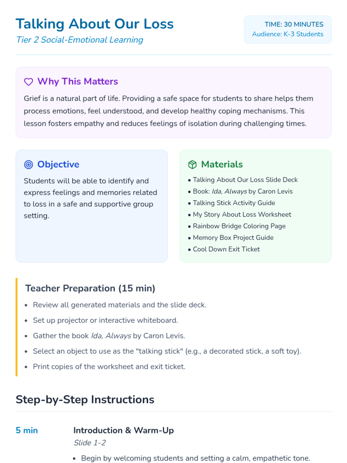 A 30-minute Tier 2 group lesson for K-3 students to help them process feelings and memories related to loss in a safe, supportive environment.