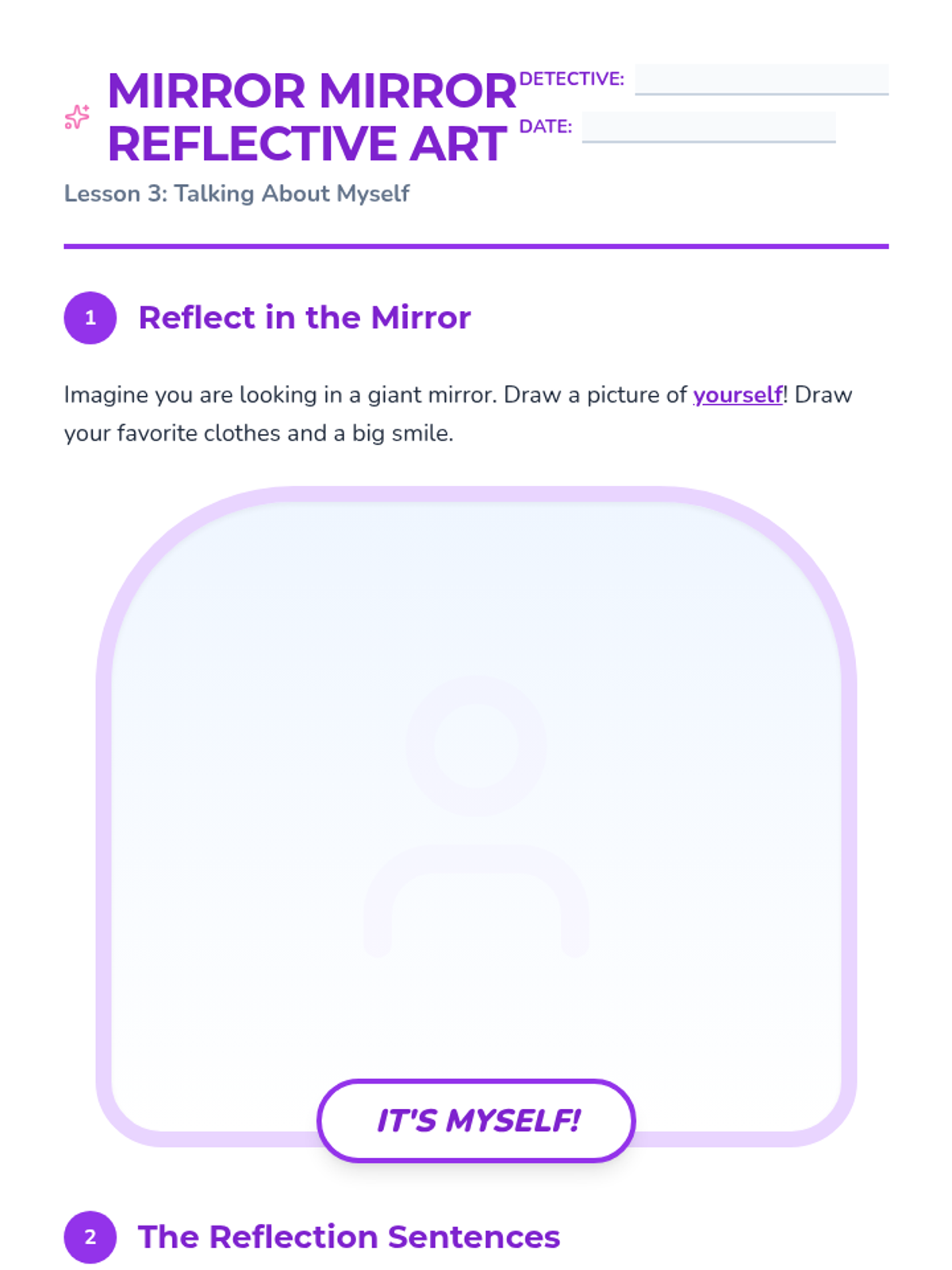 Introduces reflexive pronouns using 'myself' and 'yourself' through mirror activities and personal presentations.