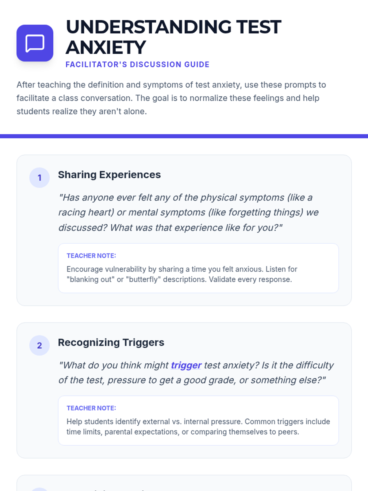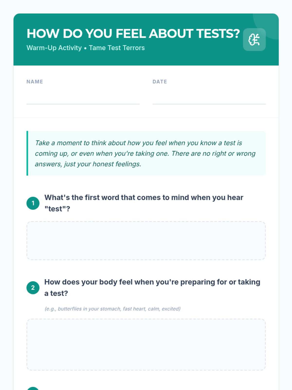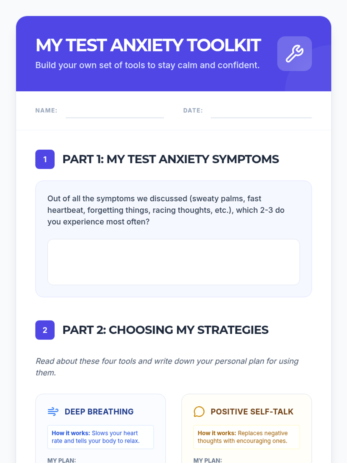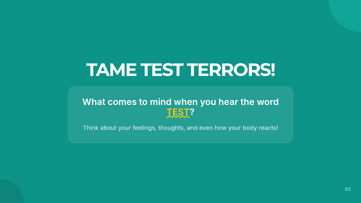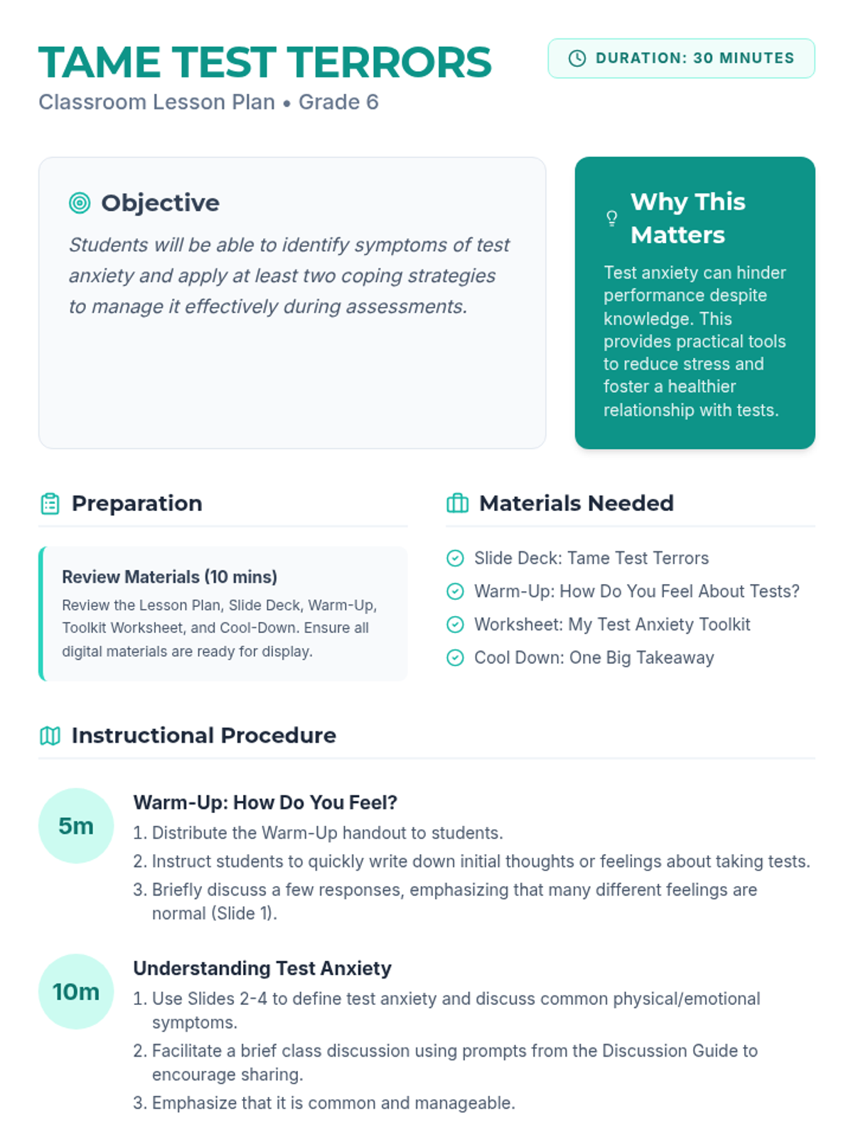 A 30-minute lesson for 6th graders to identify symptoms of test anxiety and learn practical coping strategies like deep breathing and positive self-talk.