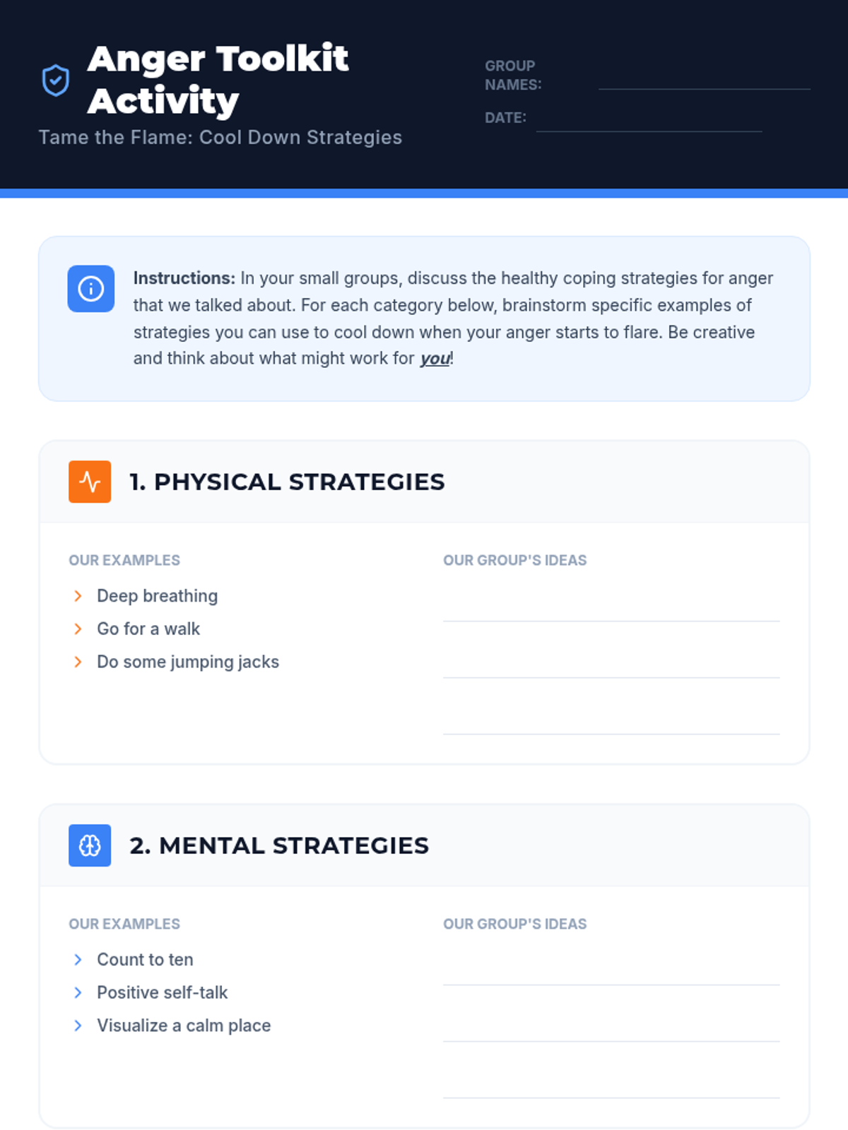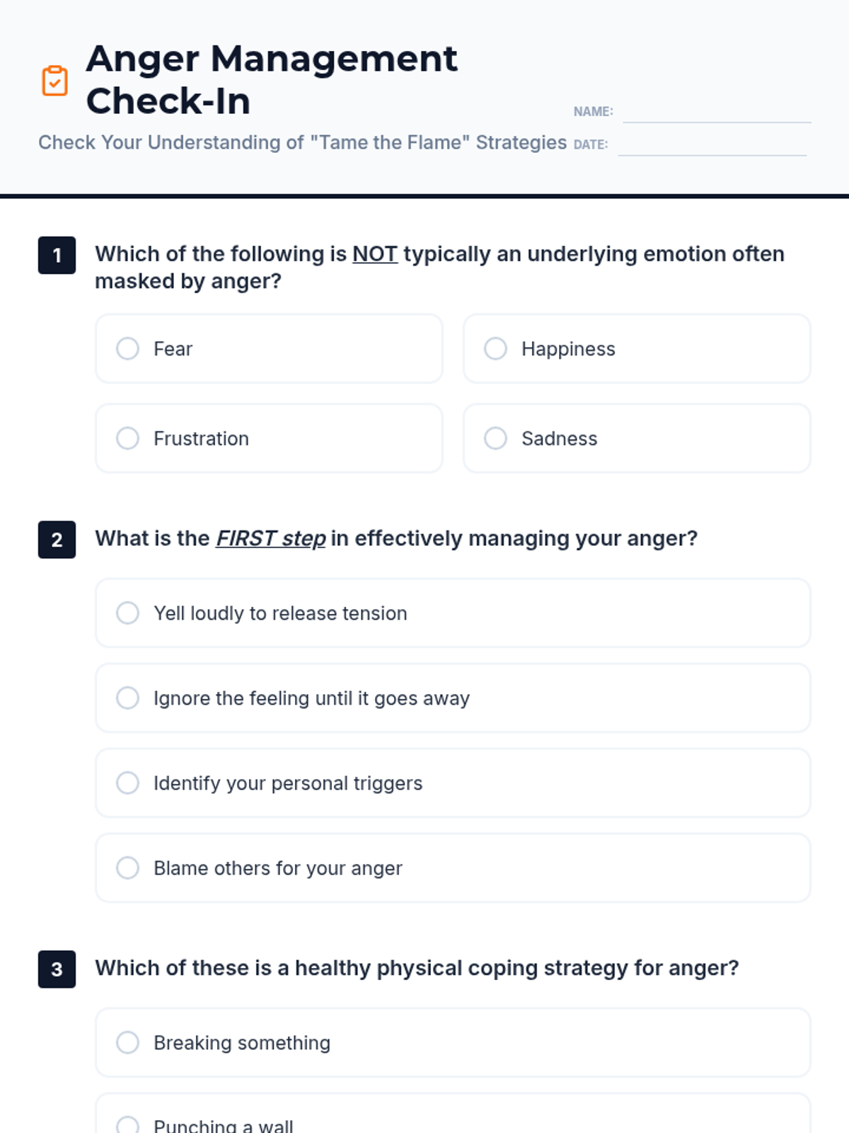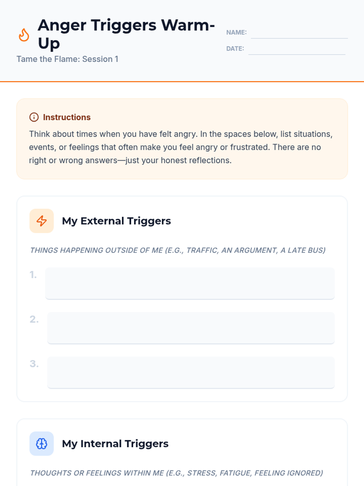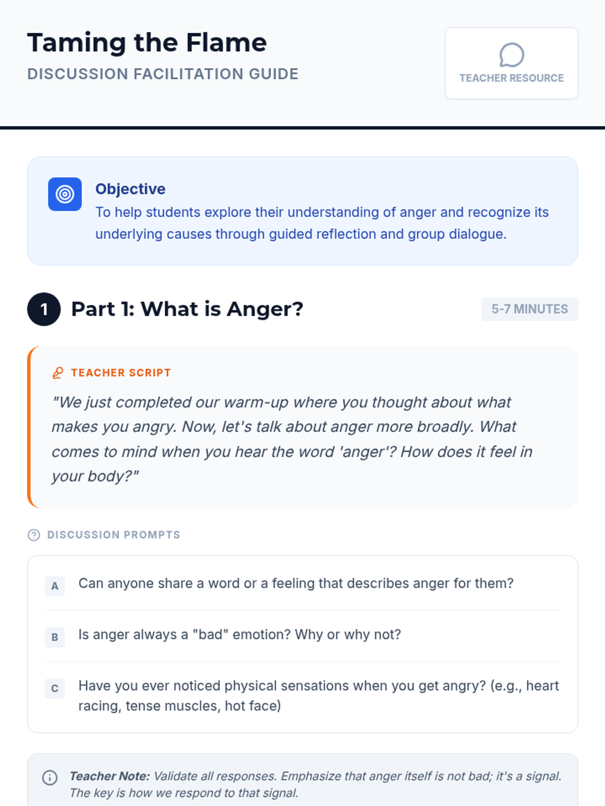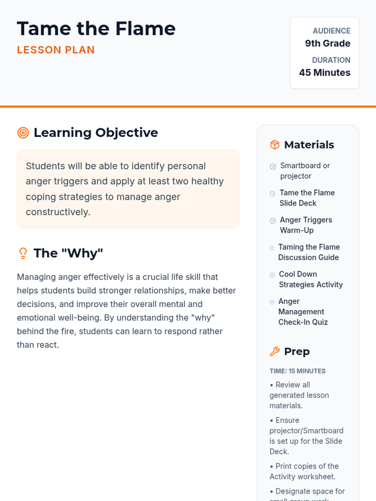 This lesson helps 9th graders understand and manage their anger effectively. It covers identifying triggers, healthy coping mechanisms, and communication skills to navigate challenging emotions constructively. Designed for a single 45-minute session for a class of 20 9th-grade students.