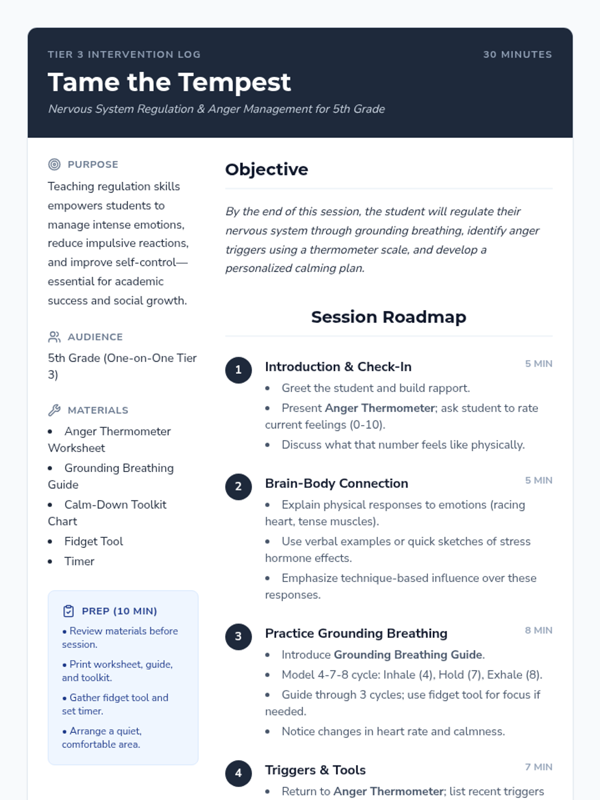 A 30-minute one-on-one Tier 3 session for 5th graders to learn nervous system regulation and anger management techniques, including grounding breathing and personalized calming plans.