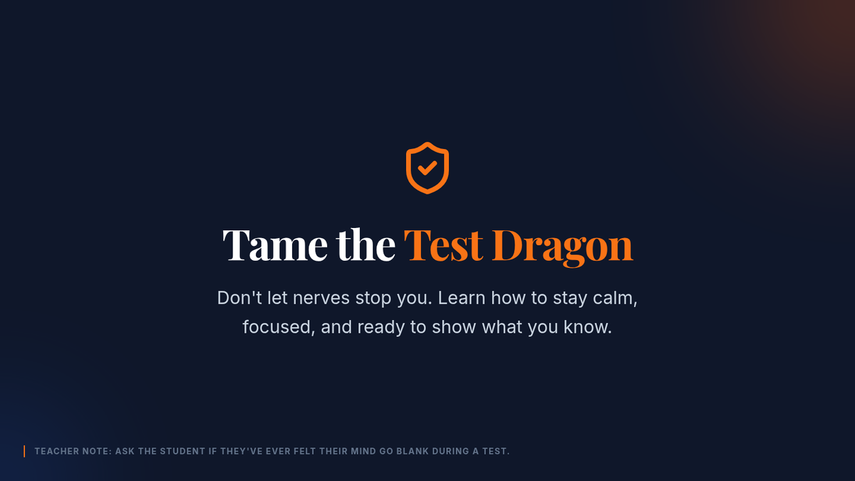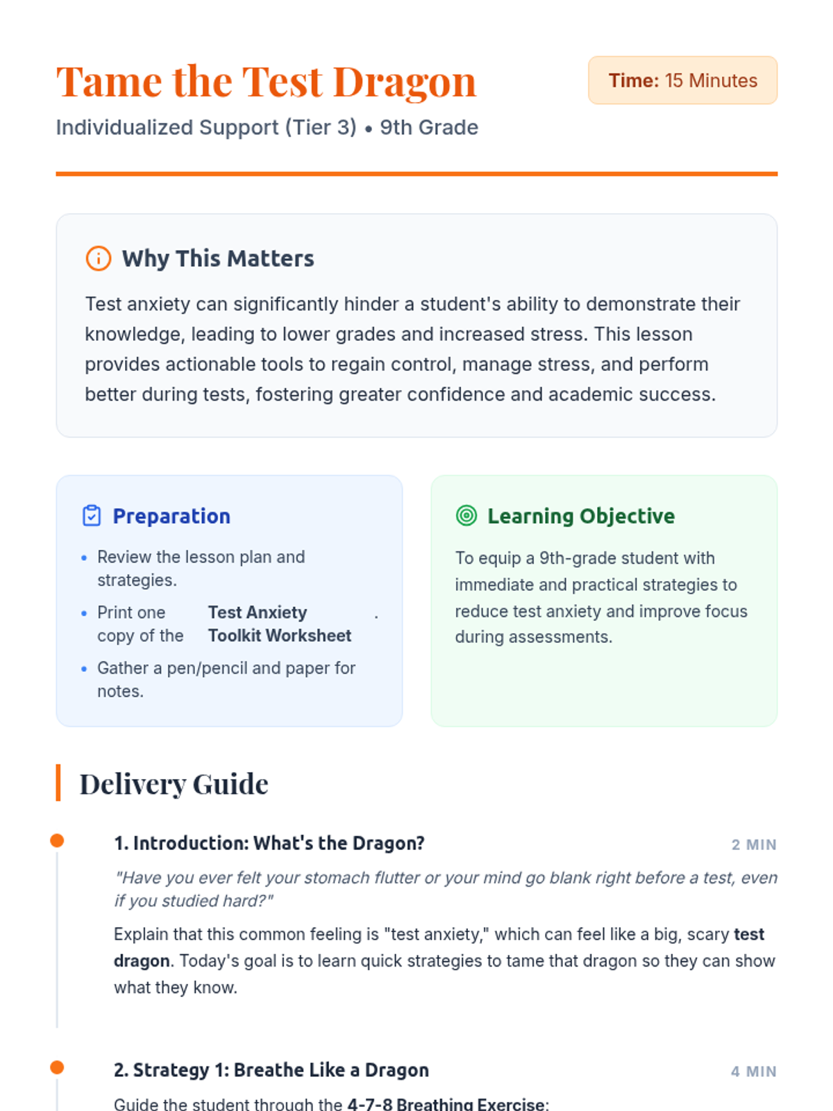 A 15-minute Tier 3 individualized lesson for 9th-grade students to manage test anxiety using cognitive and relaxation techniques like deep breathing and positive self-talk.