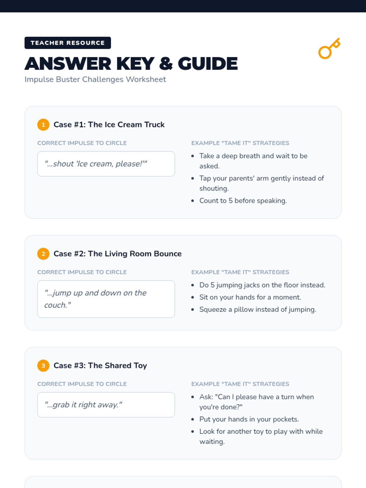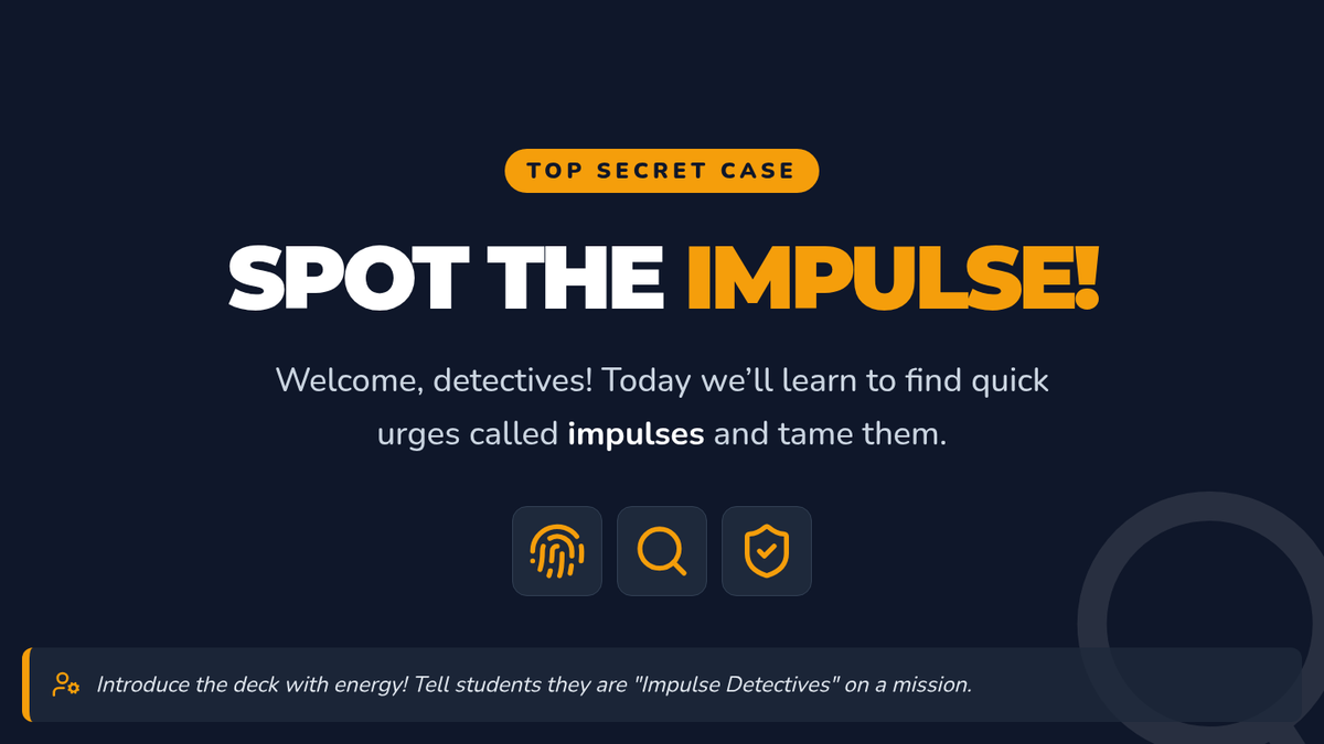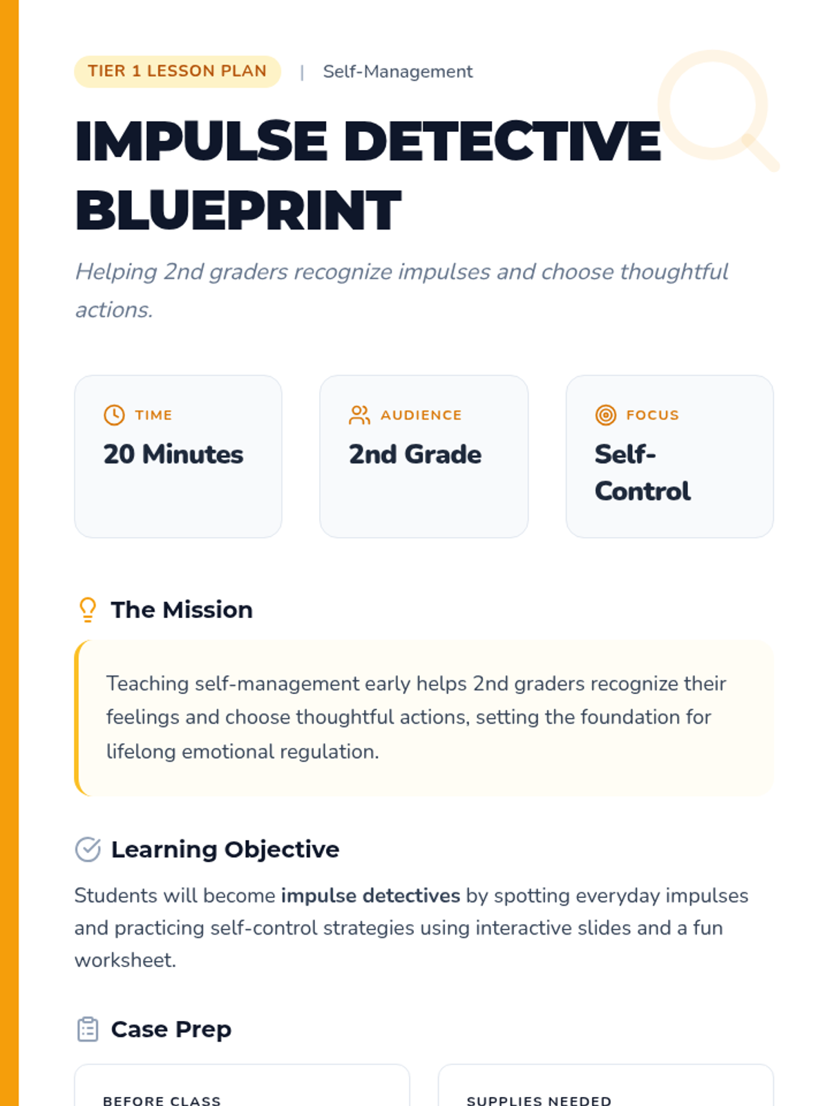 A 20-minute Tier 1 classroom lesson for 2nd graders focused on CASEL's self-management skills, teaching students to recognize and 'tame' impulses through a detective-themed activity.