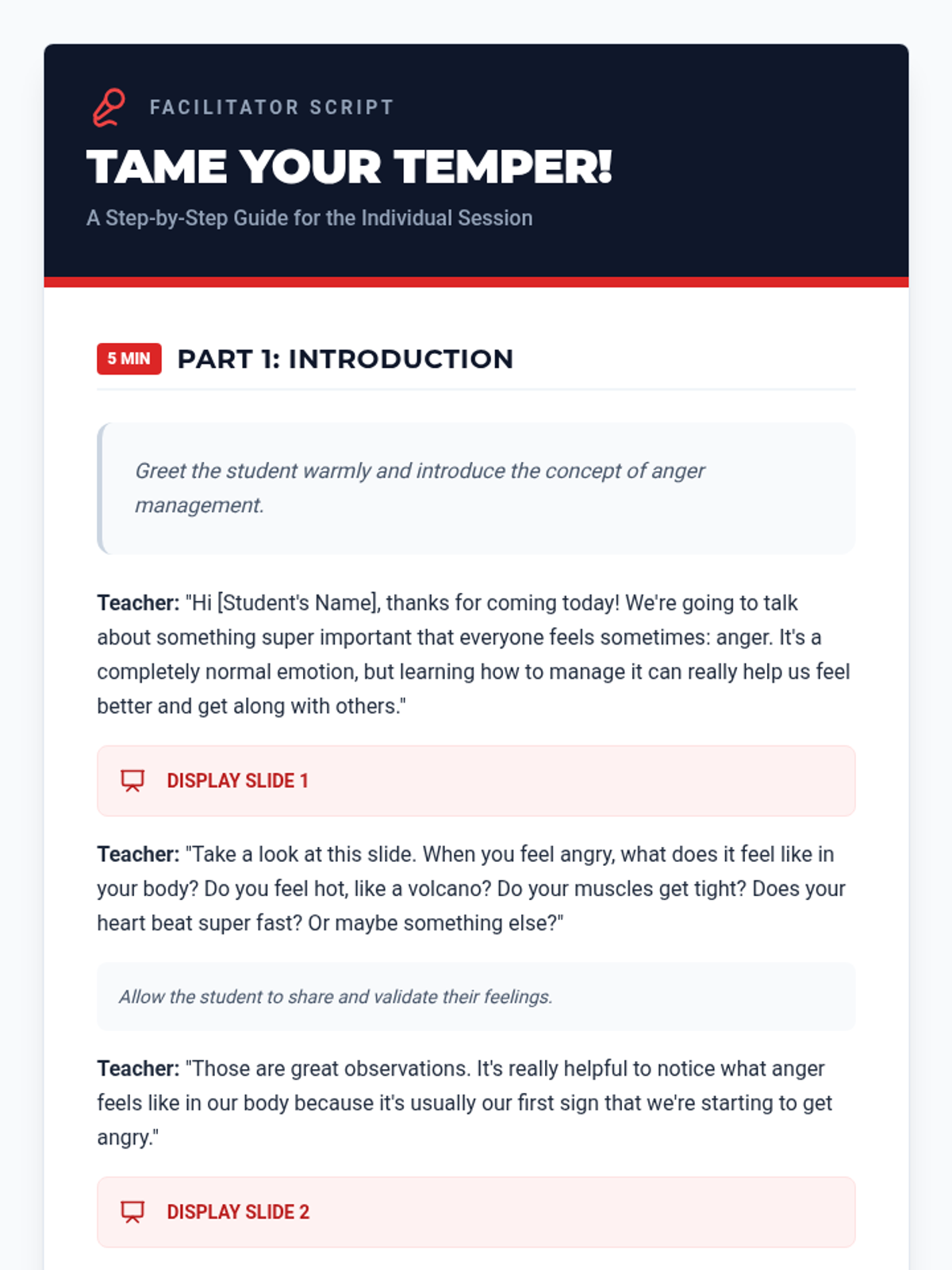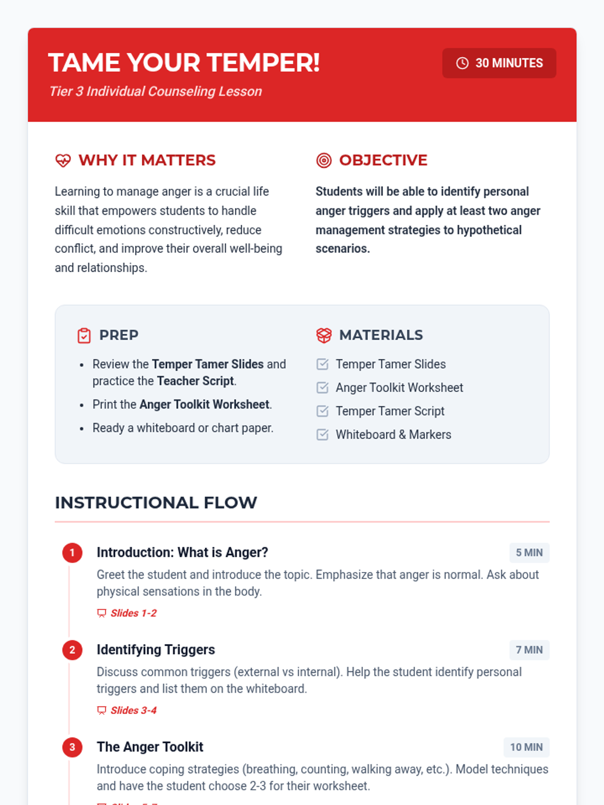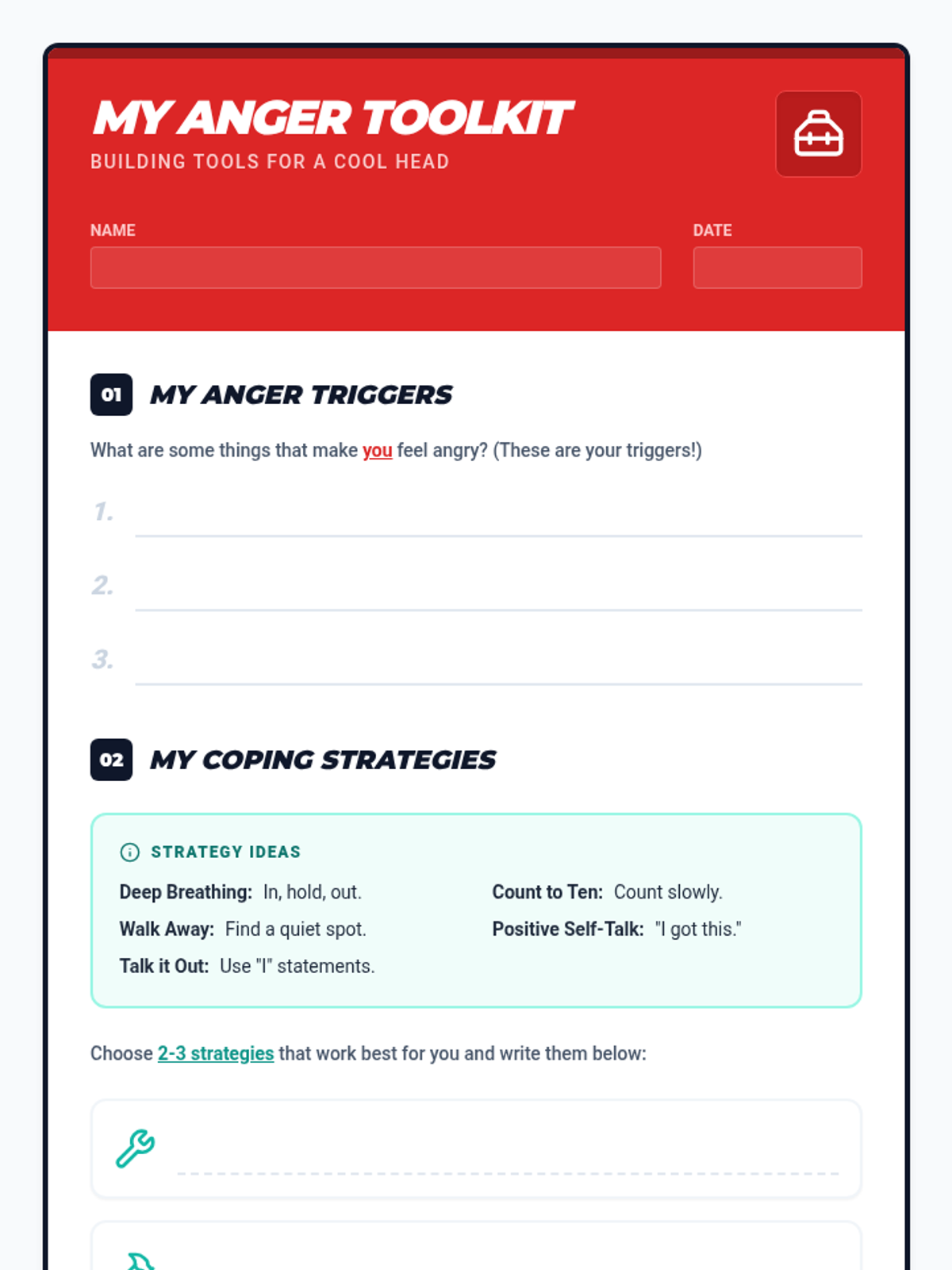 A 30-minute individual Tier 3 lesson for 5th graders focused on identifying anger triggers and building a personal 'toolkit' of coping strategies to handle difficult emotions constructively.