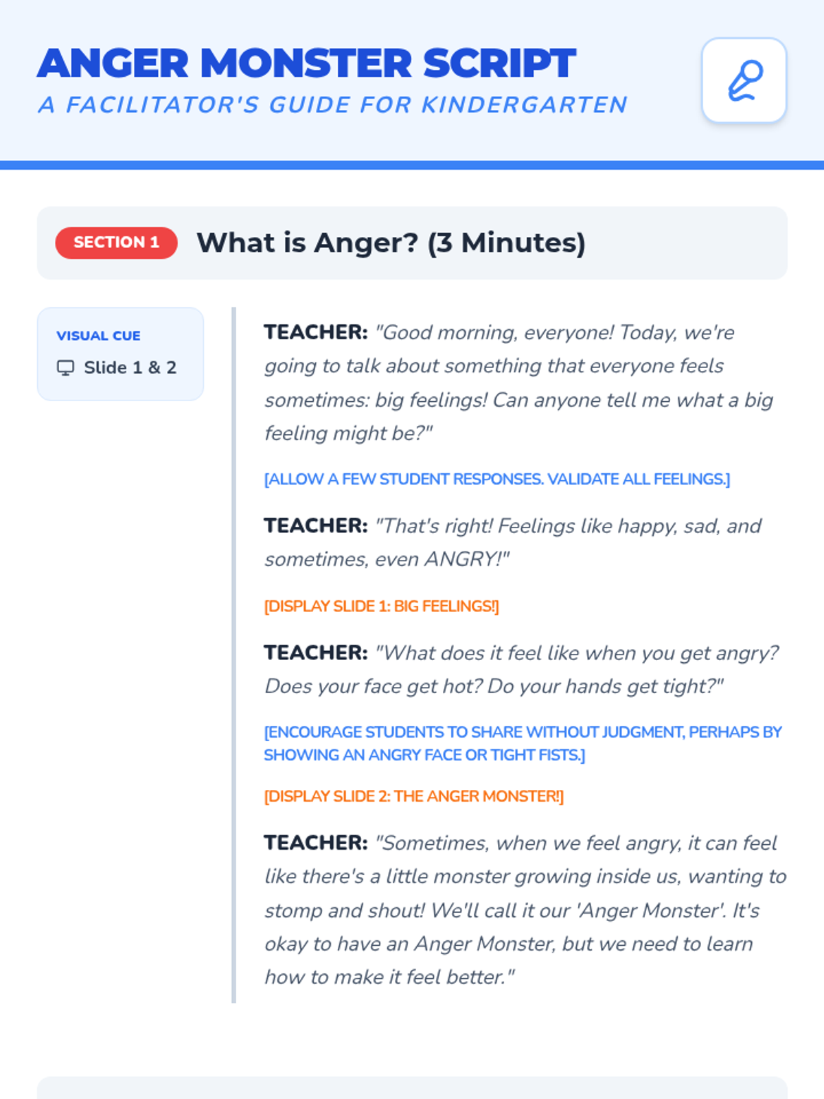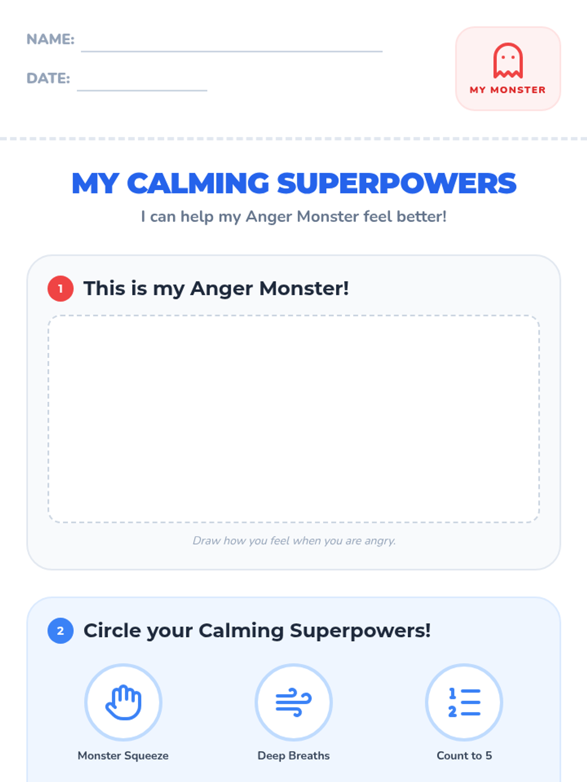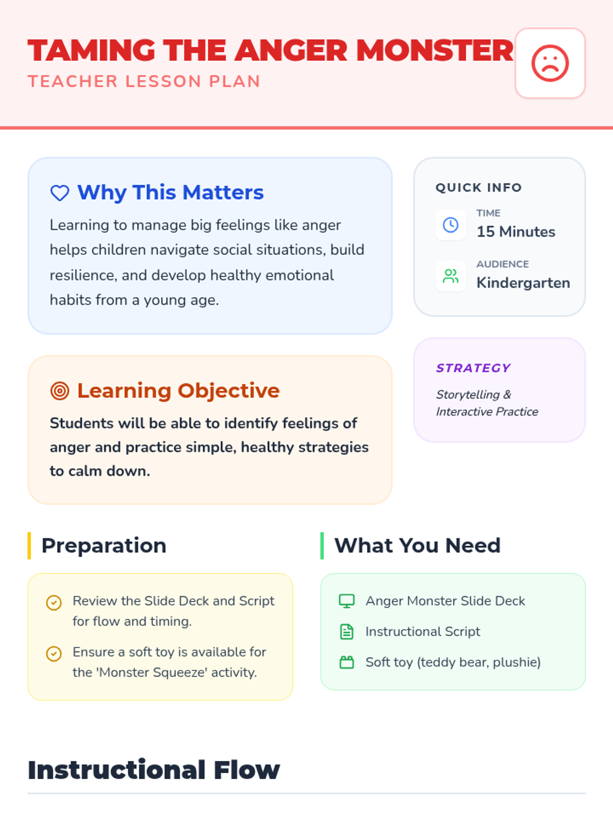 A 15-minute lesson for Kindergarteners to identify anger and practice 'Monster Squeeze' calming techniques through storytelling and interactive practice.