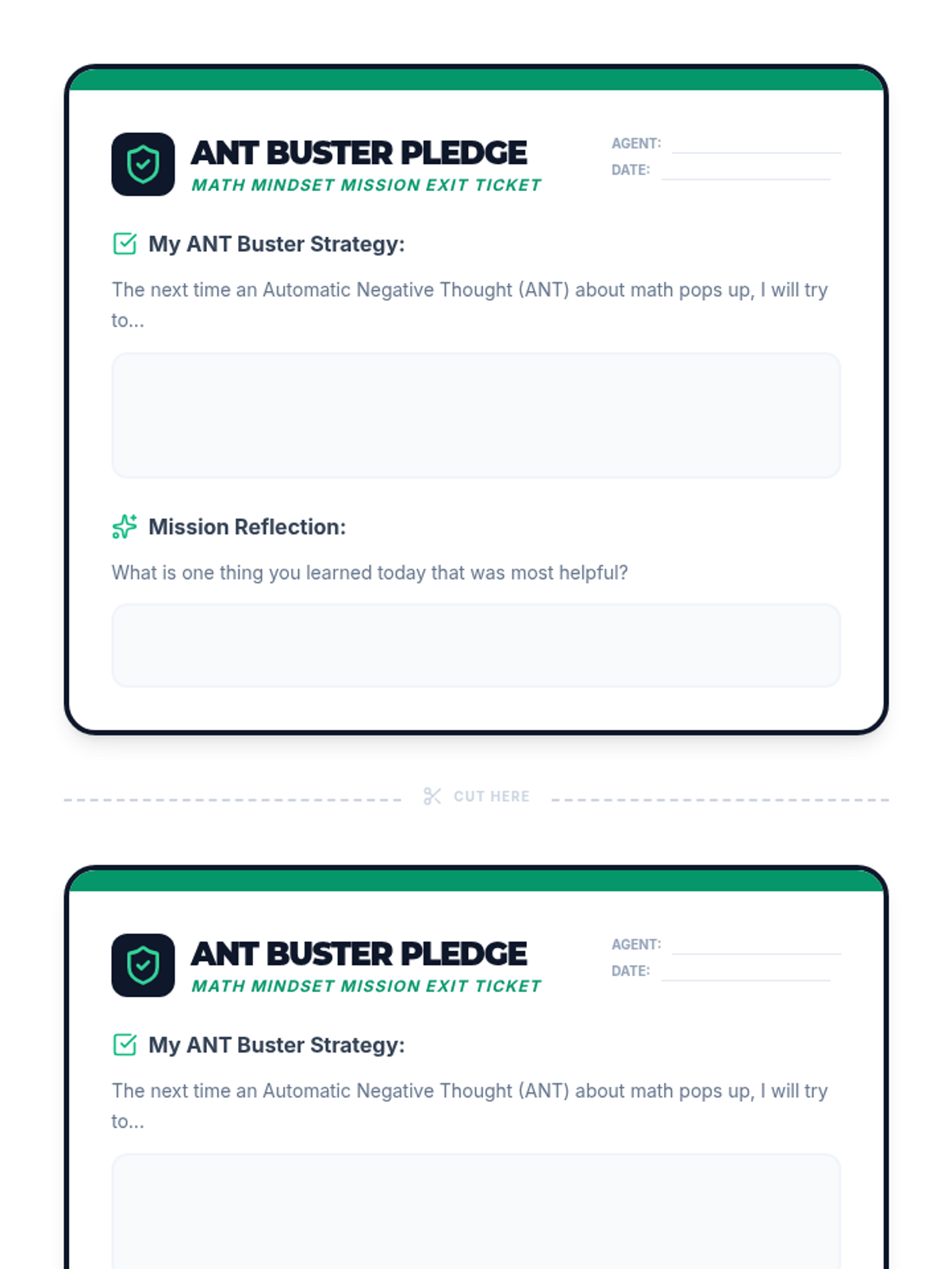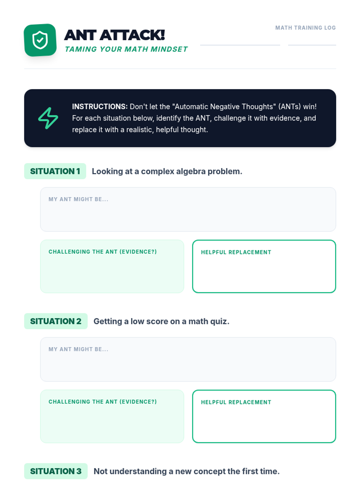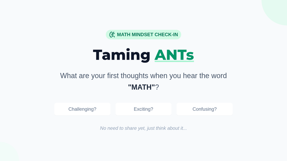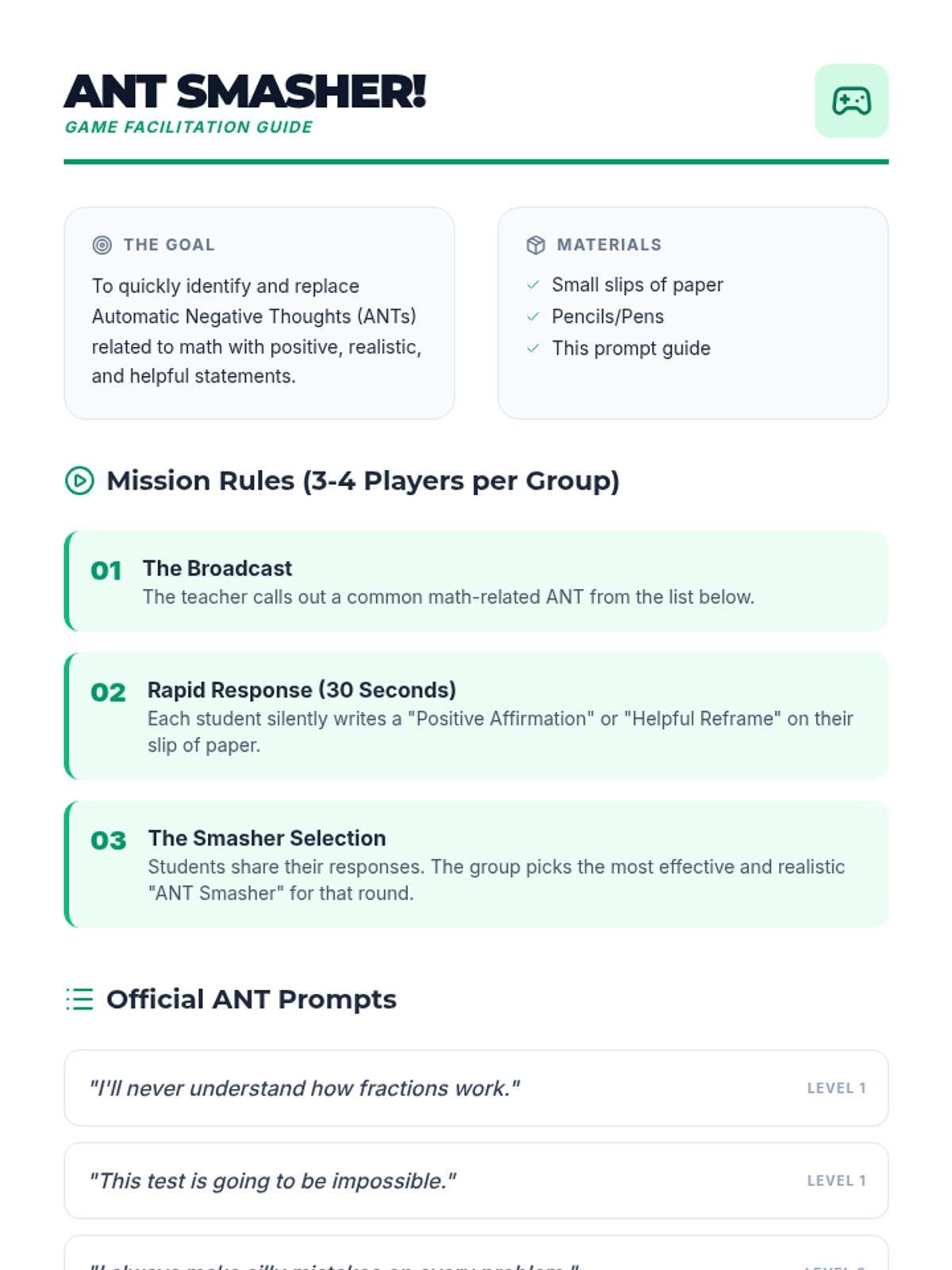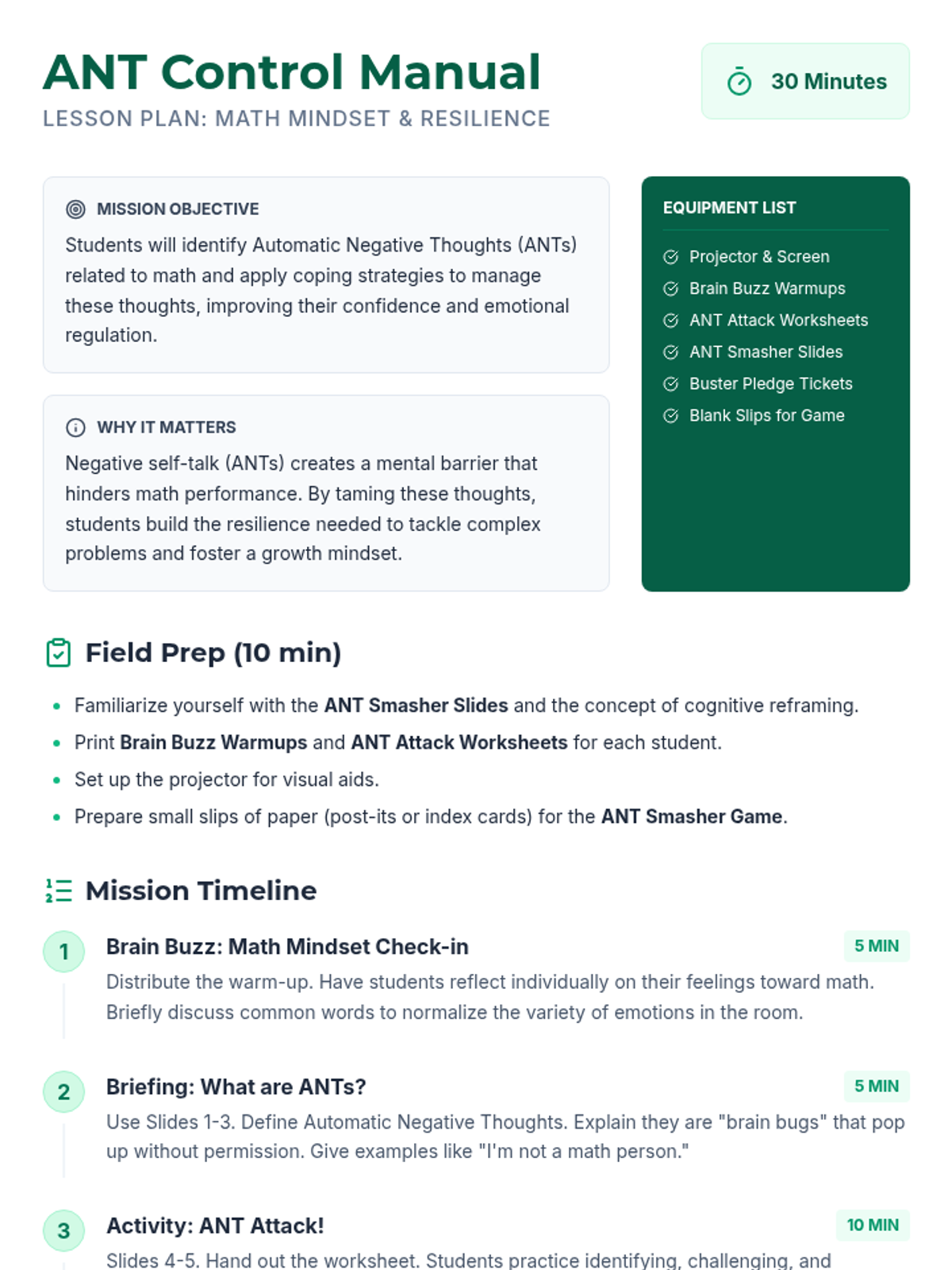 A 30-minute social-emotional learning lesson for 7th-grade math students to identify and challenge Automatic Negative Thoughts (ANTs) to build math resilience.