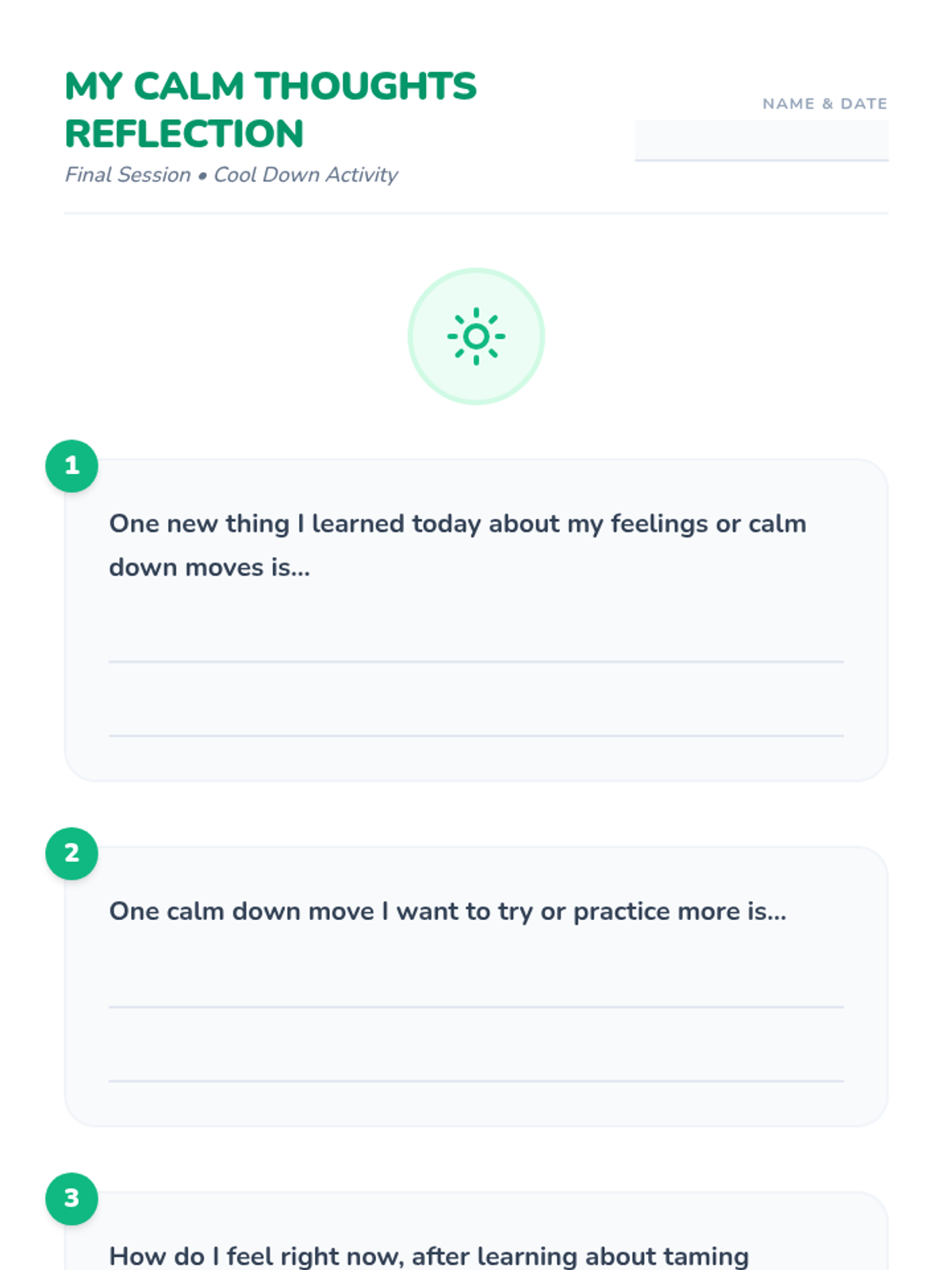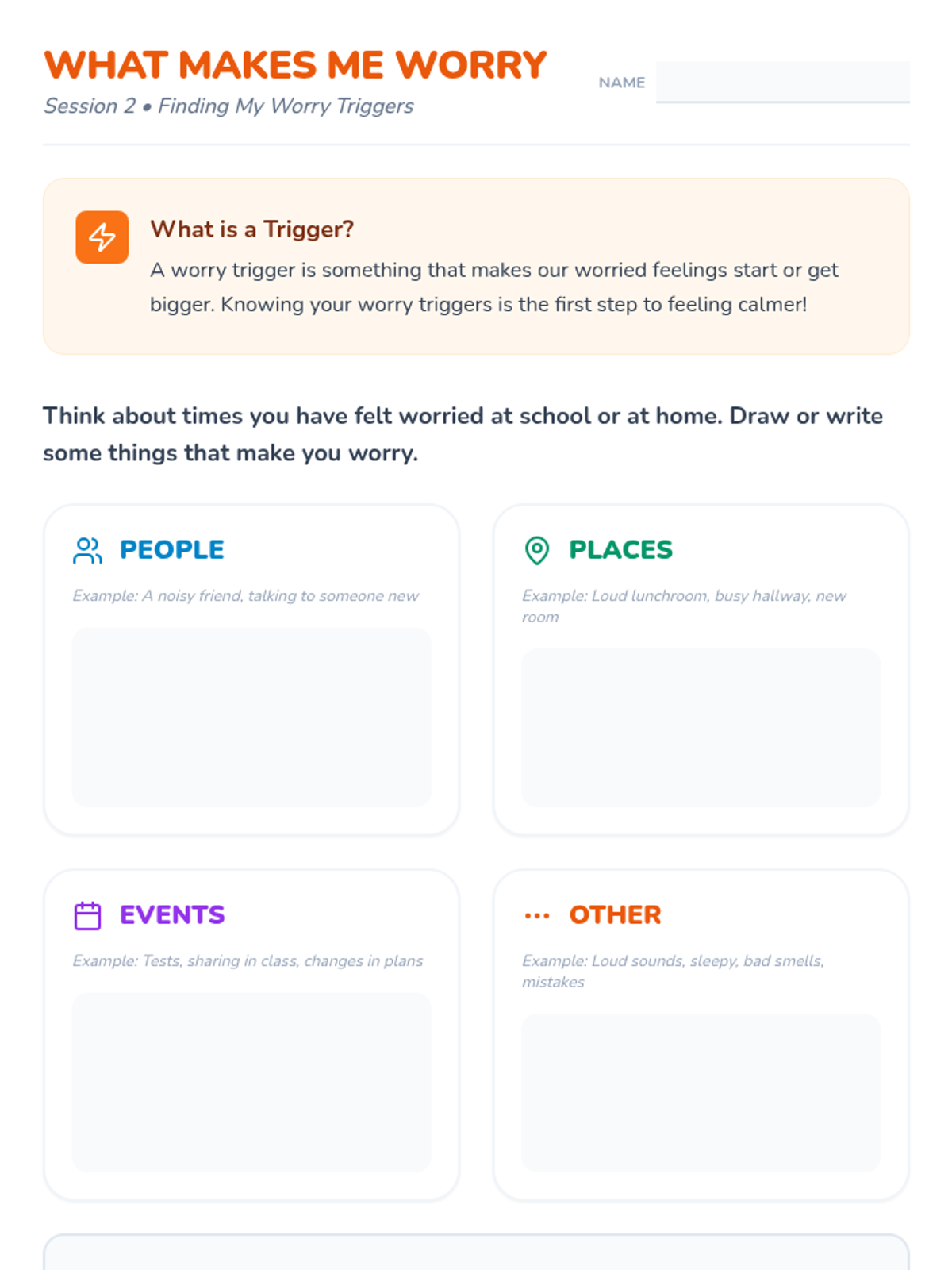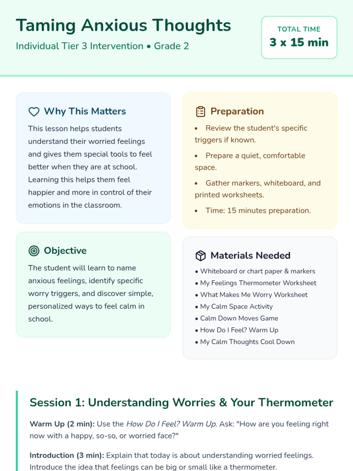 A three-session Tier 3 intervention for 2nd-grade students to identify anxious feelings, recognize triggers, and develop personalized coping strategies. This lesson uses a calm, supportive approach to empower students with social-emotional tools for the school environment.