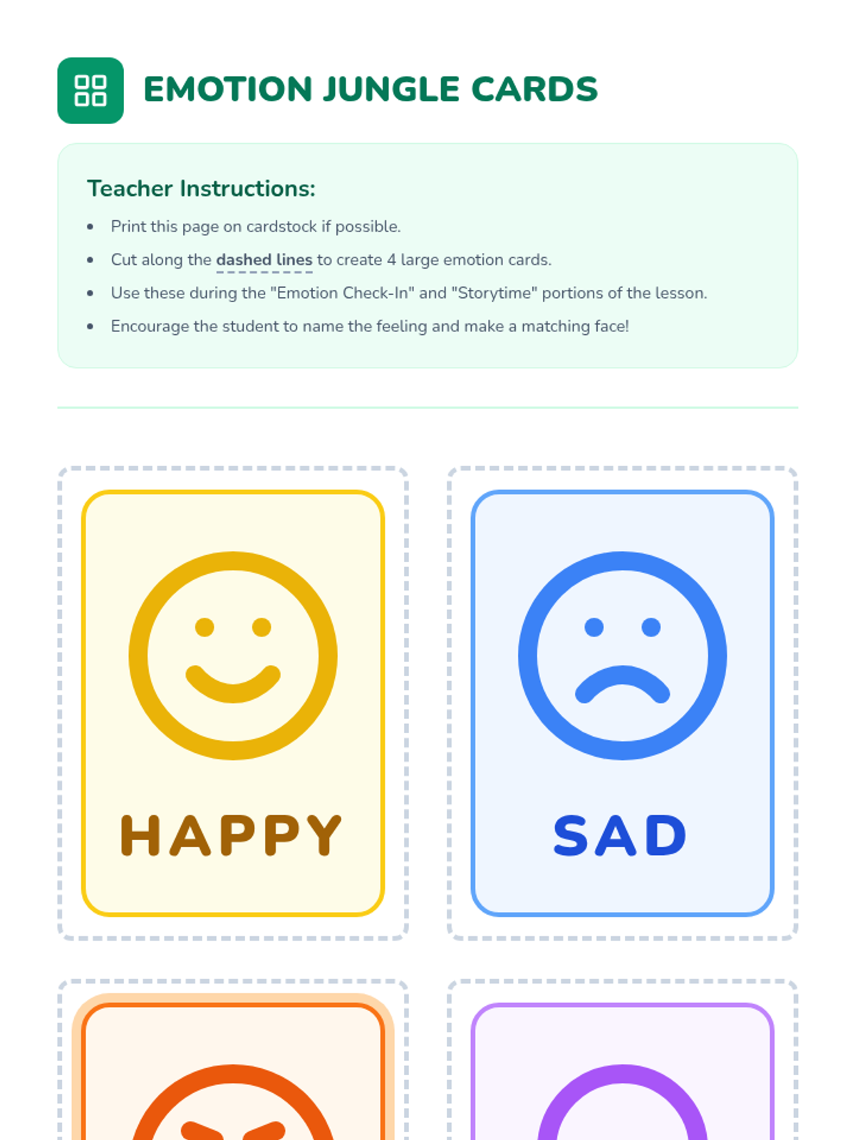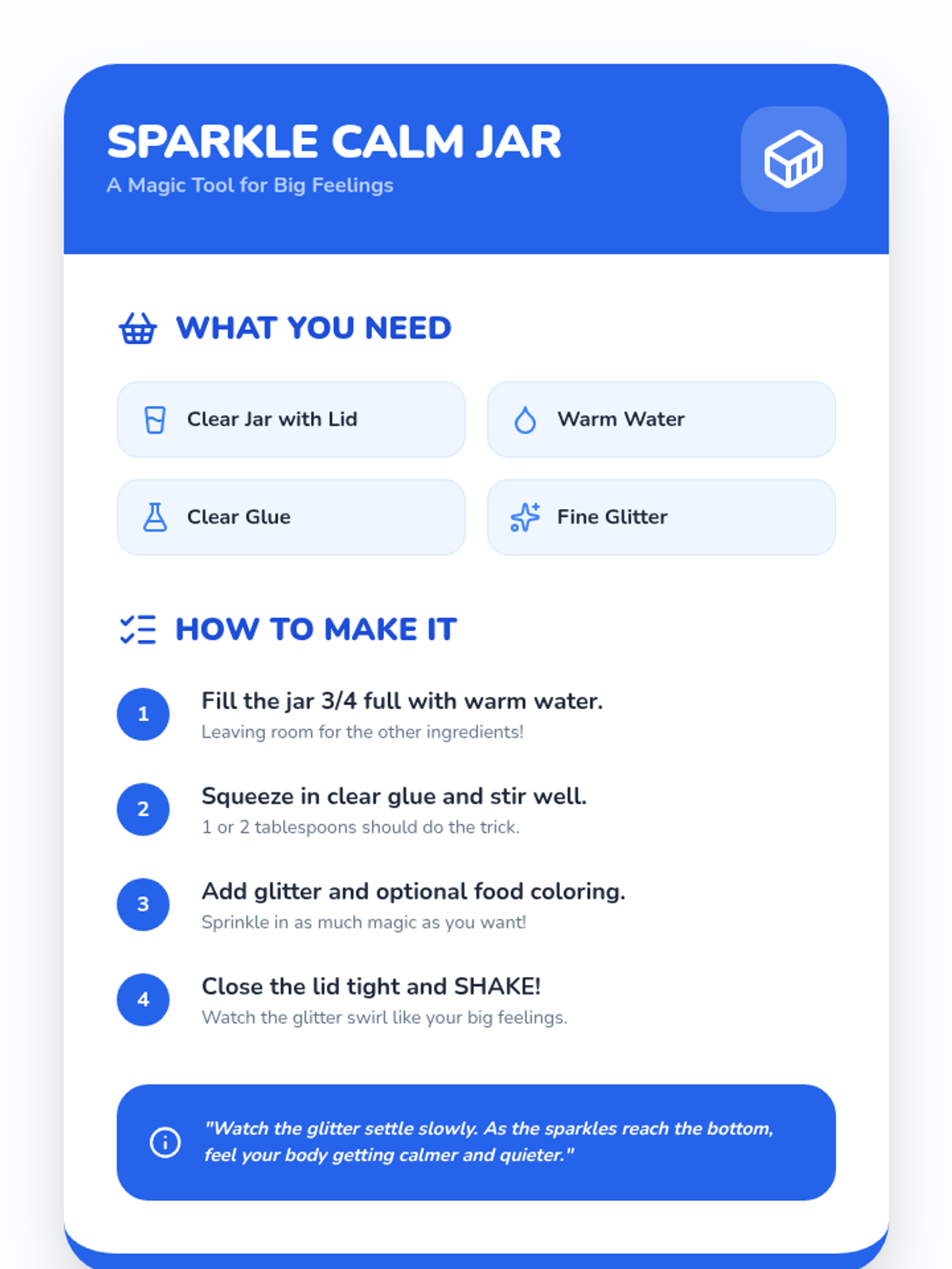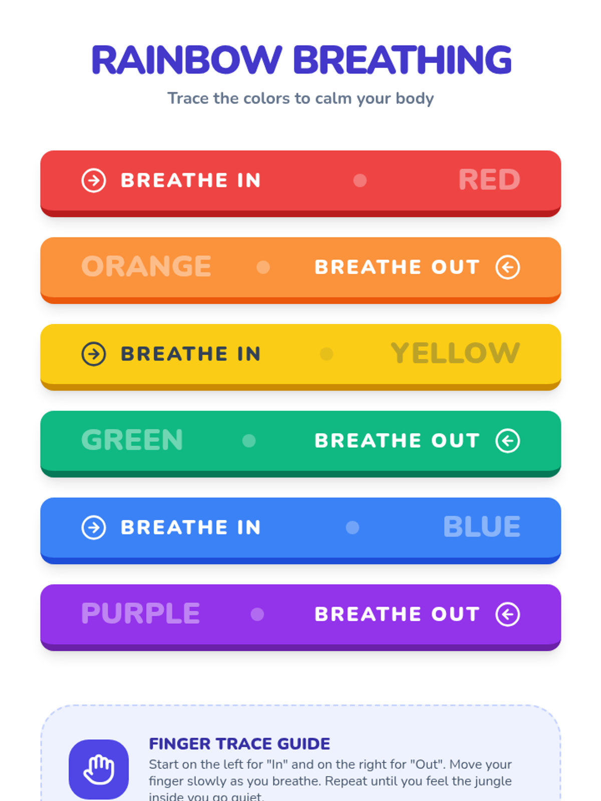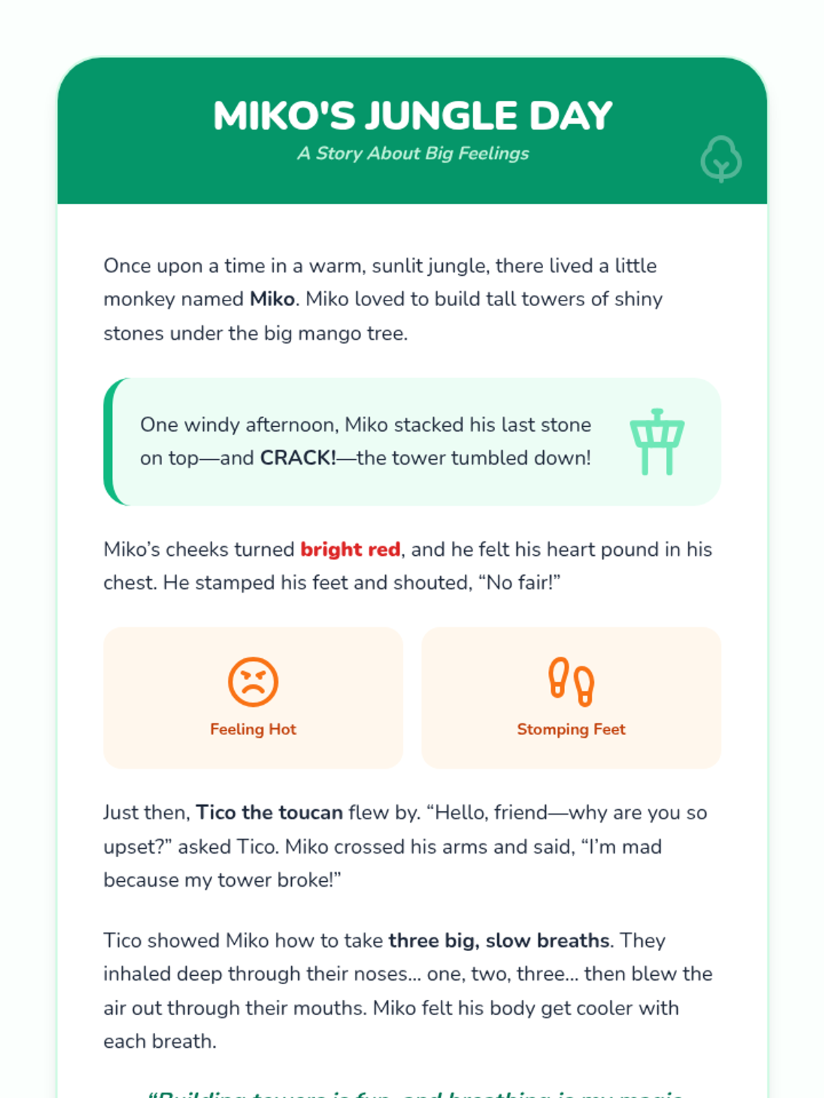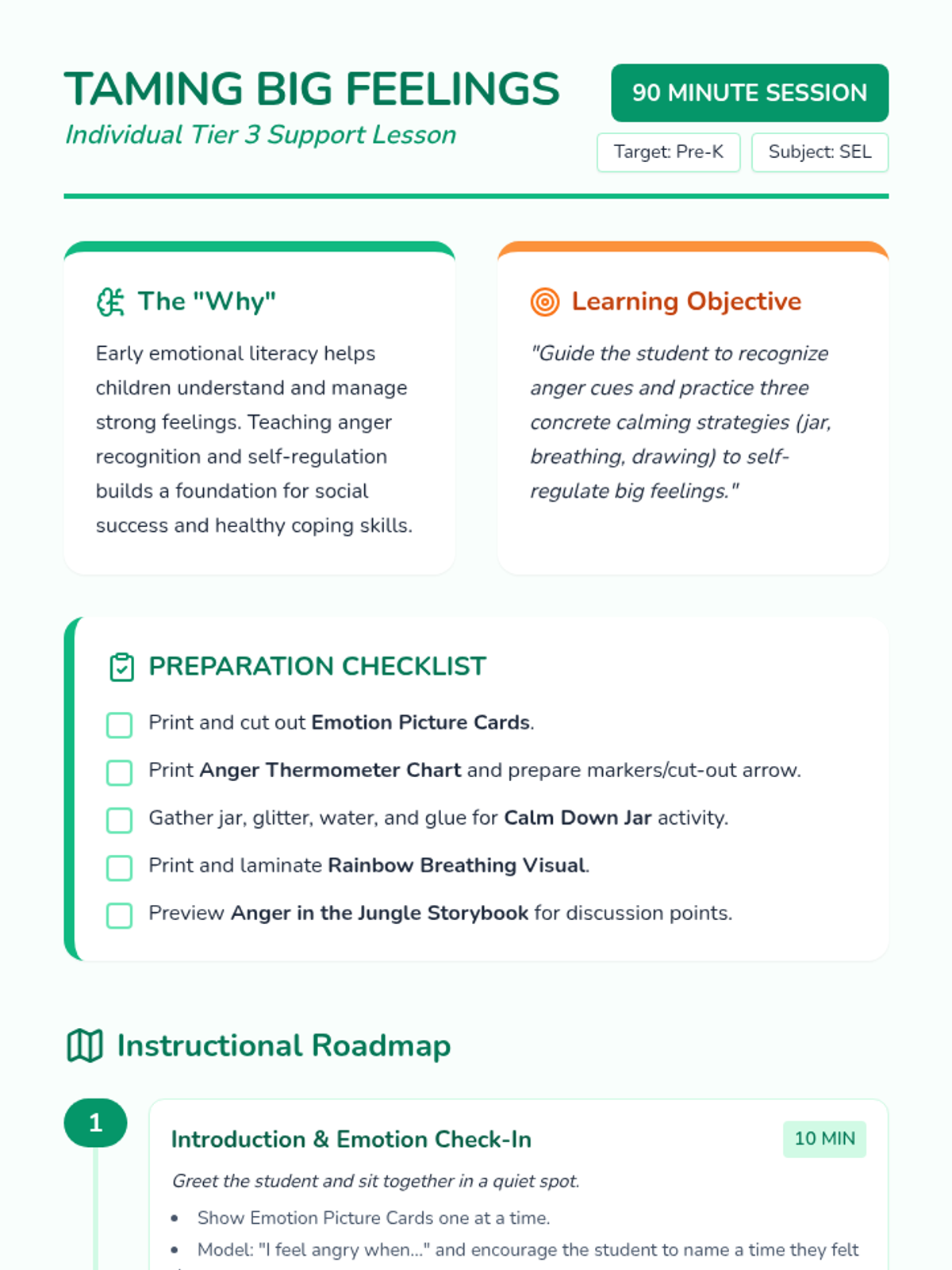A one-on-one session for Pre-K students to identify anger cues and learn three specific self-regulation tools: the calm-down jar, rainbow breathing, and reflection drawing.