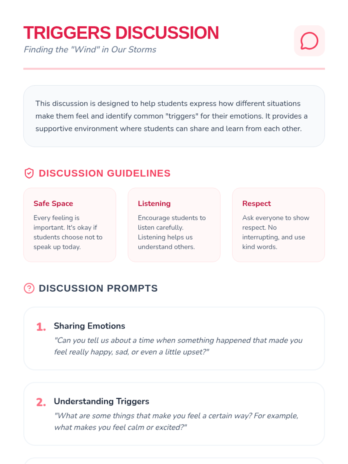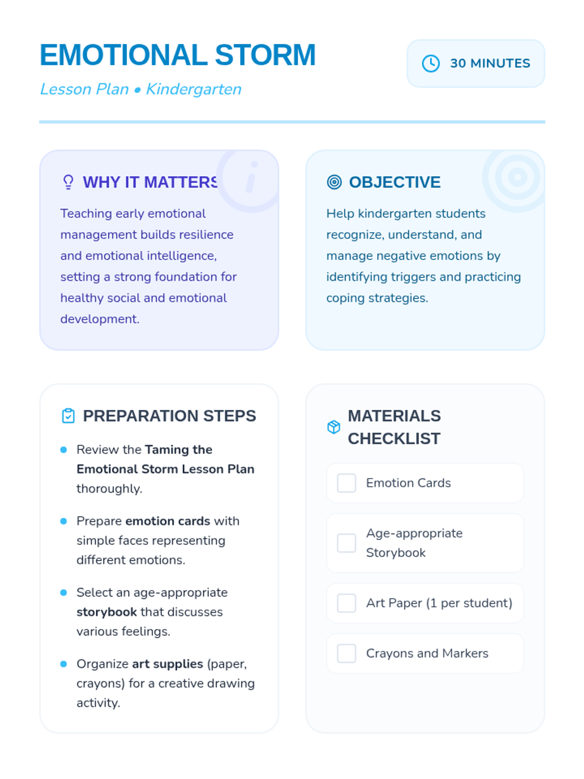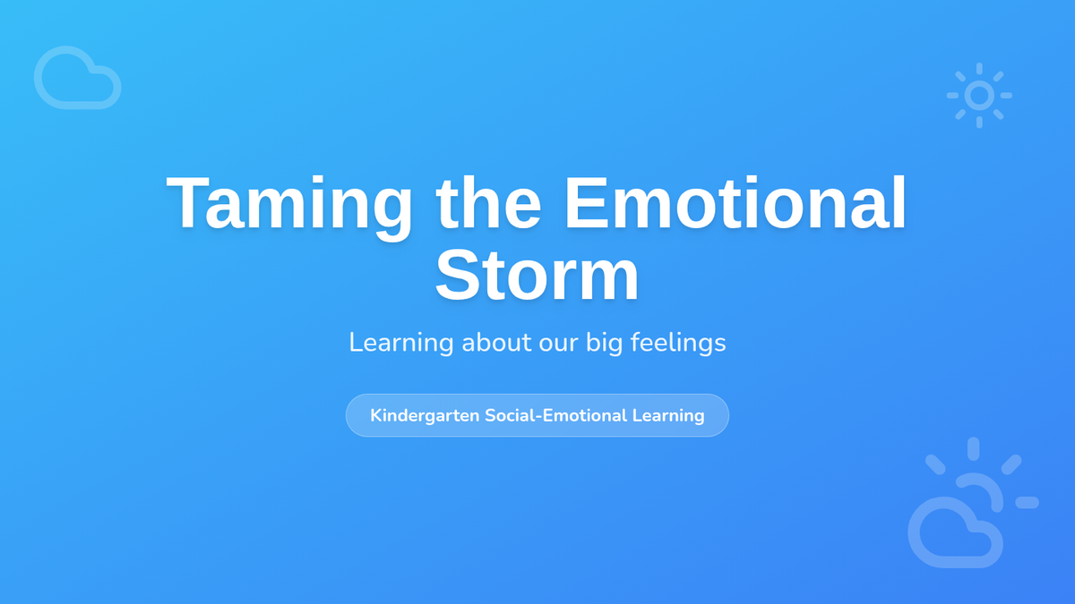 A foundational lesson for kindergarteners to identify, understand, and manage big feelings through the metaphor of an emotional storm. Students learn to recognize triggers and practice calming strategies through interactive play and discussion.
