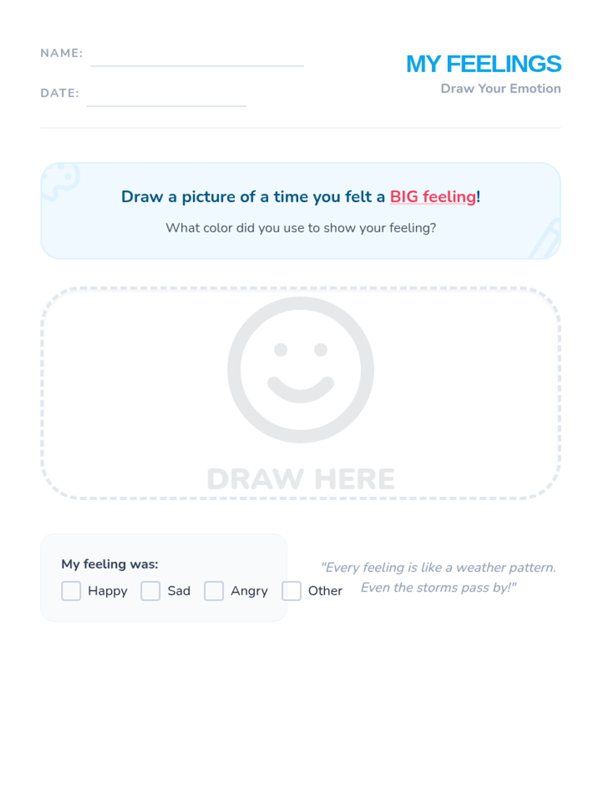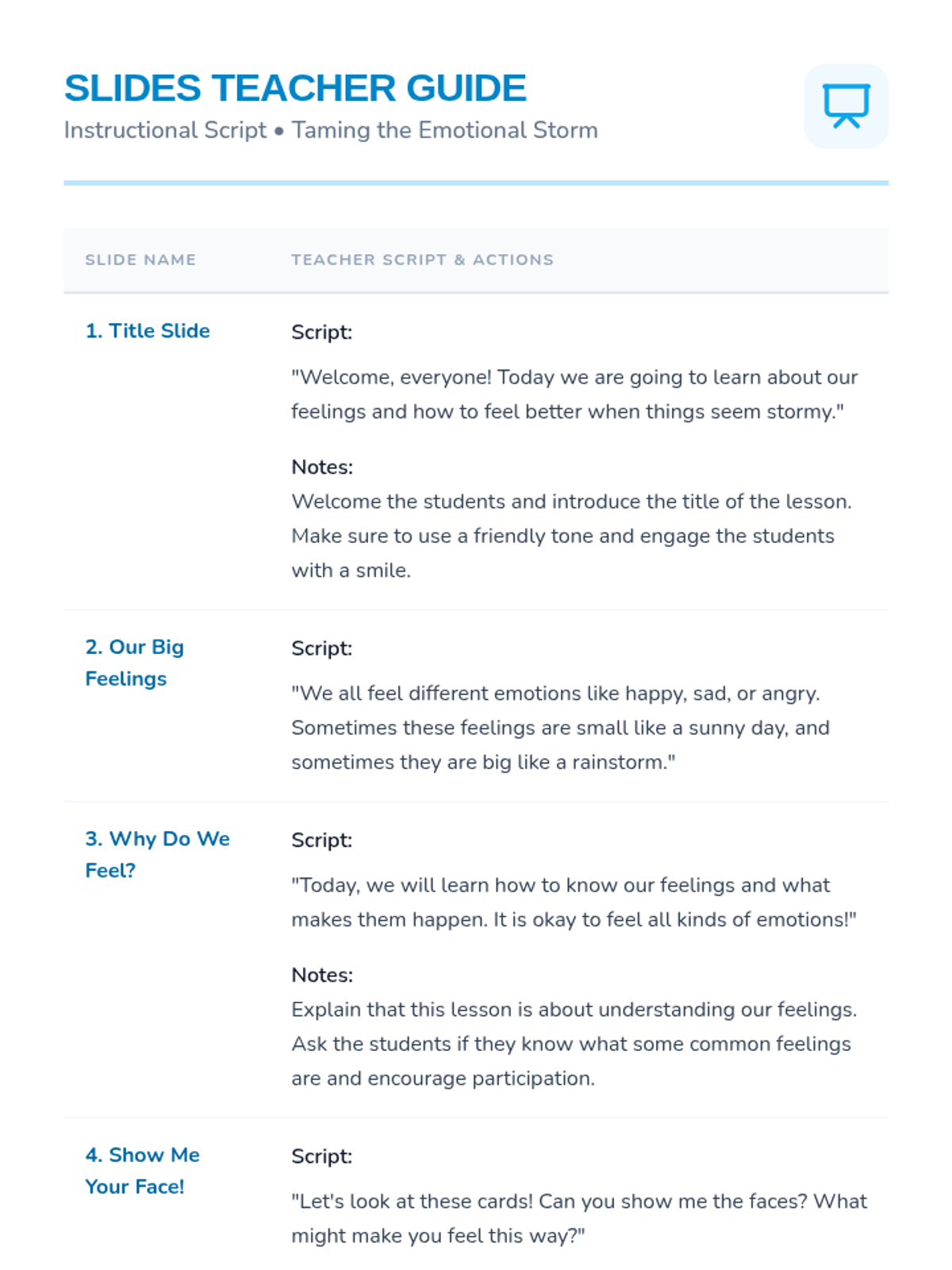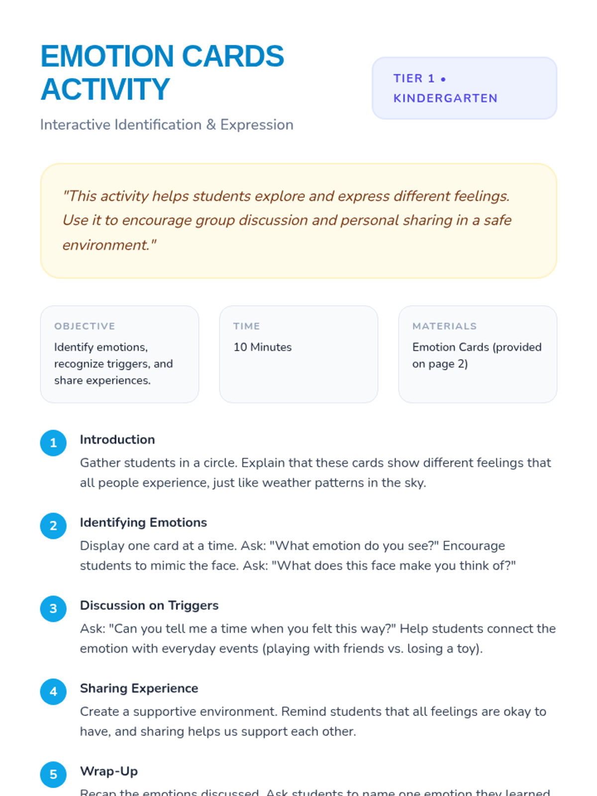 A foundational lesson for kindergarteners to identify, understand, and manage big feelings through the metaphor of an emotional storm. Students learn to recognize triggers and practice calming strategies through interactive play and discussion.
