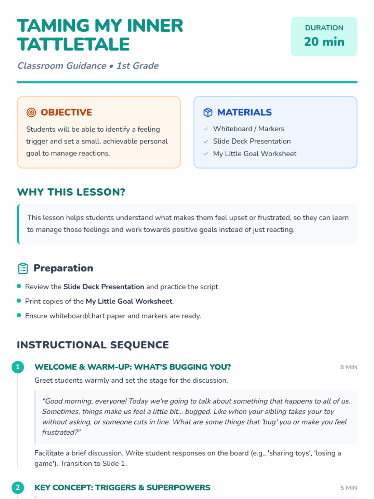 A 20-minute SEL lesson for 1st graders to identify emotional triggers and develop self-control strategies through goal setting.