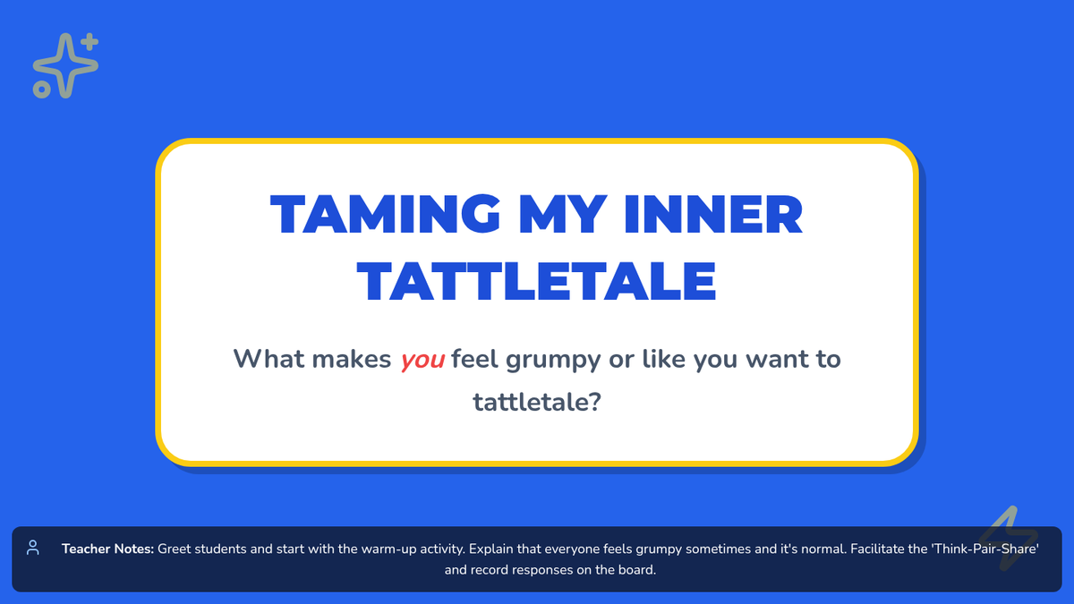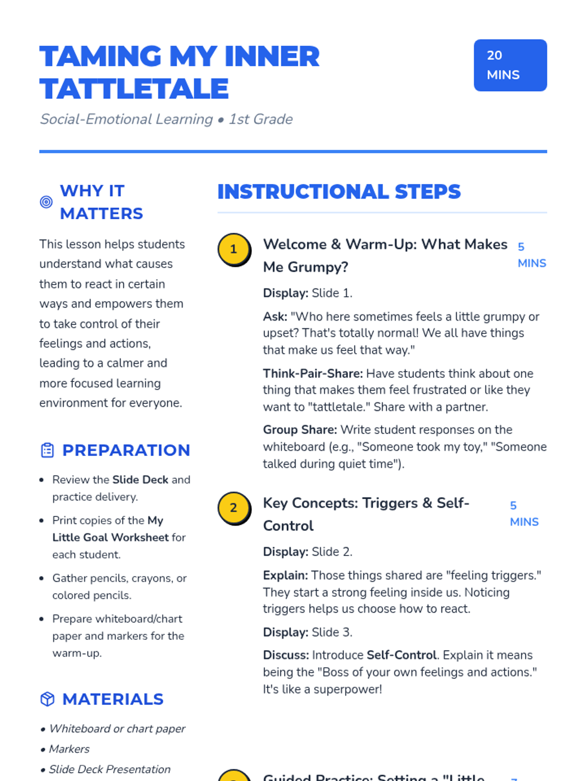 A single-session lesson for 1st-grade students focused on identifying emotional triggers, practicing self-control, and setting small personal goals to manage the urge to tattletale.