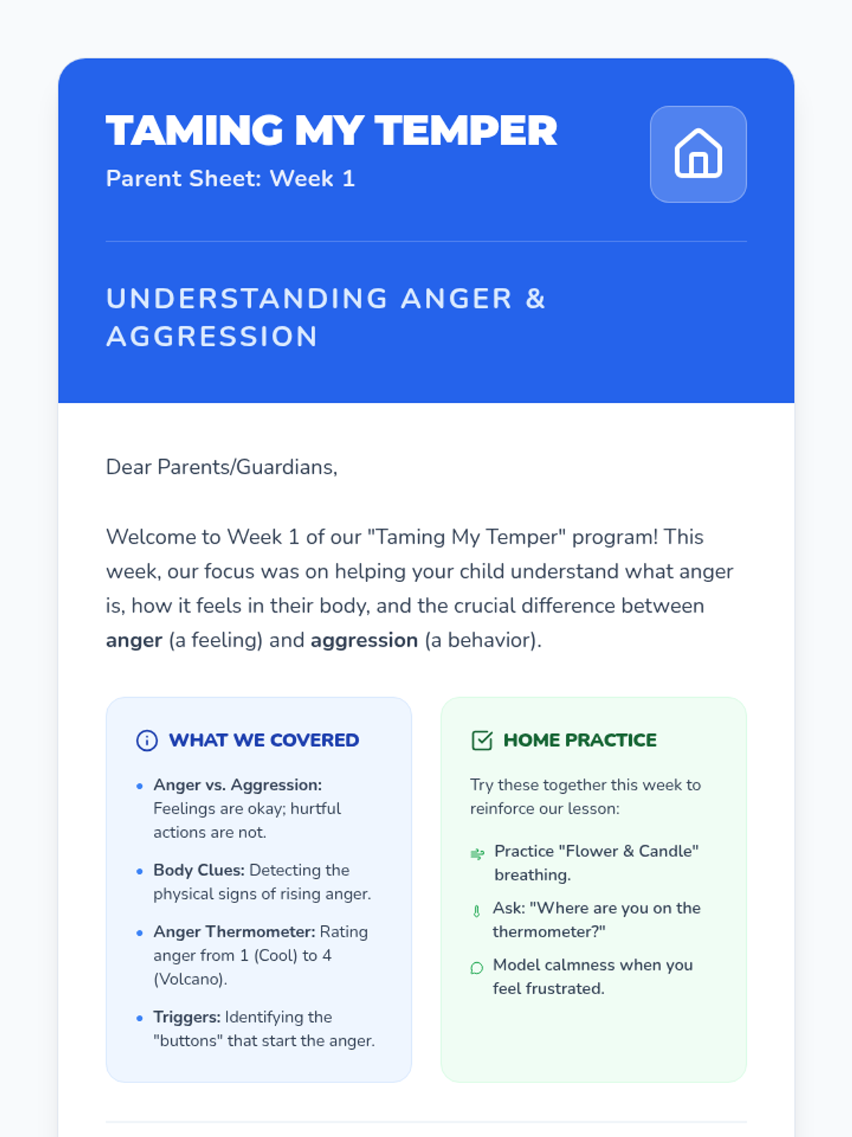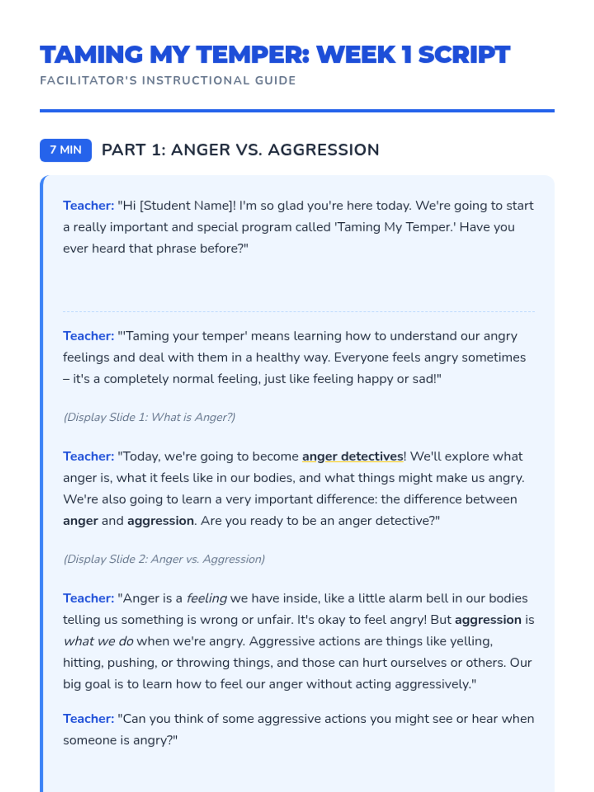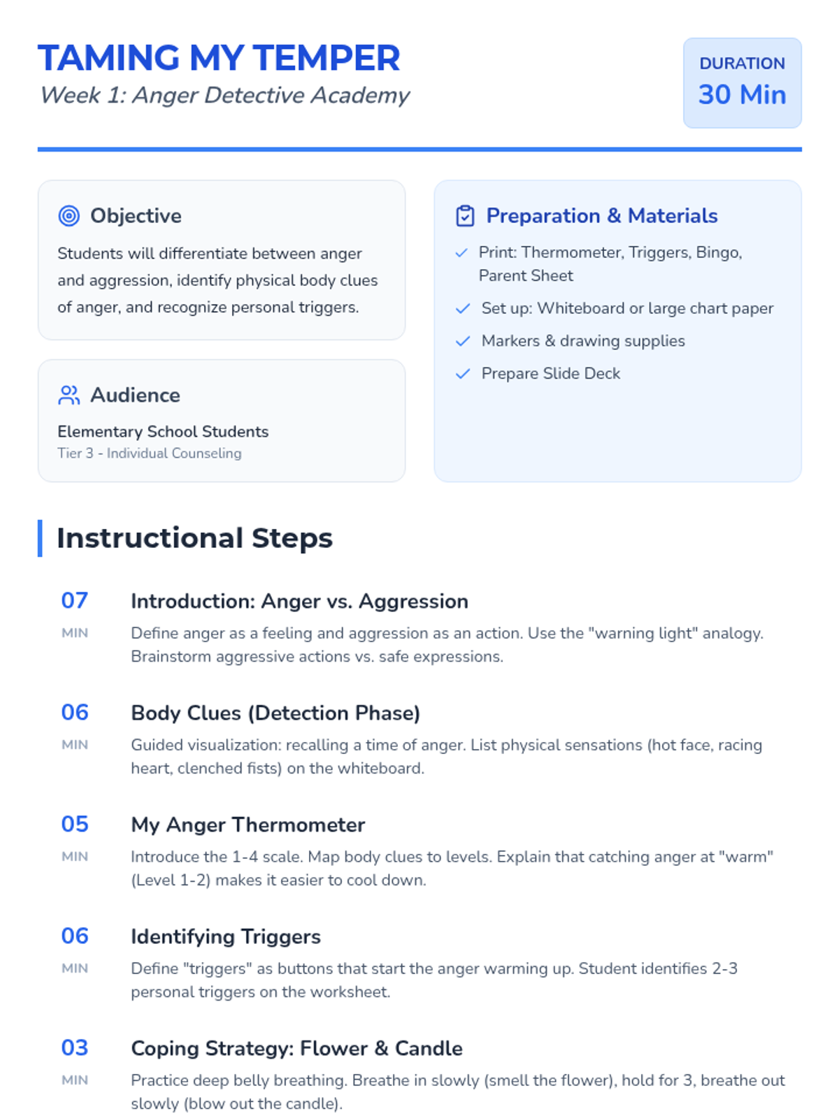 The first session in a Tier 3 individual anger management program for elementary students, focusing on differentiating between anger and aggression, identifying body clues and triggers, and learning a deep breathing strategy.