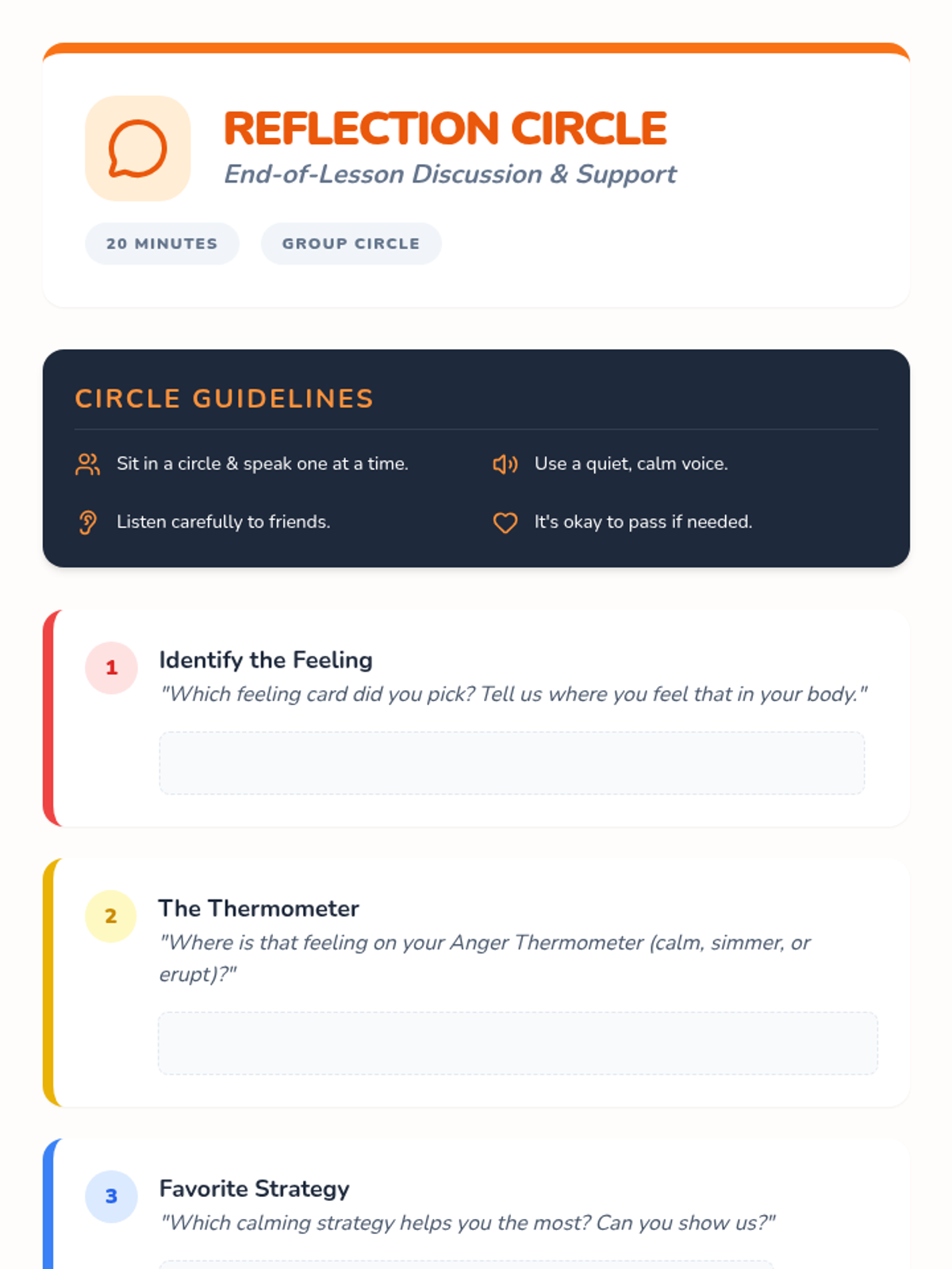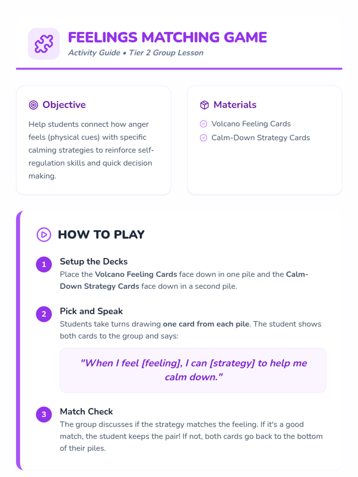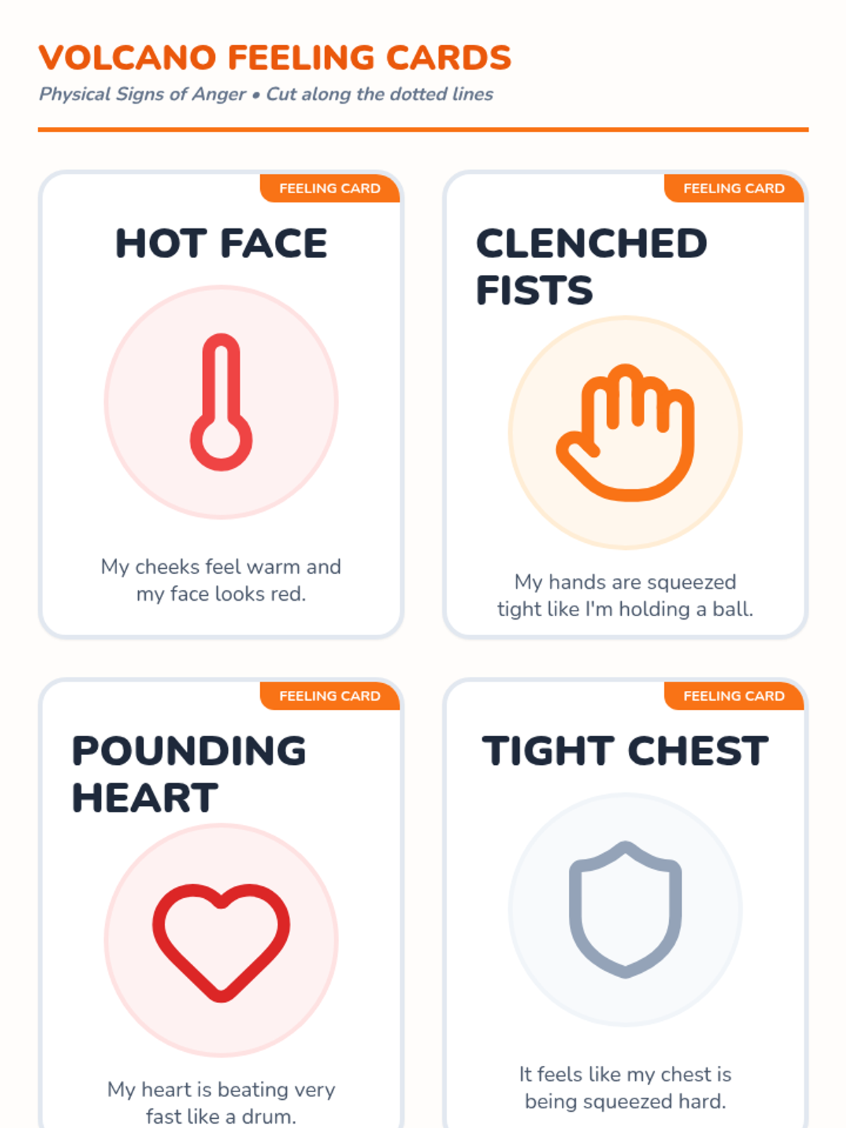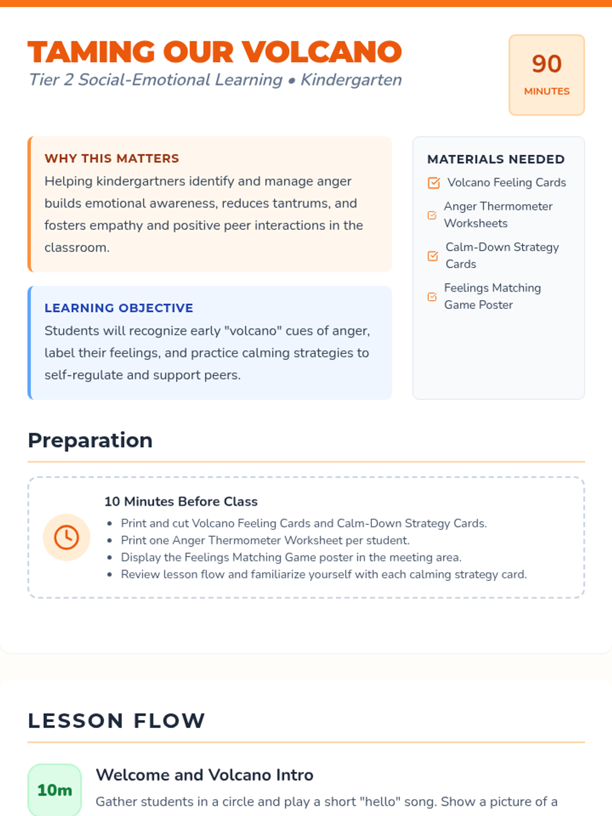 A 90-minute Tier 2 social-emotional learning lesson for kindergarteners focused on identifying anger cues and practicing self-regulation through a volcano metaphor.
