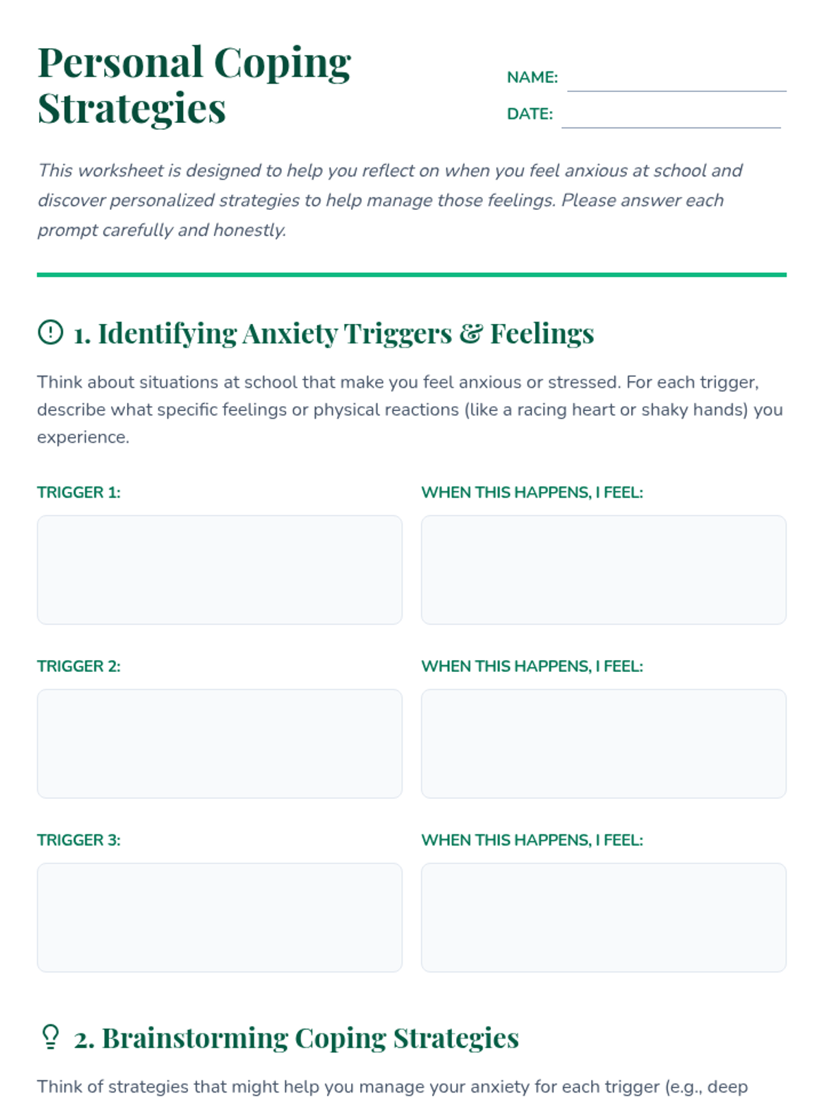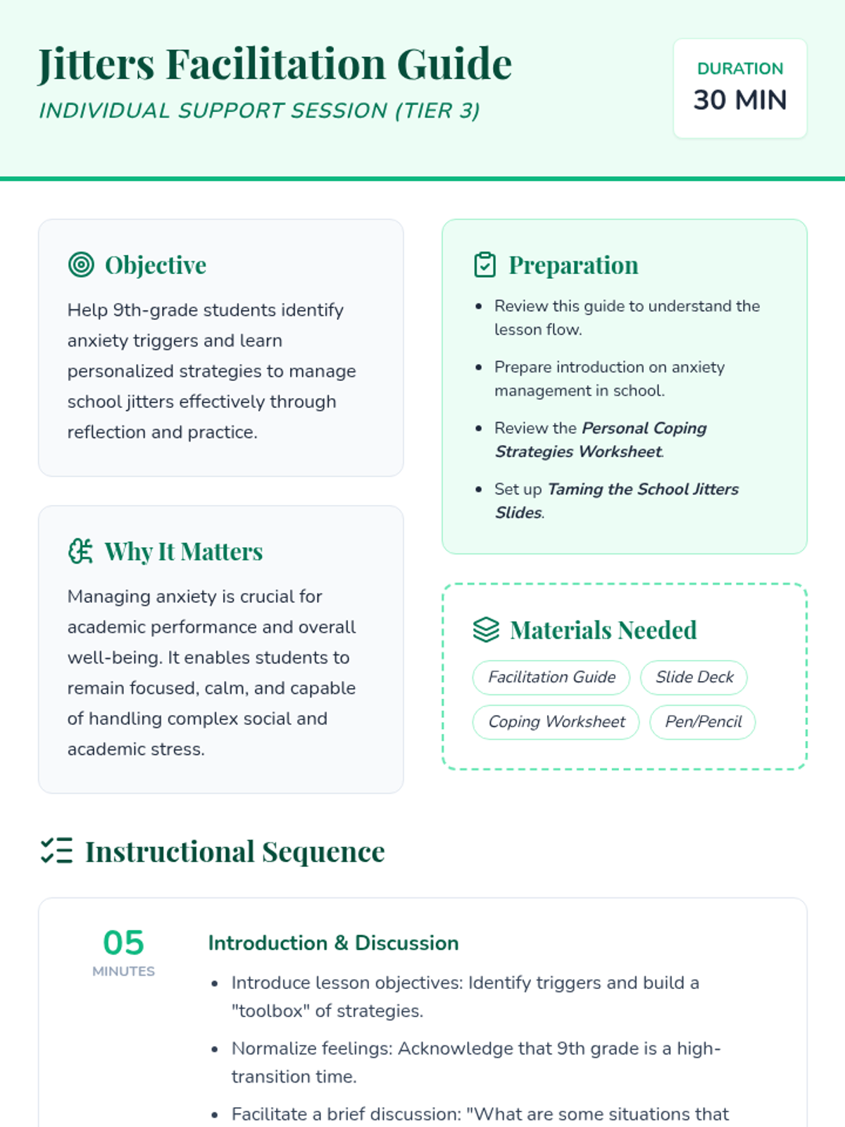 A 30-minute Tier 3 individual support session for 9th graders to identify anxiety triggers and develop personalized coping strategies for school stress.