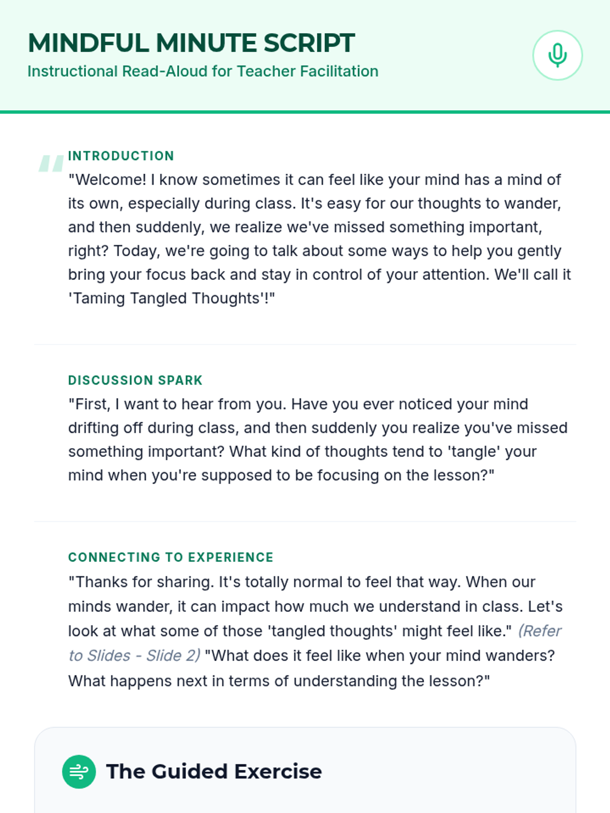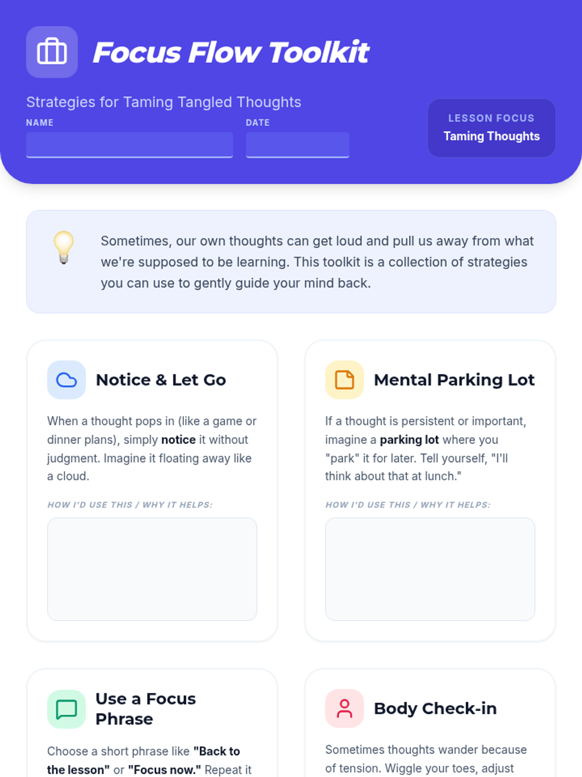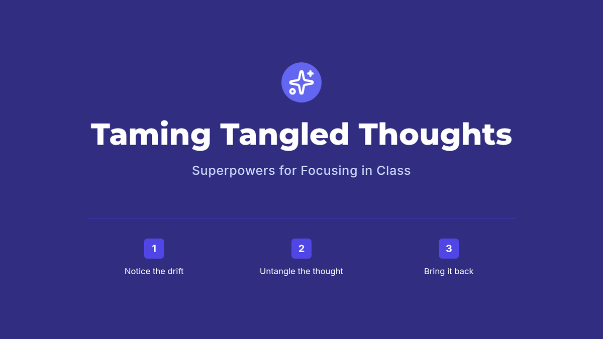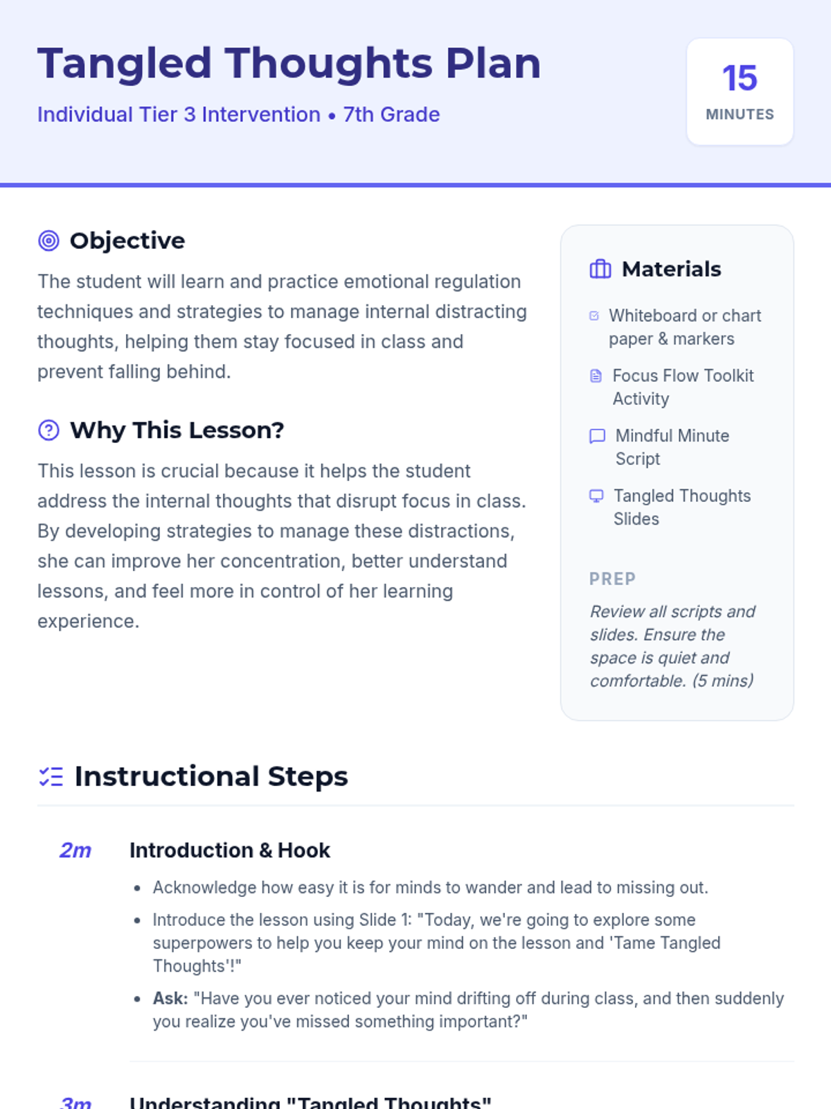 An individual 15-minute Tier 3 intervention for 7th-grade students focused on managing internal distractions and 'tangled thoughts' to improve focus and emotional regulation during class.